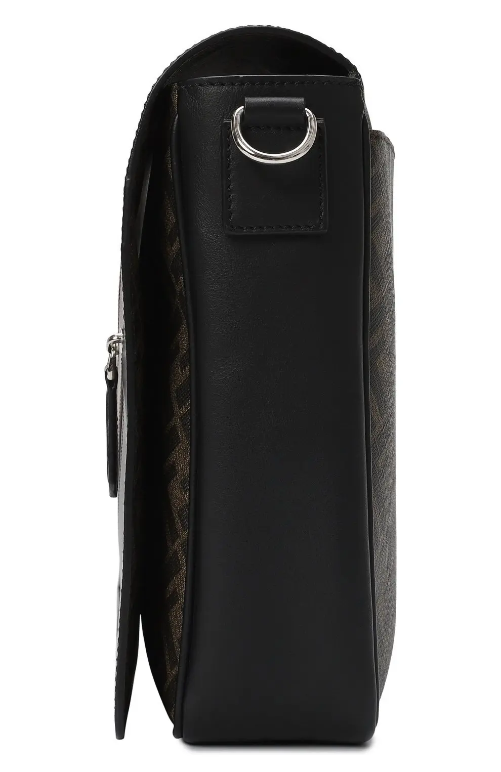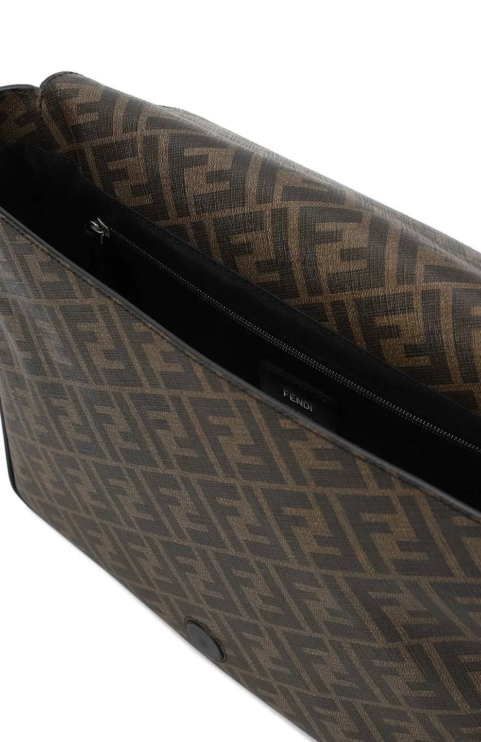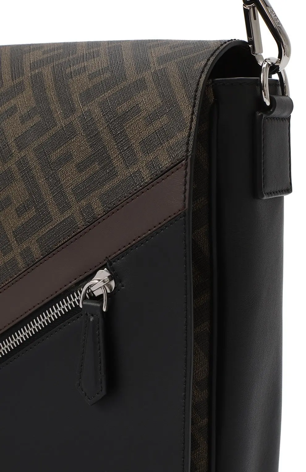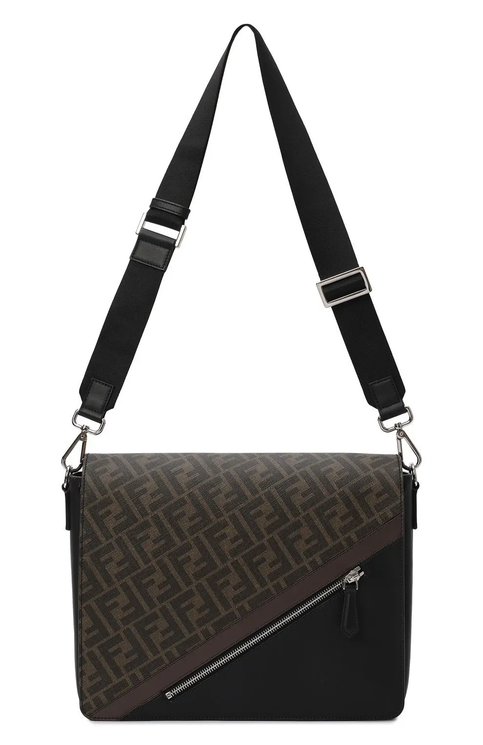 Сумка FF Print от Fendi выполнена из гладкой кожи и канвы с культовым мотивом FF. Модель с клапаном дополнена диагональной молнией и регулируемым текстильным ремнем, что делает её удобным выбором для динамичного ритма города.