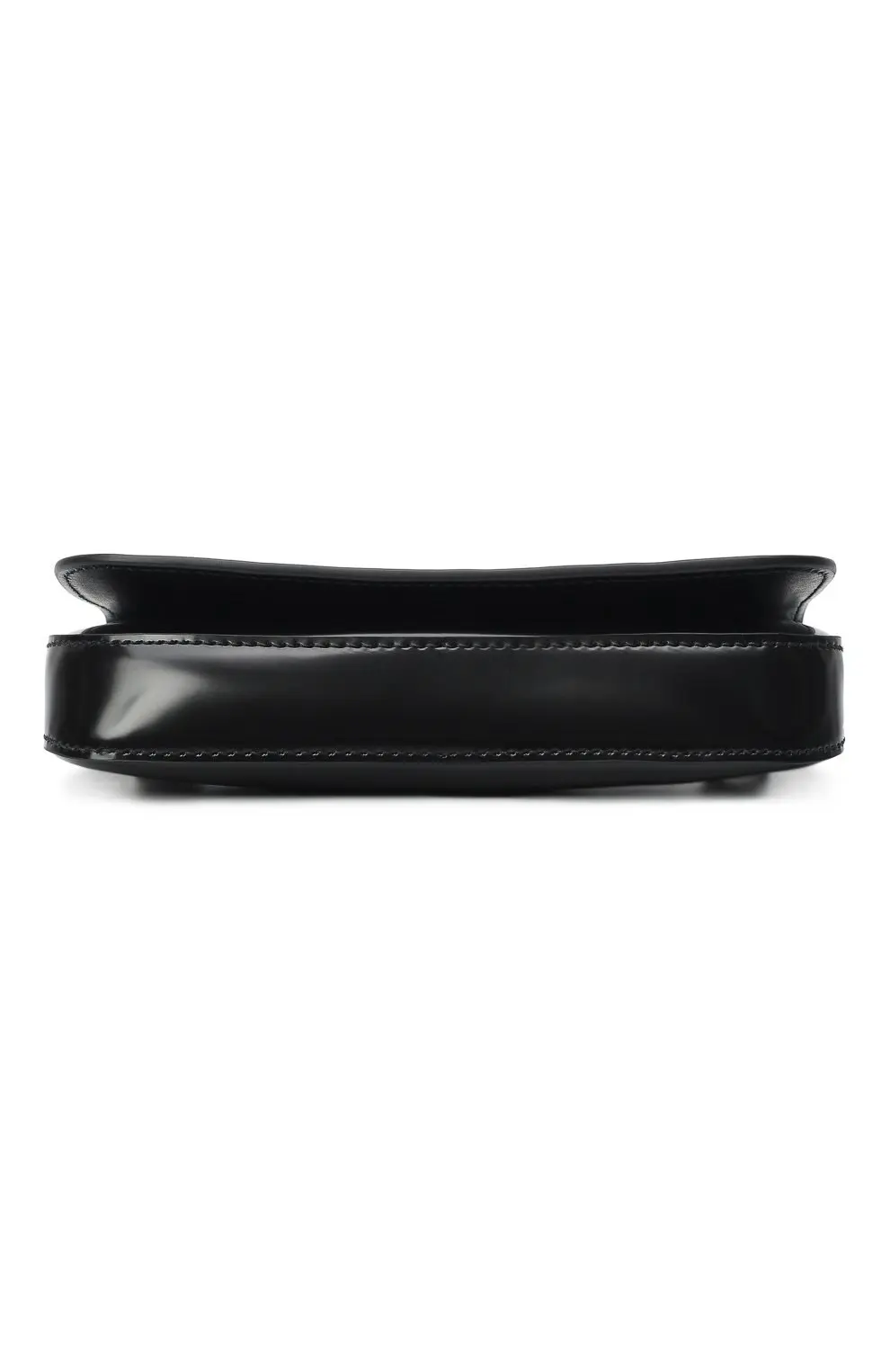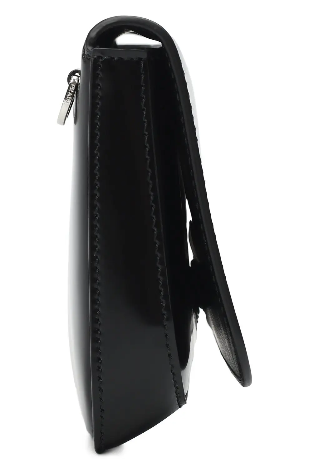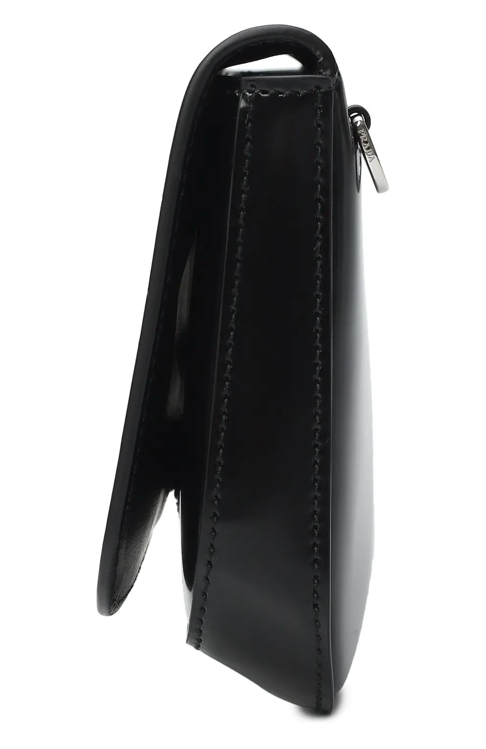 Сумка Prada чёрного цвета выполнена из гладкой полированной кожи с лёгким блеском. Лаконичный силуэт подчеркнут фирменным металлическим логотипом Prada Milano на передней панели. Модель сочетает строгую элегантность и современный минимализм, идеально подходя для вечерних и повседневных образов.