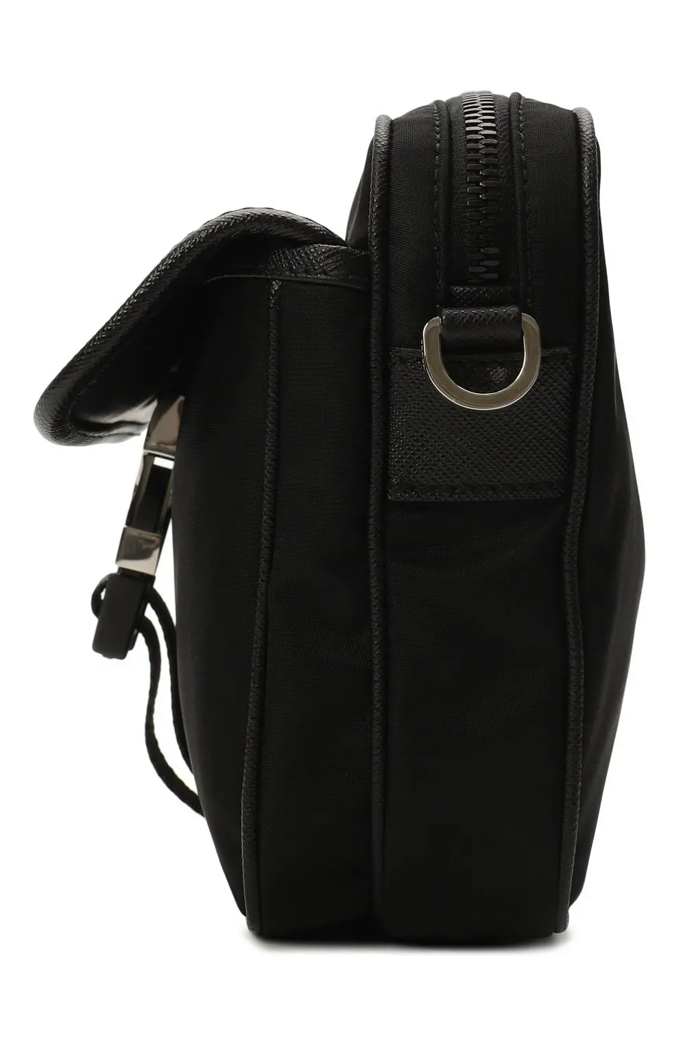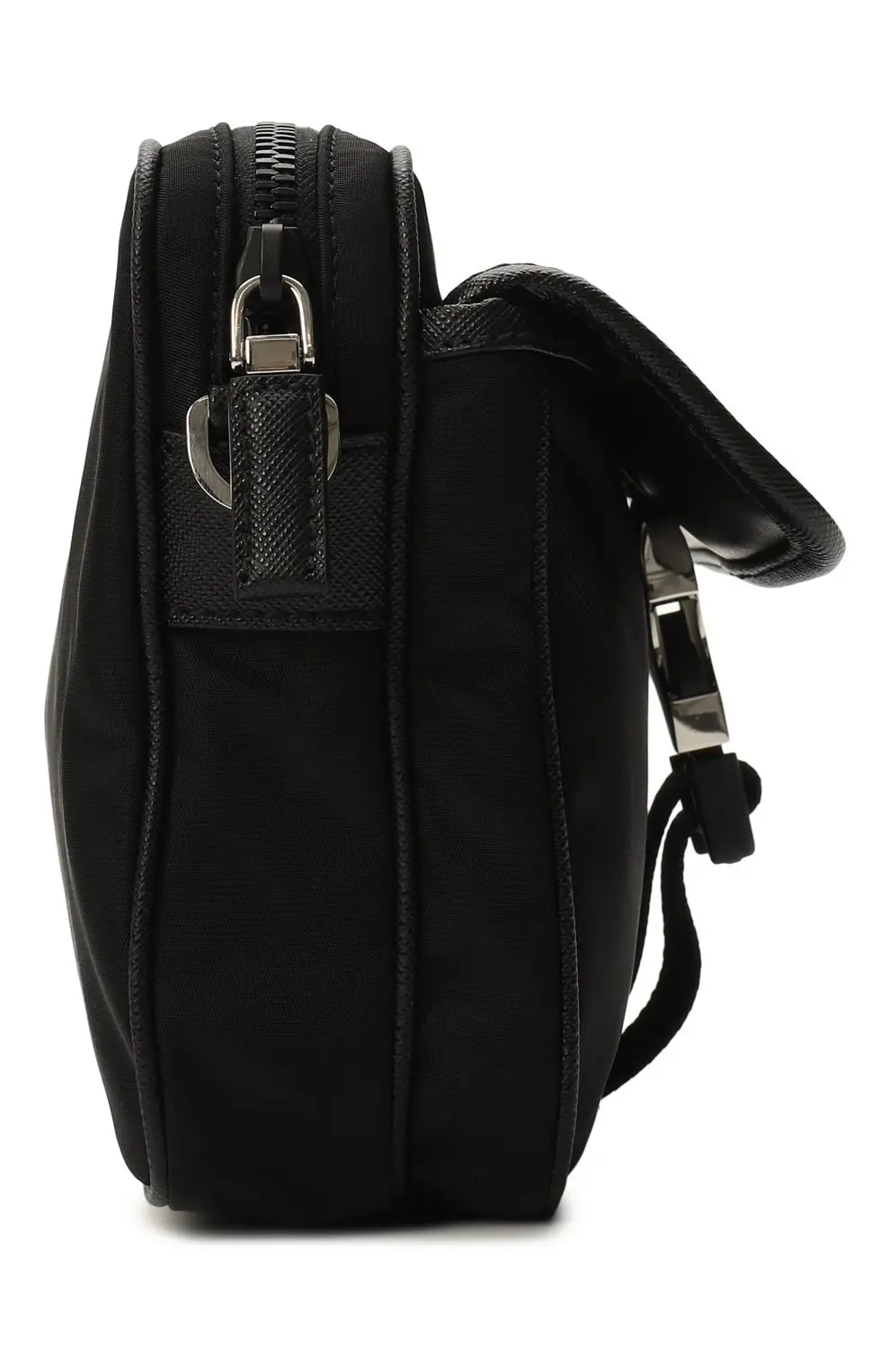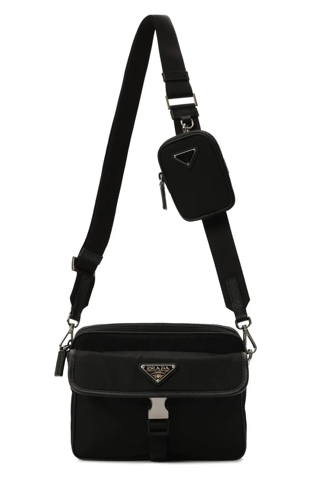 Сумка Prada чёрного цвета выполнена из прочного нейлона — фирменного материала бренда. Аксессуар оформлен клапаном с металлической пряжкой и треугольным логотипом Prada Milano. Практичный дизайн с вместительным основным отделением делает модель идеальной для повседневного использования.