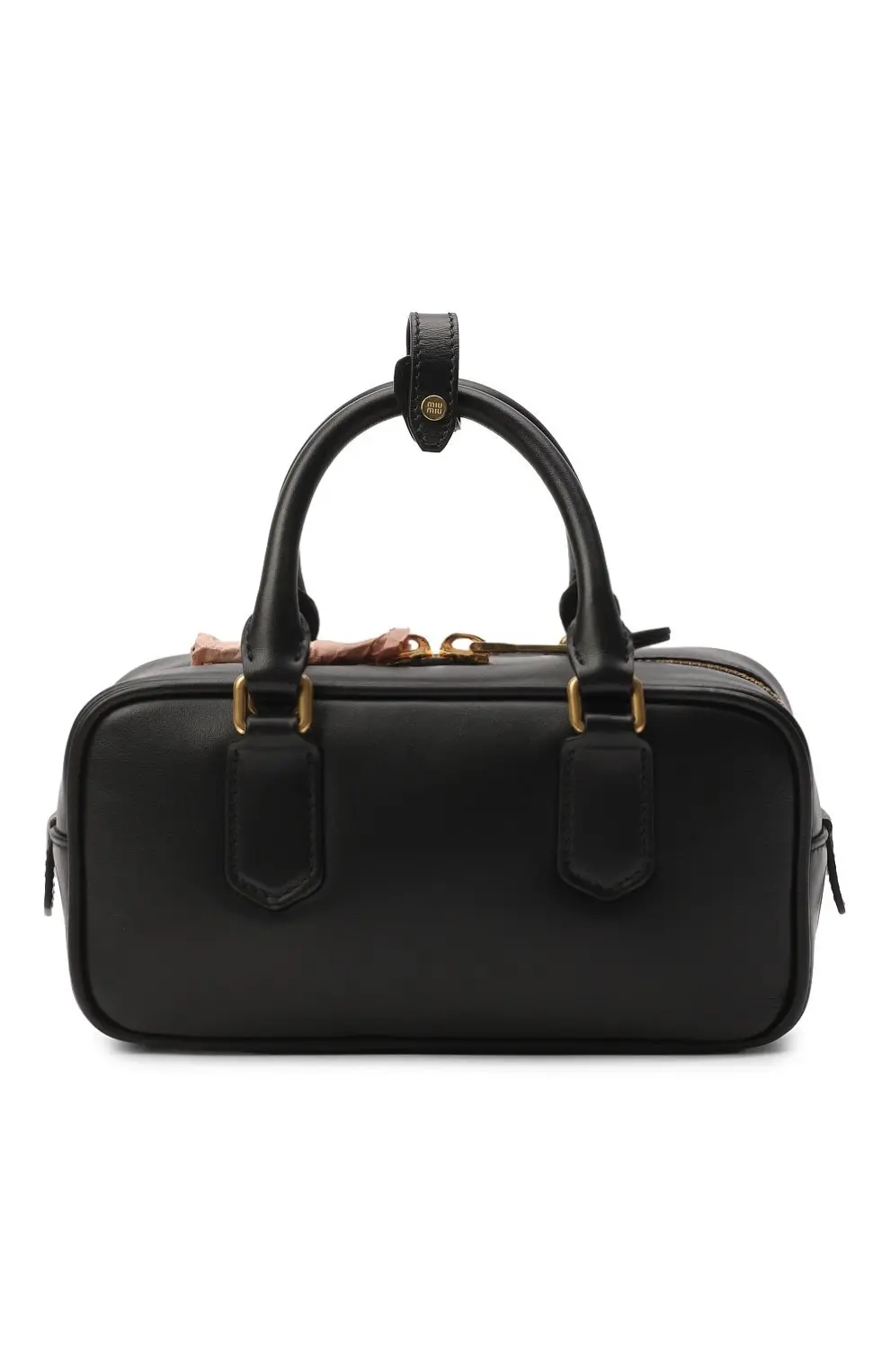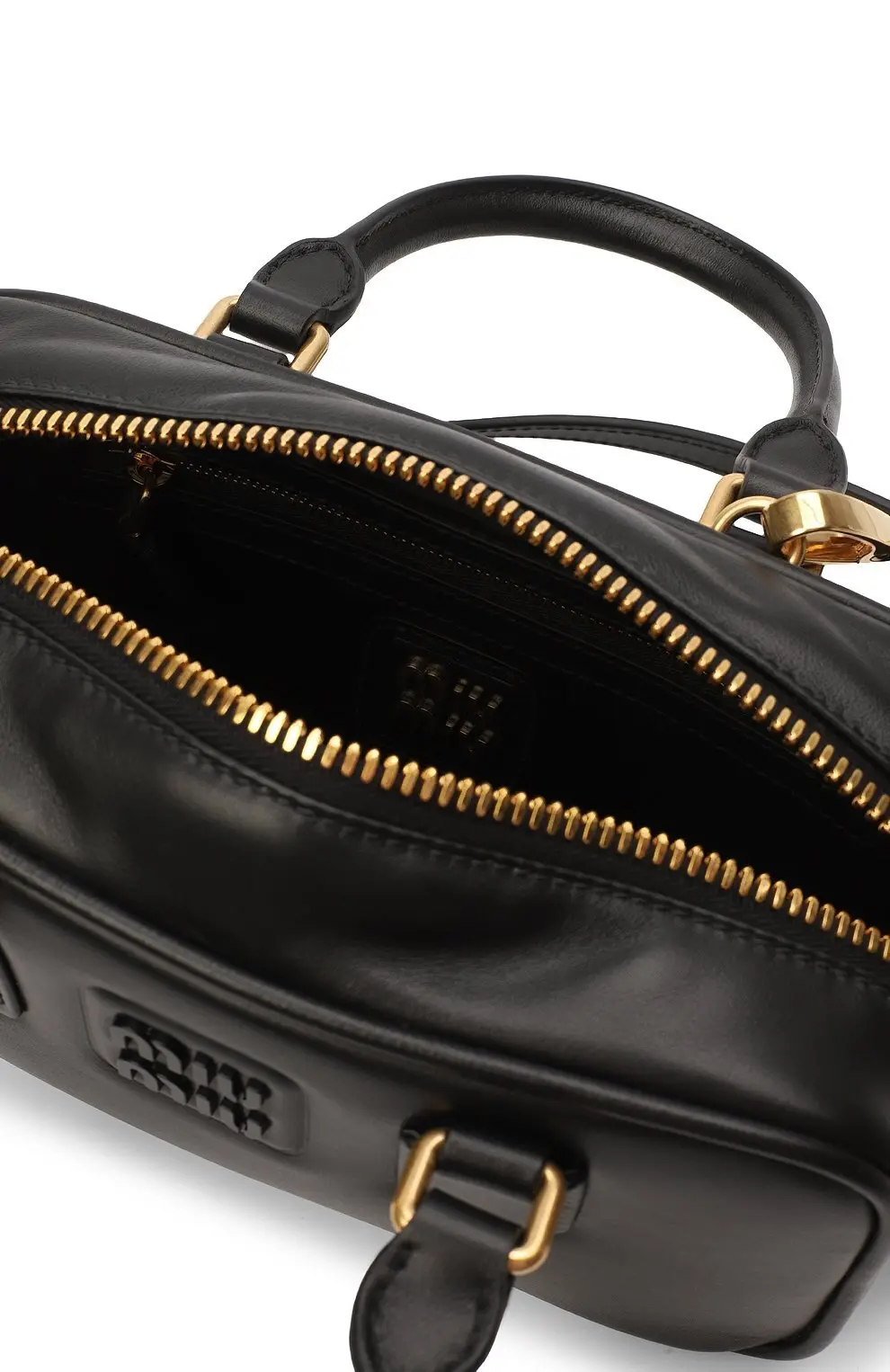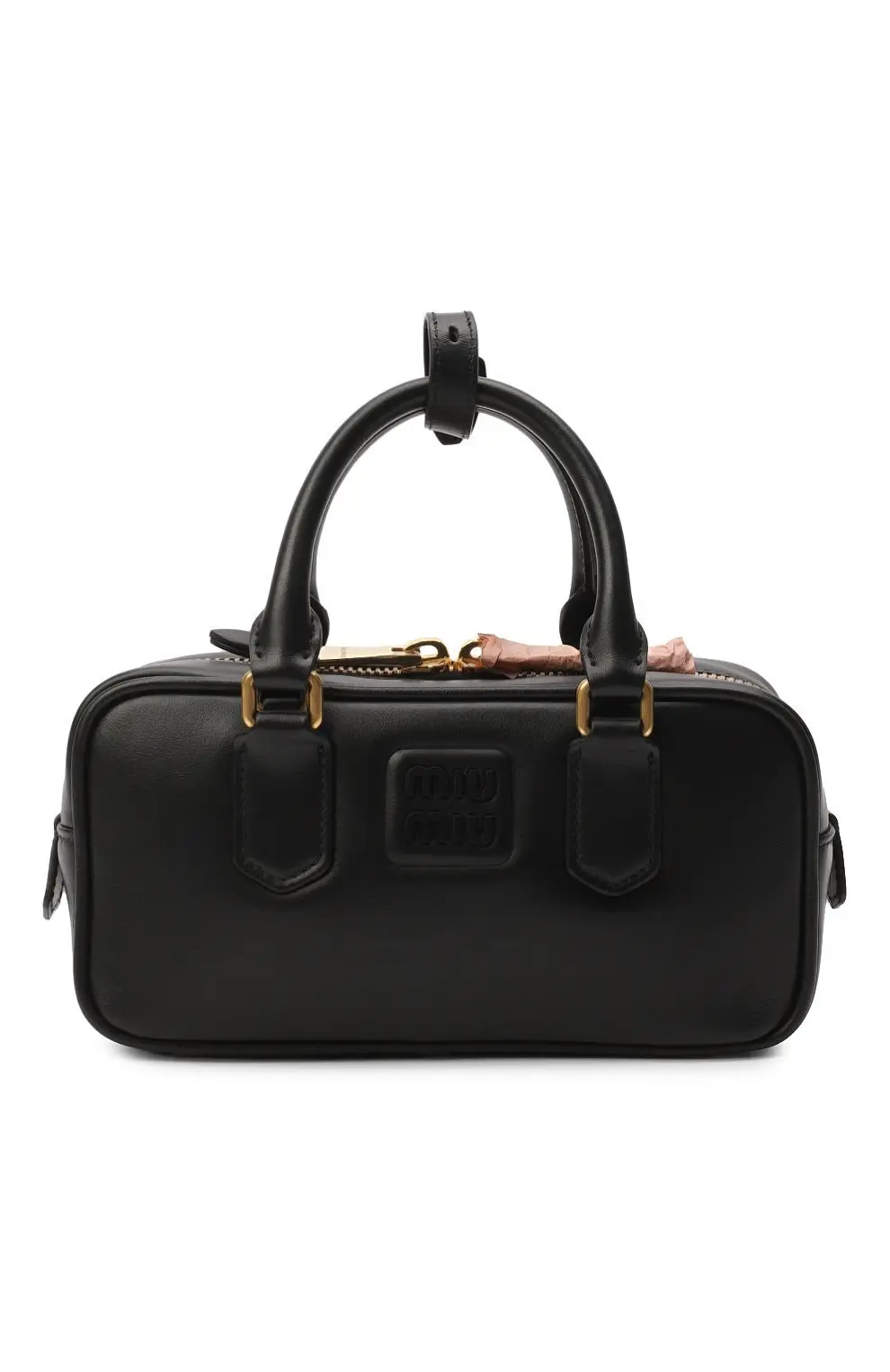 Сумка Arcadie Miu Miu из гладкой чёрной кожи. Прямоугольная форма с жёстким каркасом подчёркивает лаконичный силуэт, а короткие ручки и тиснённый логотип придают модели современный вид. Золотистая фурнитура завершает дизайн, добавляя утончённости.