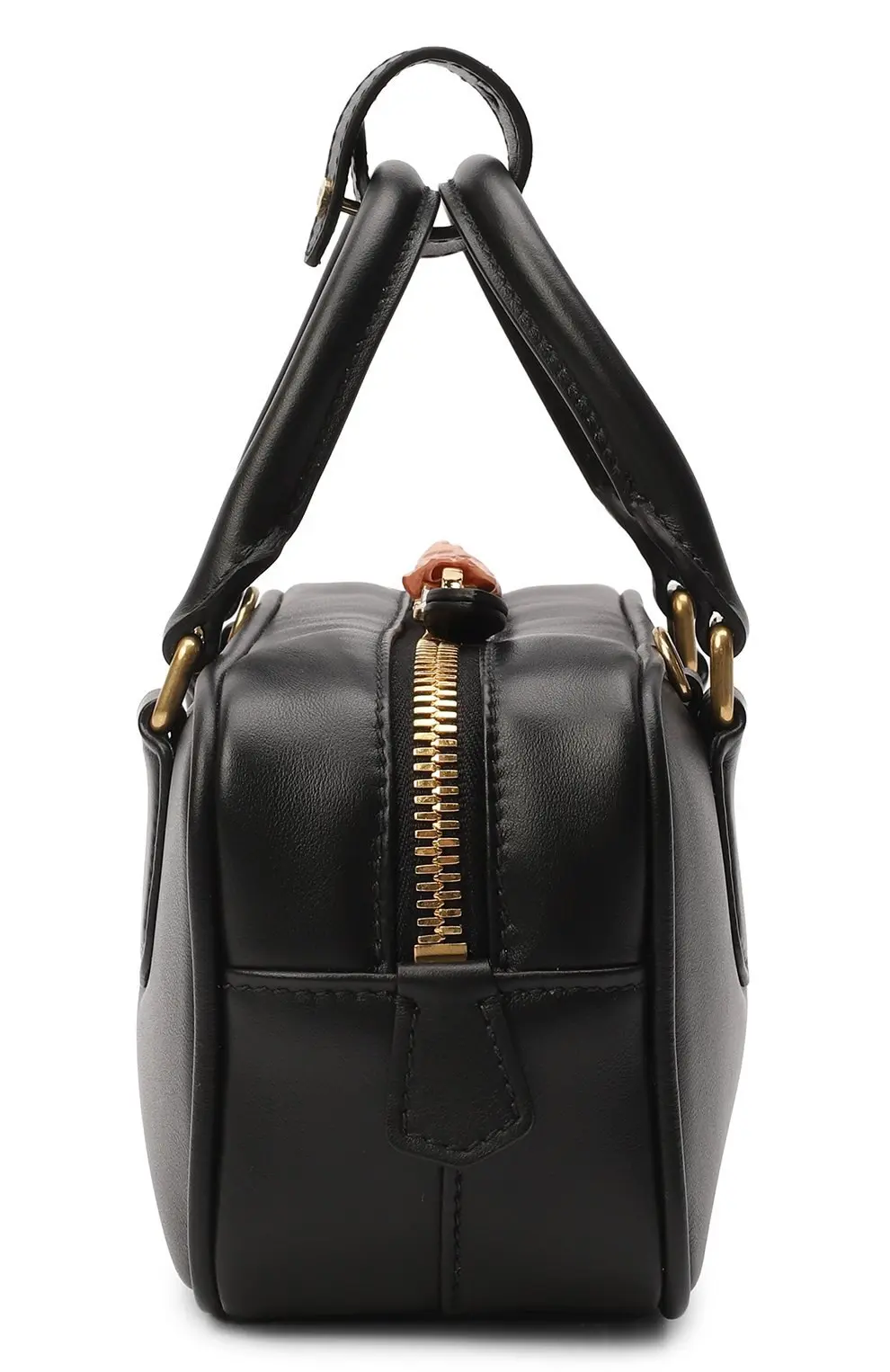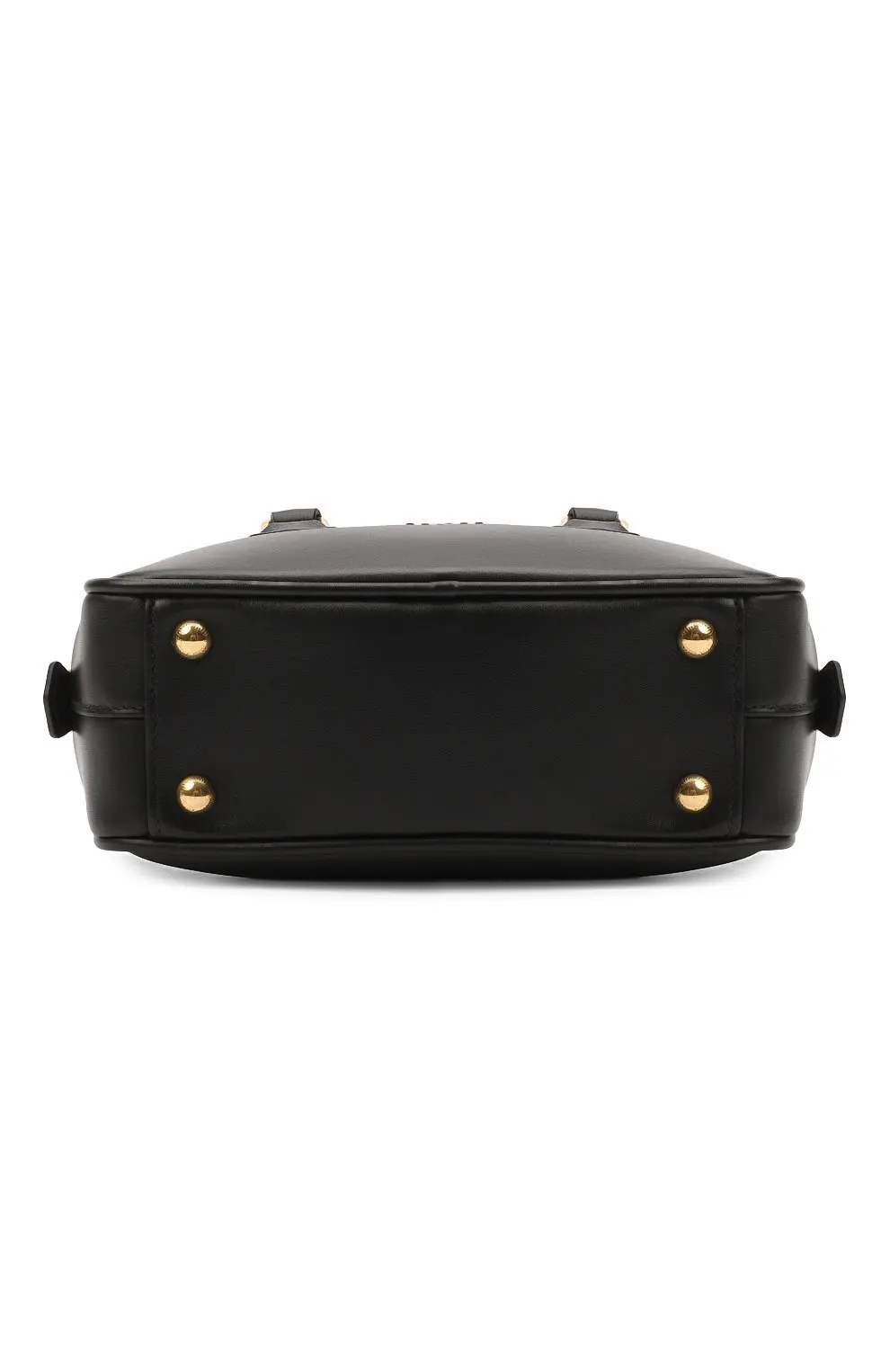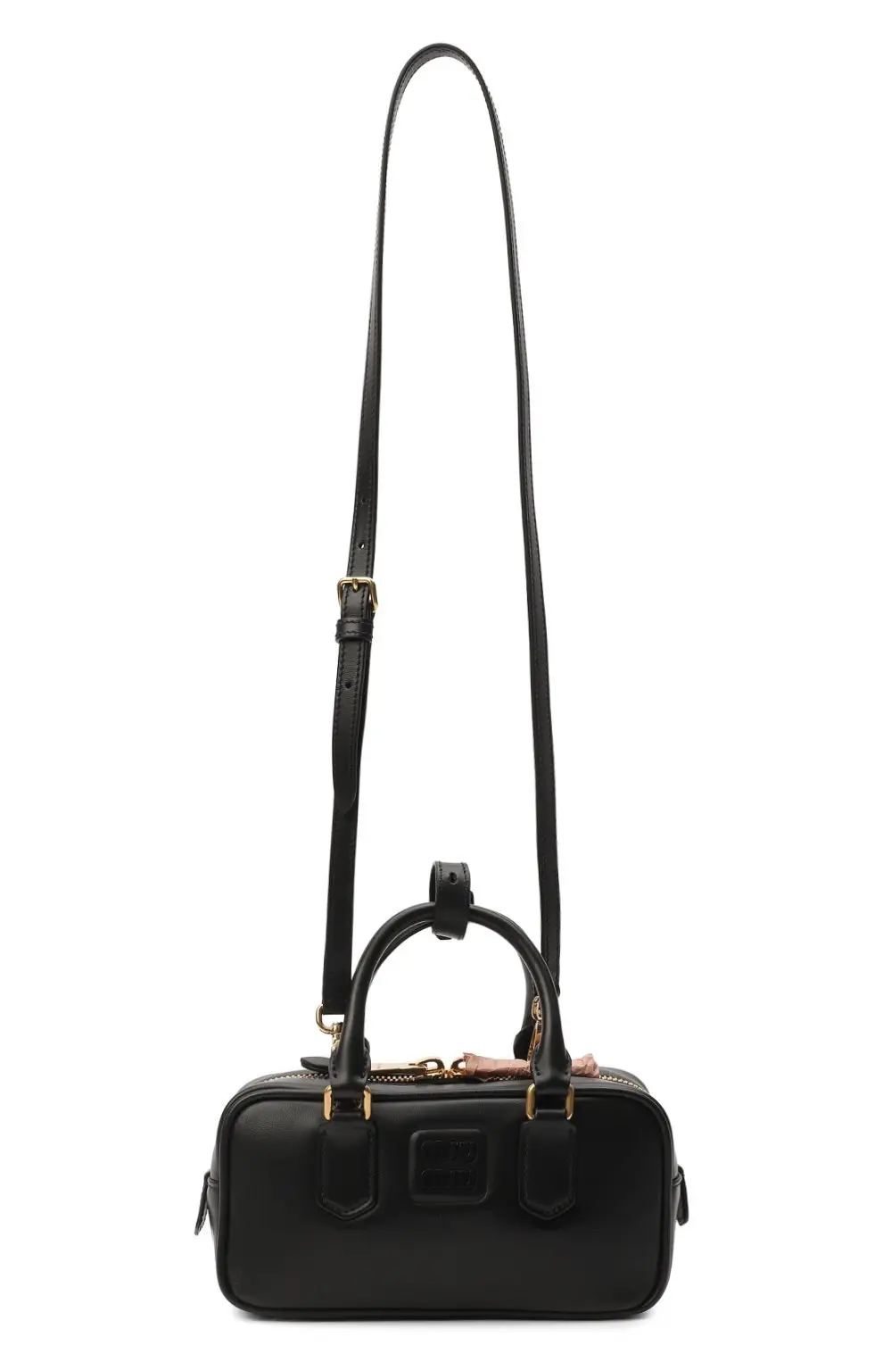 Сумка Arcadie Miu Miu из гладкой чёрной кожи. Прямоугольная форма с жёстким каркасом подчёркивает лаконичный силуэт, а короткие ручки и тиснённый логотип придают модели современный вид. Золотистая фурнитура завершает дизайн, добавляя утончённости.
