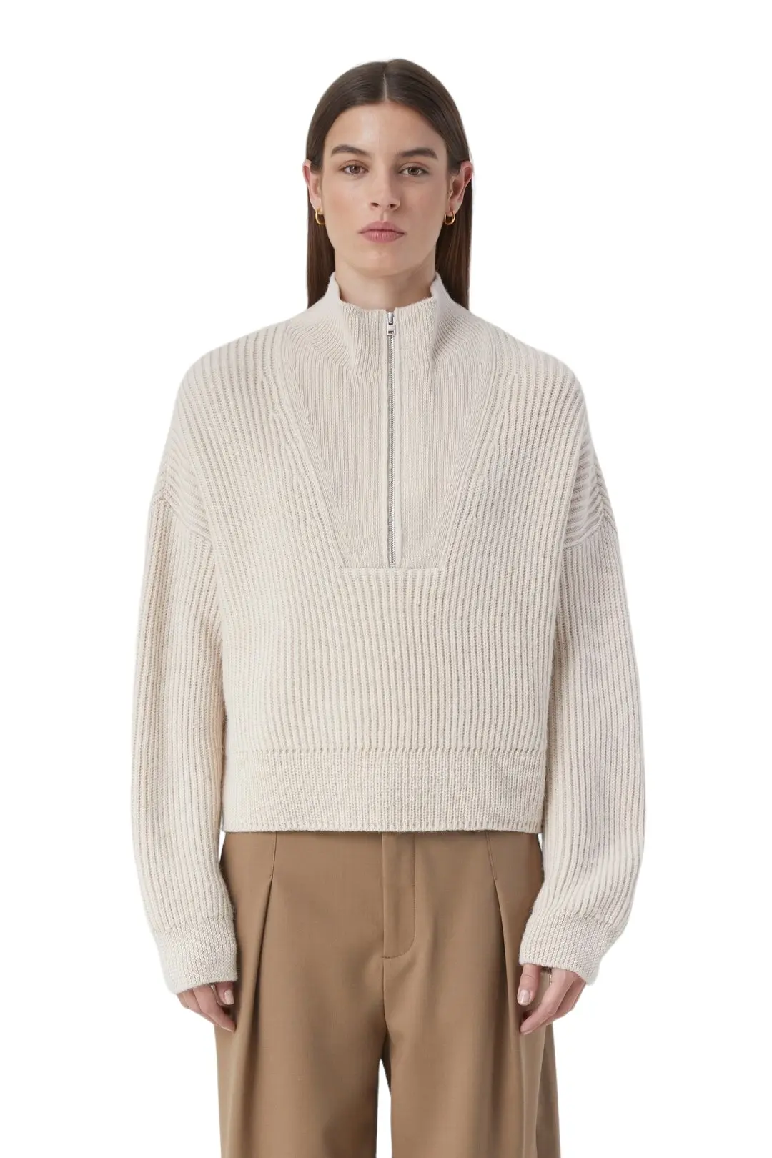 Свитер ребристой вязки Closed в бежевом цвете застегивается на короткую молнию. Модель имеет также ребристые рукава и подол. Изделие выполнено из теплой шерсти альпаки — гипоаллергенной и нежной на ощупь. Сочетайте с брюками или кожаными шортами из коллекции Closed.