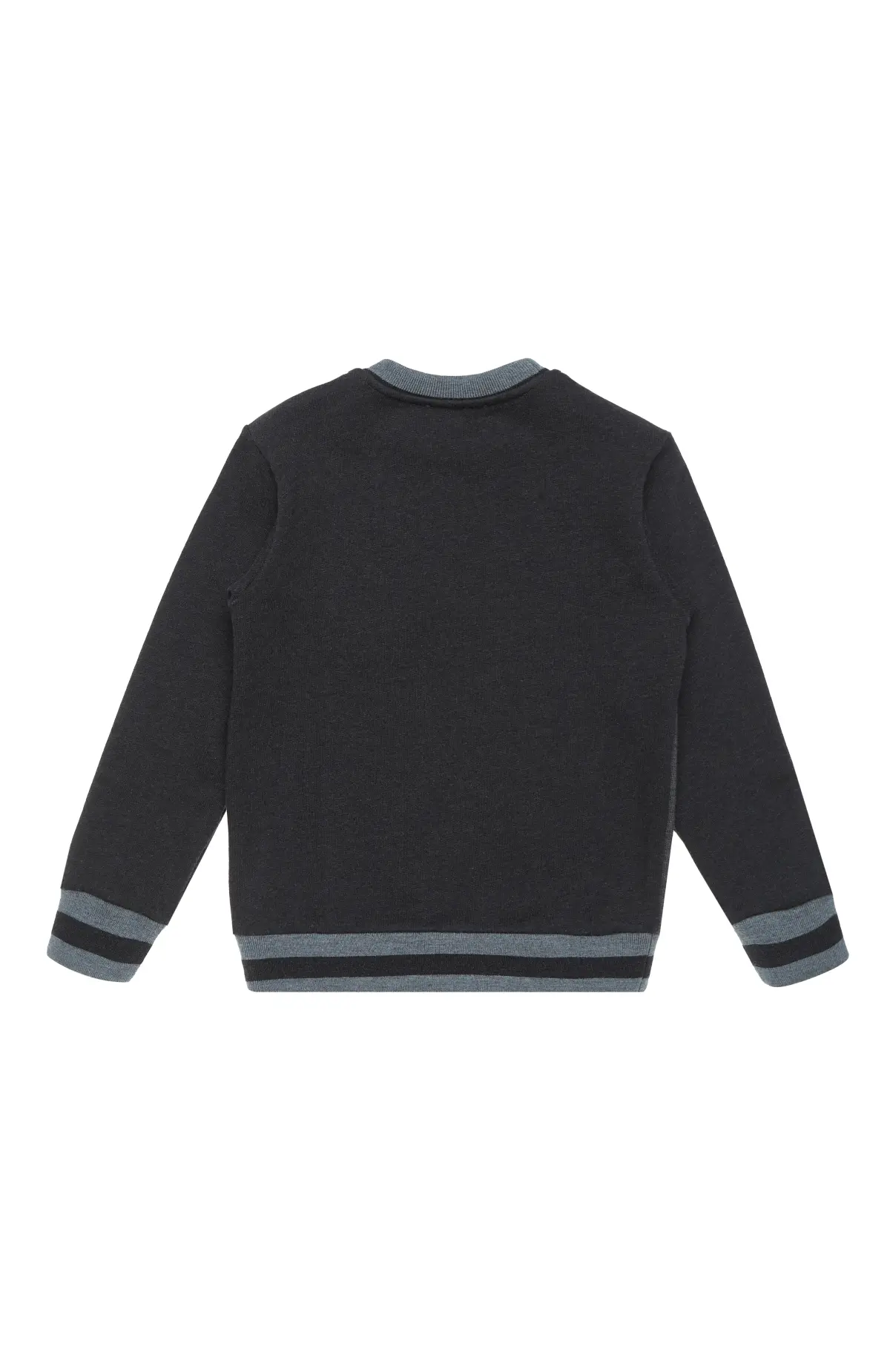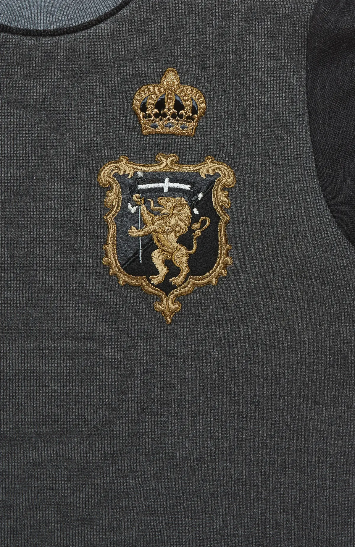 Свитер выполнен из мягкого трикотажного материала. Модель прямого кроя с круглым вырезом и длинными рукавами. Изделие украшено контрастной отделкой и декоративной вышивкой в виде герба на груди.