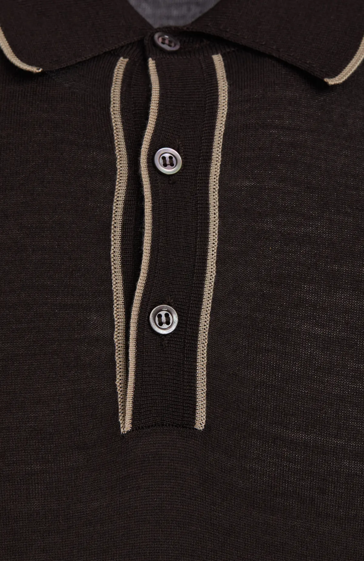Свитер поло глубокого шоколадного оттенка выполнен из тонкого мягкого трикотажа. Модель с длинными рукавами дополнена воротником на пуговицах и контрастной окантовкой по вороту и планке, что придаёт образу аккуратный акцент. Эластичные манжеты и нижний край обеспечивают комфортную посадку в течение дня.
