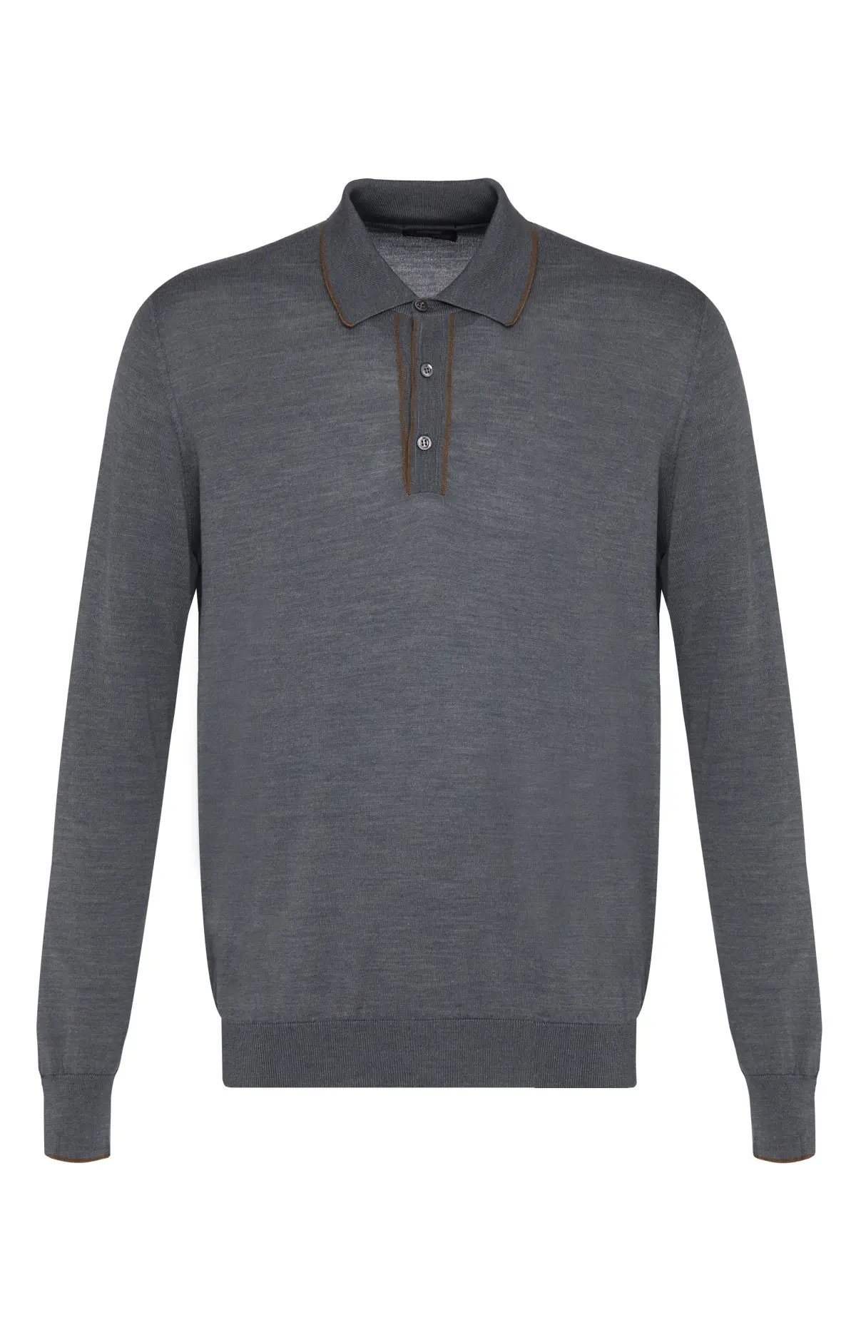 Свитер поло благородного серо-графитового оттенка выполнен из тонкого мягкого трикотажа. Модель с длинными рукавами дополнена воротником на пуговицах и контрастной окантовкой по вороту и планке, которая придаёт образу аккуратный акцент. Эластичные манжеты и нижний край обеспечивают комфортную посадку и сохраняют форму изделия.