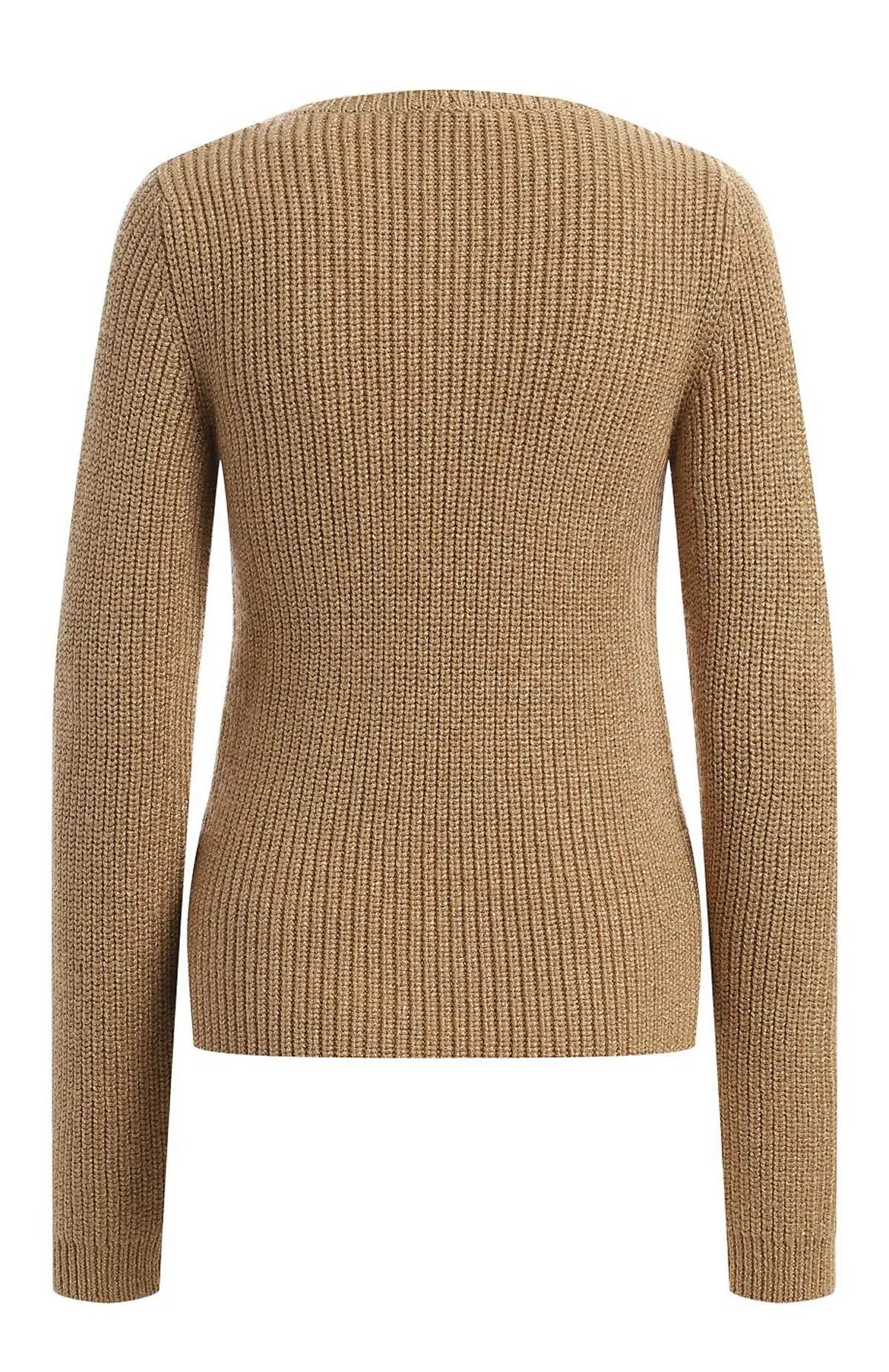 Пуловер из мягкой фактурной пряжи выполнен резинкой, которая комфортно облегает фигуру и держит форму. Камельтовый оттенок и аккуратный круглый вырез придают модели универсальный, спокойный характер. Конструктивные линии вязки визуально формируют силуэт, делая пуловер идеальной базой для повседневных образов.