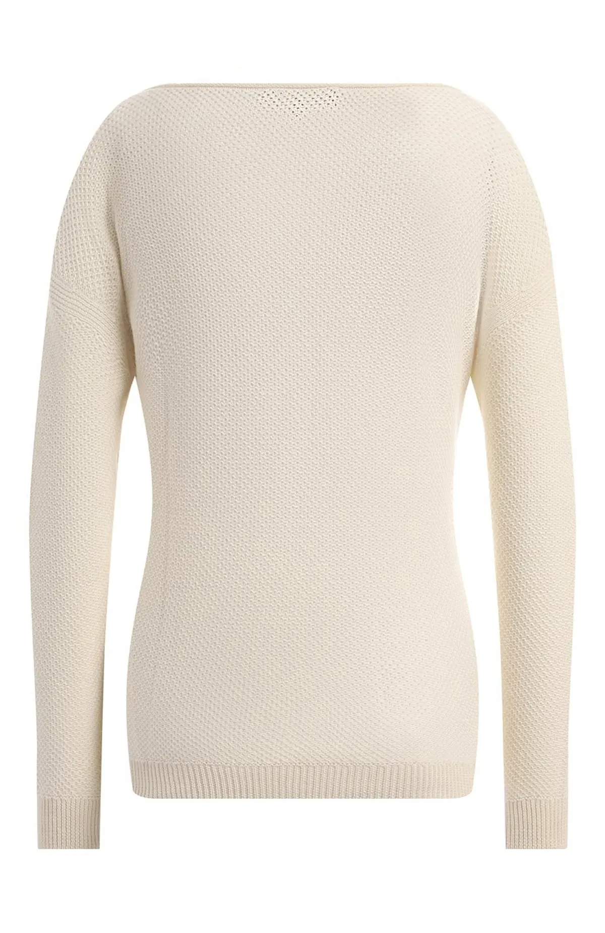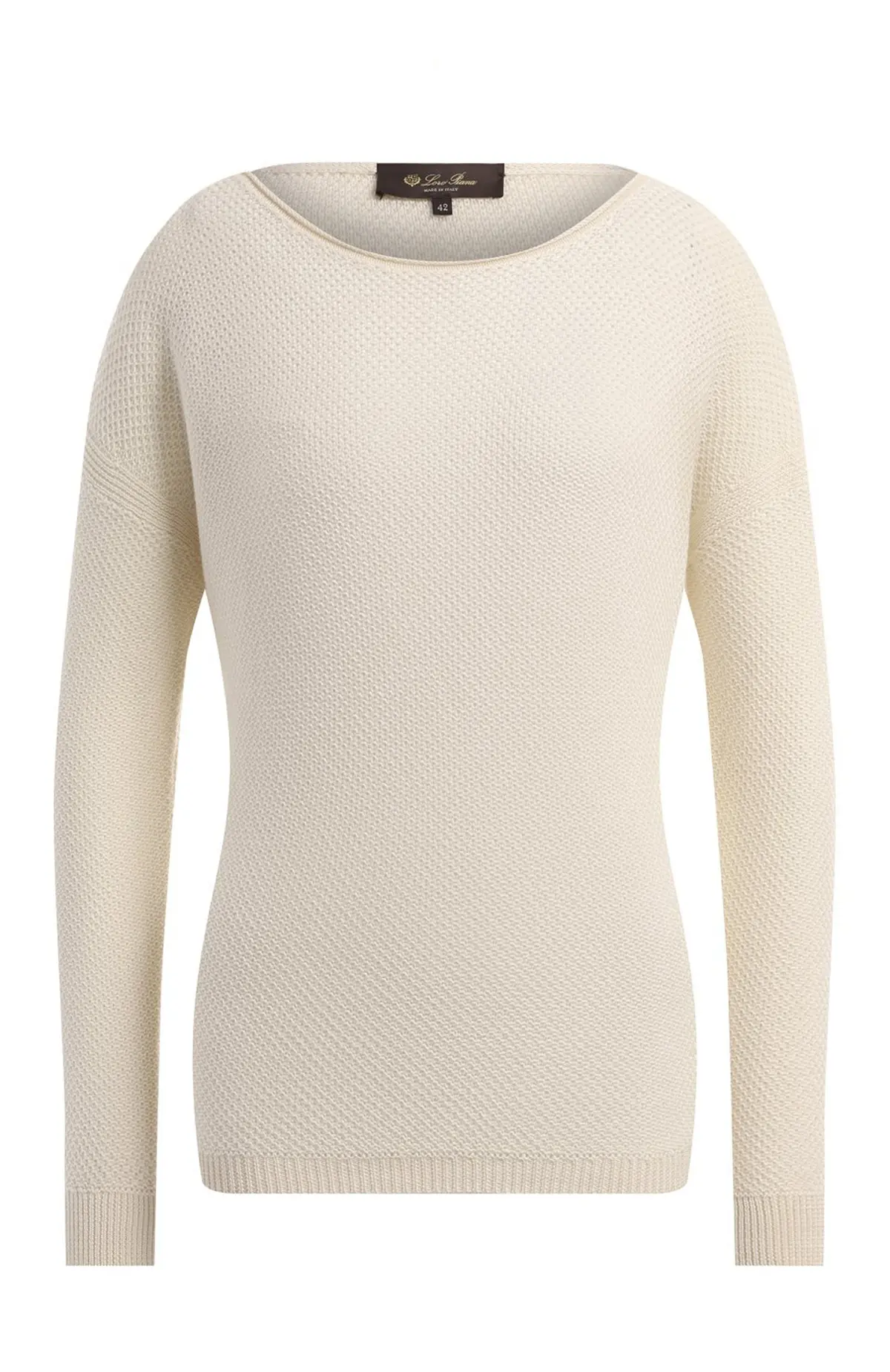 Пуловер Loro Piana из кашемира и шелка выполнен в мягком кремовом оттенке с деликатной фактурой вязки. Модель имеет лаконичный силуэт с круглым вырезом и длинными рукавами, подчеркивая элегантность и утонченность стиля бренда. Смесь кашемира и шелка придаёт изделию воздушность, шелковистый блеск и исключительное ощущение комфорта. Универсальный дизайн делает пуловер идеальной базой для повседневных и изысканных образов.