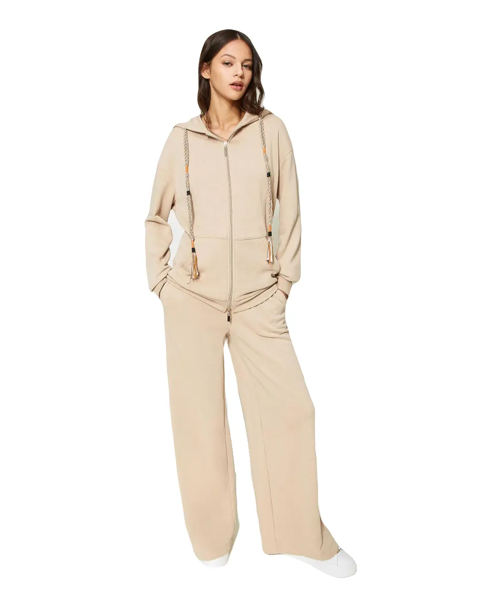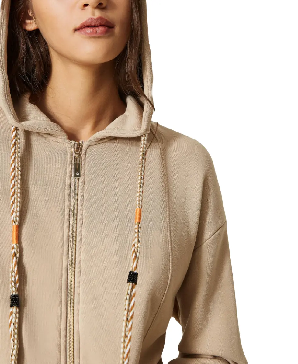 Толстовка TWINSET из смесового хлопка с двойной молнией. Модель имеет плетеную кулиску на капюшоне с мелкой вышивкой и карманы-кенгуру. Бежевое худи подойдет для повседневных расслабленных образов. Сочетайте с брюками в тон из коллекции TWINSET.