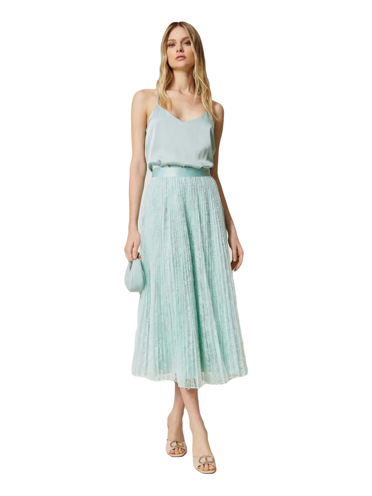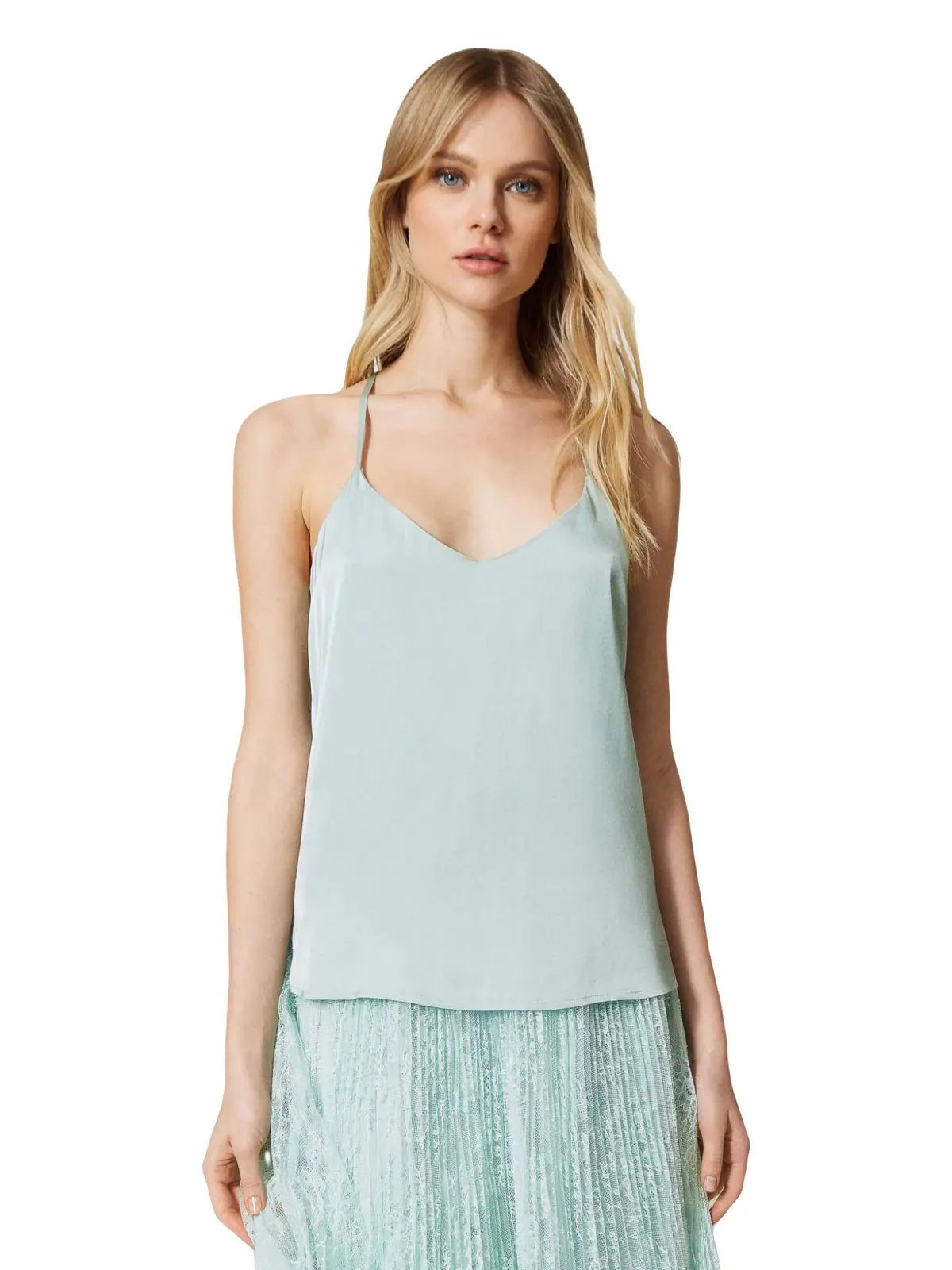 Струящийся топ из вискозного атласа TWINSET. Модель имеет разрезы по бокам, воротник-хомутик сзади и подкладку из крепдешина. Изделие свободного кроя, на тонких бретелях. Сочетайте с юбкой TWINSET с кружевом для создания романтичного вечернего образа.