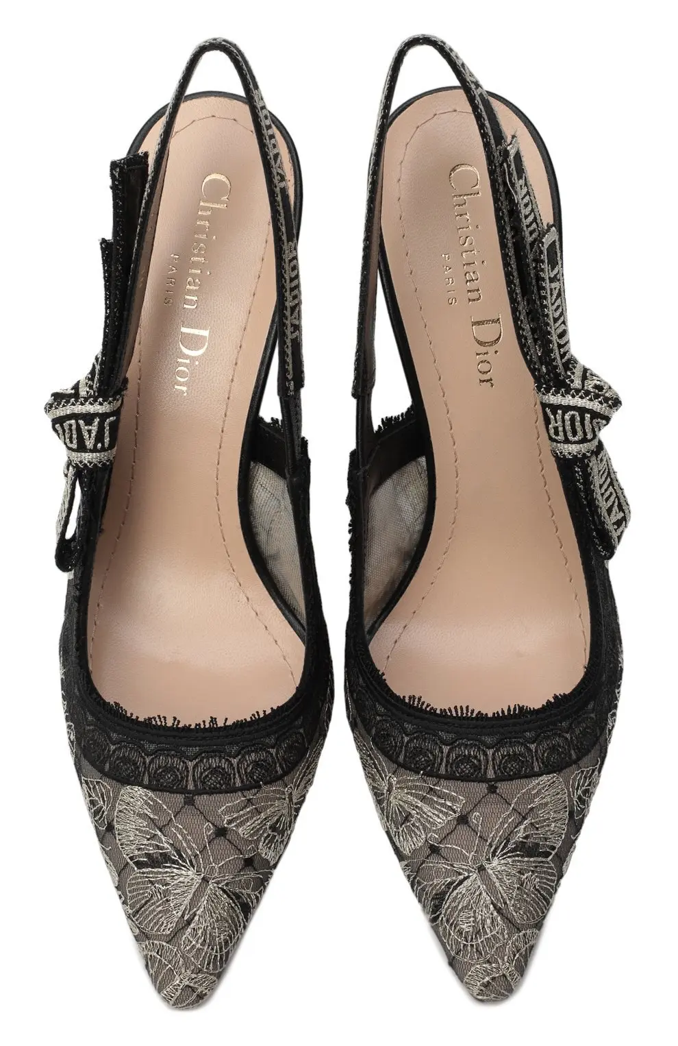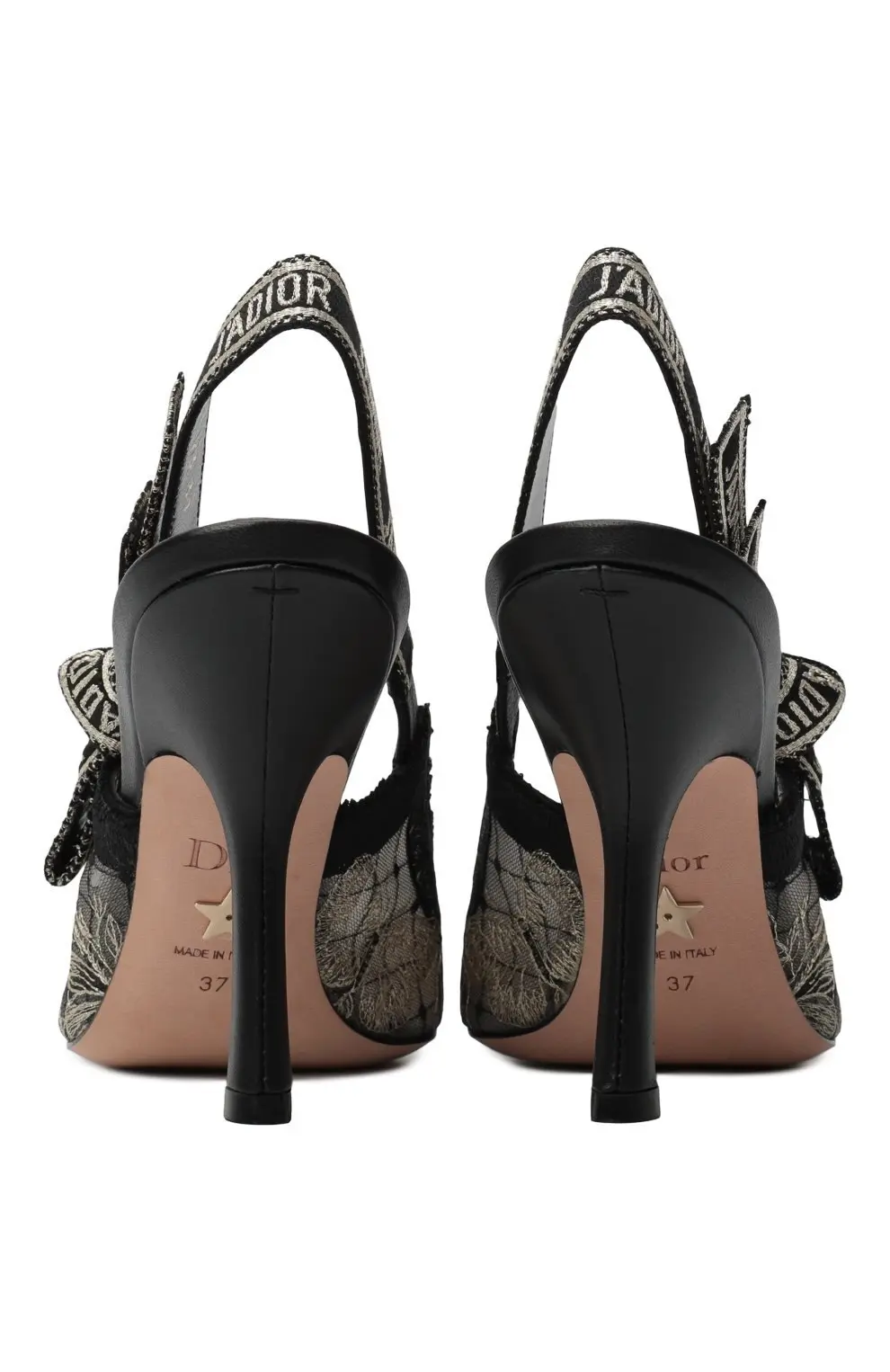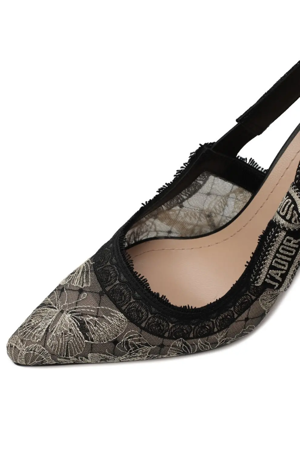 Туфли J’Adior от Dior выполнены из черного кружева с изящной вышивкой, создающей утонченный цветочный узор. Эластичный ремешок с культовой надписью J’Adior подчеркивает изысканный стиль и фирменный характер модели. Острый мыс и изящный каблук делают пару элегантным выбором для вечерних выходов и особых случаев, сочетая в себе женственность и современный шарм.