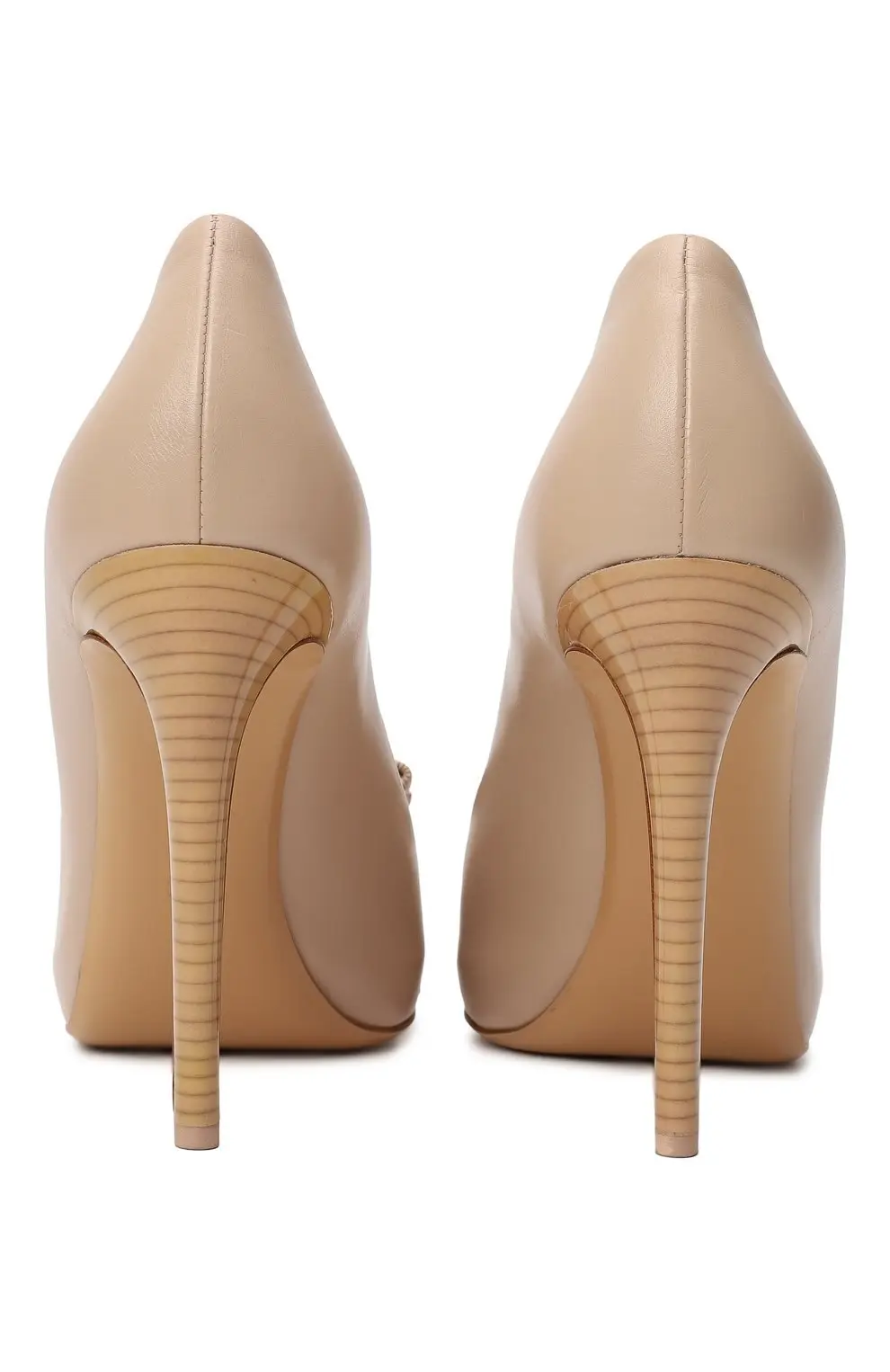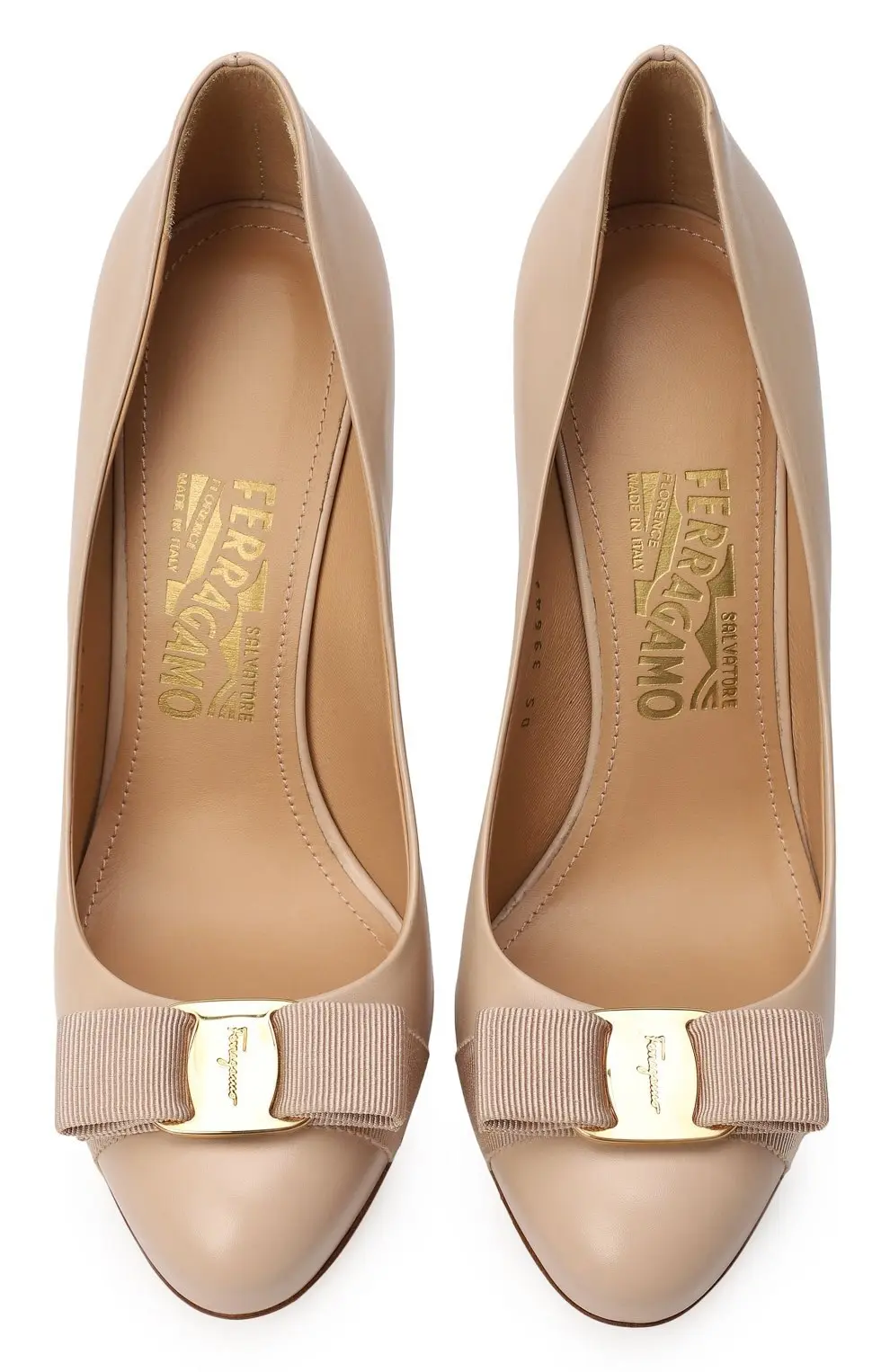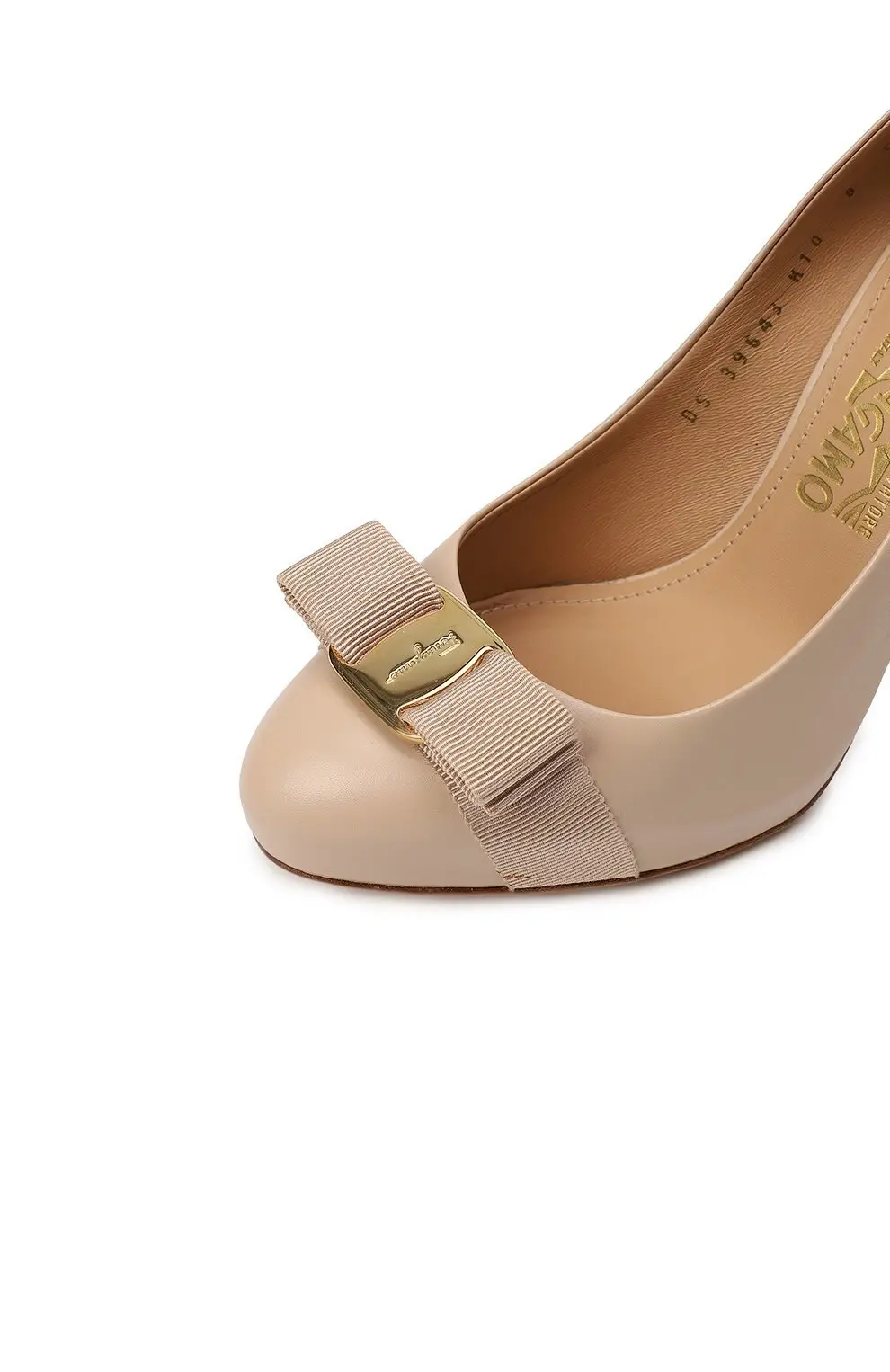 Туфли Rilly от Salvatore Ferragamo выполнены из гладкой бежевой кожи, сочетающей в себе элегантность и универсальность. Модель отличается изящным округлым мыском и высоким каблуком-шпилькой, визуально удлиняющим силуэт. Фирменным акцентом служит культовый бант Vara из тканой ленты с золотистой пластиной, придающий образу характерный для бренда утончённый шарм. Внутренняя отделка из натуральной кожи обеспечивает комфорт, а аккуратная подошва делает обувь практичной для повседневного и вечернего выхода.