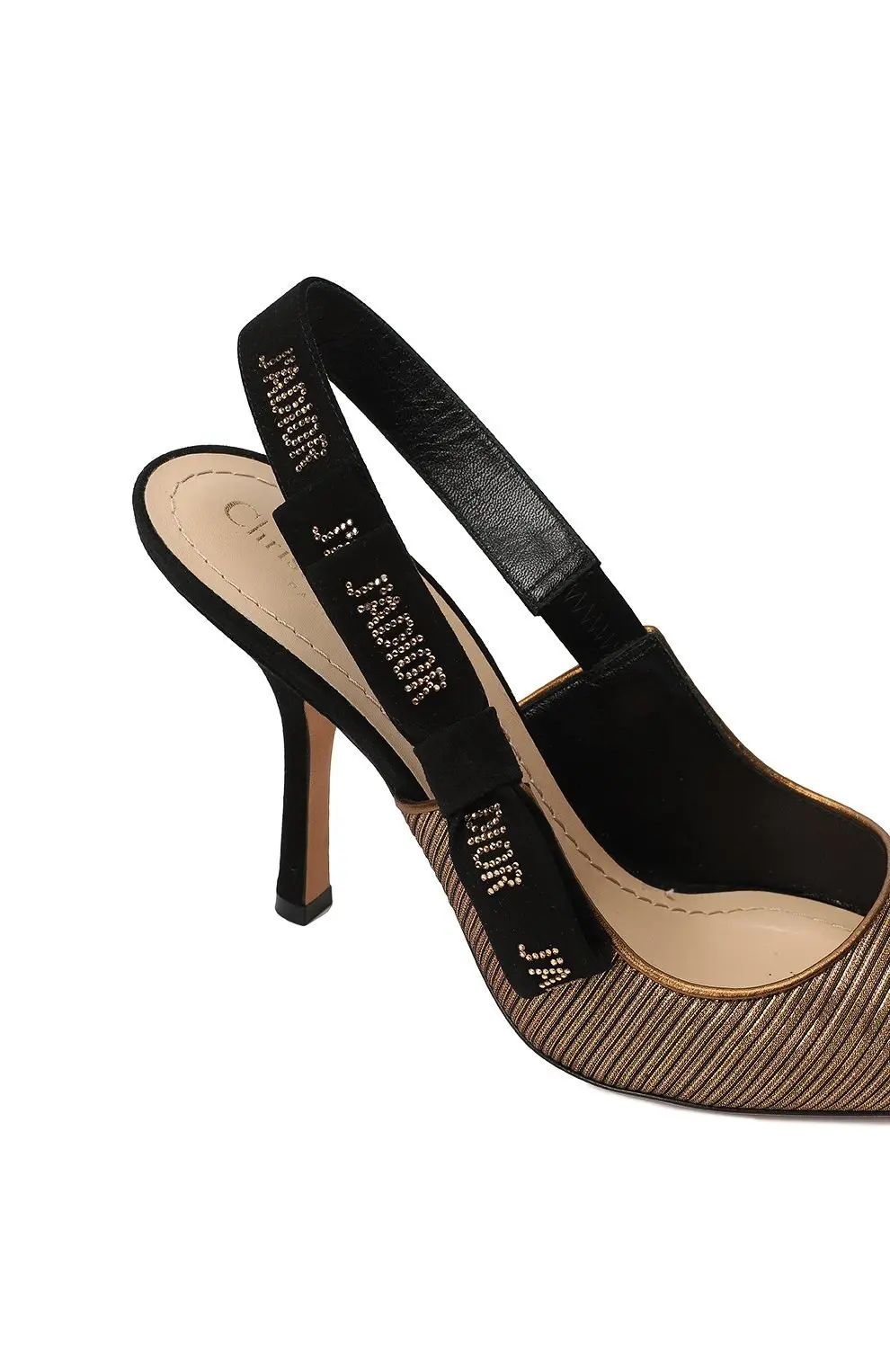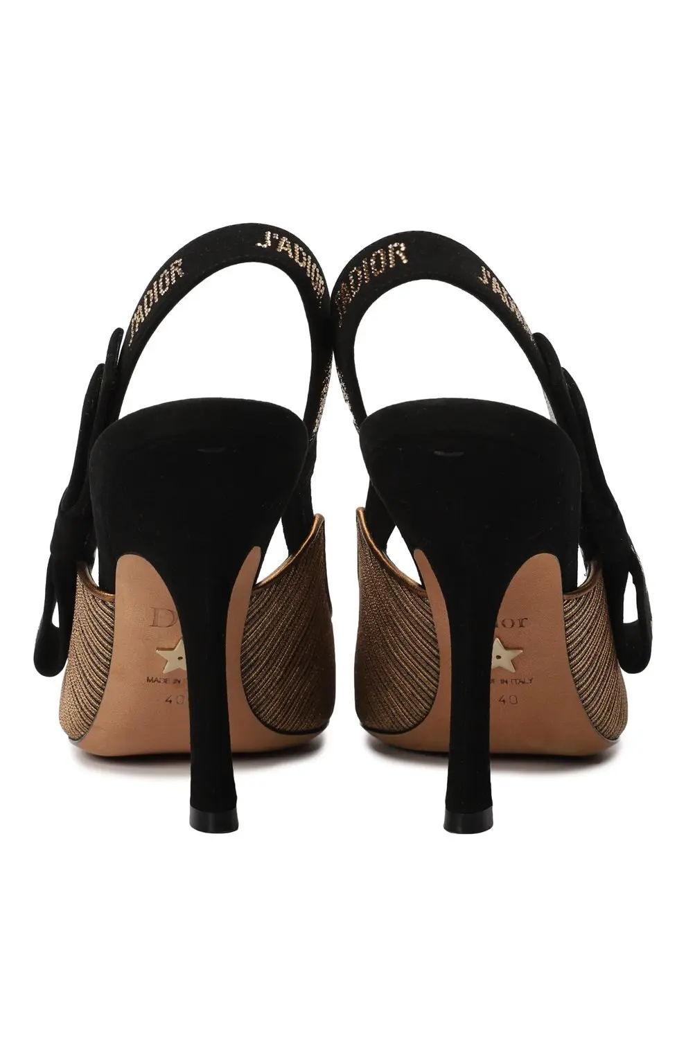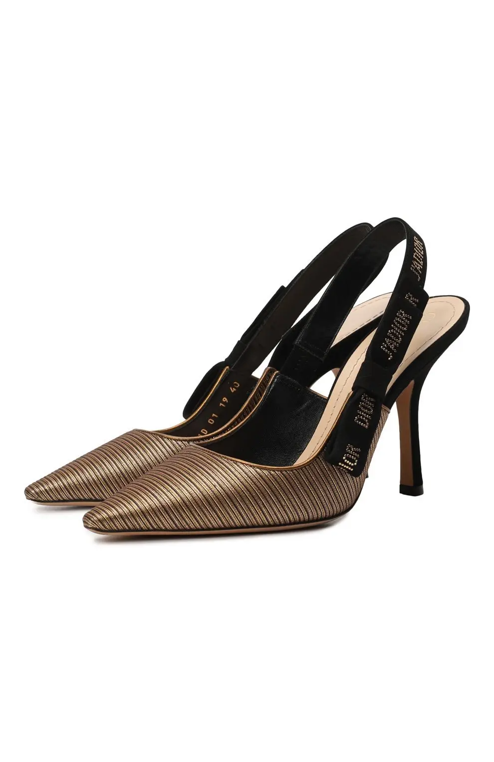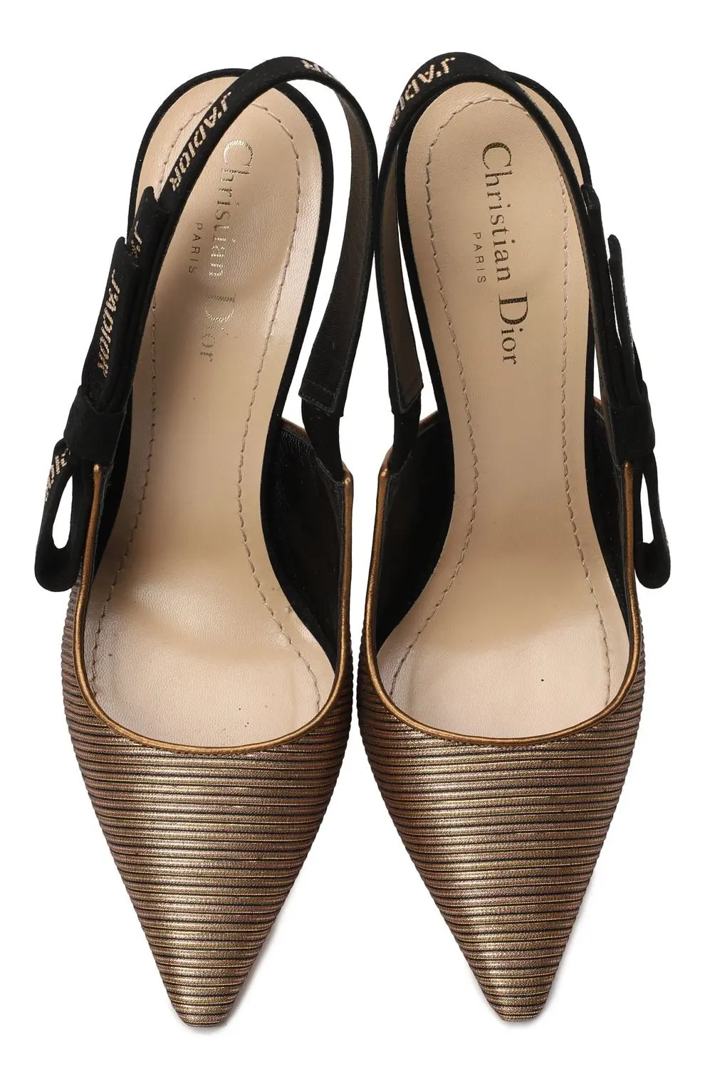 Туфли J’Adior от Dior в золотом оттенке с металлическим блеском создают эффектный и современный образ. Заострённый мысок придаёт силуэту элегантность, а ремешок с фирменной вышивкой «J’Adior» и бантом добавляет знаковый акцент Дома Dior. Высокий каблук подчёркивает женственность и делает модель универсальной для вечерних мероприятий и особых случаев.