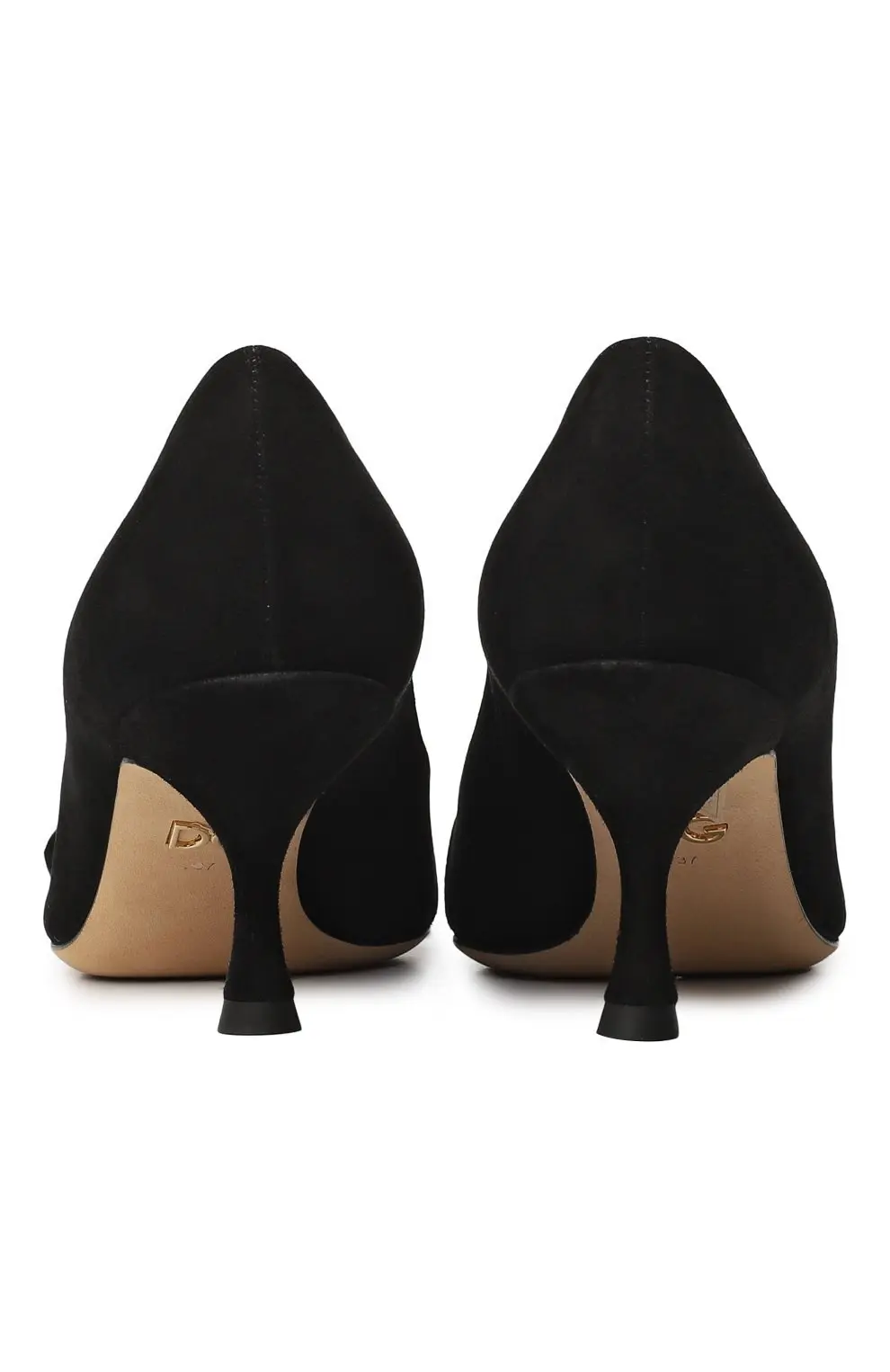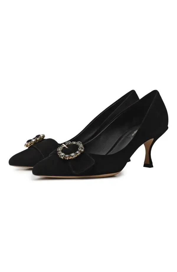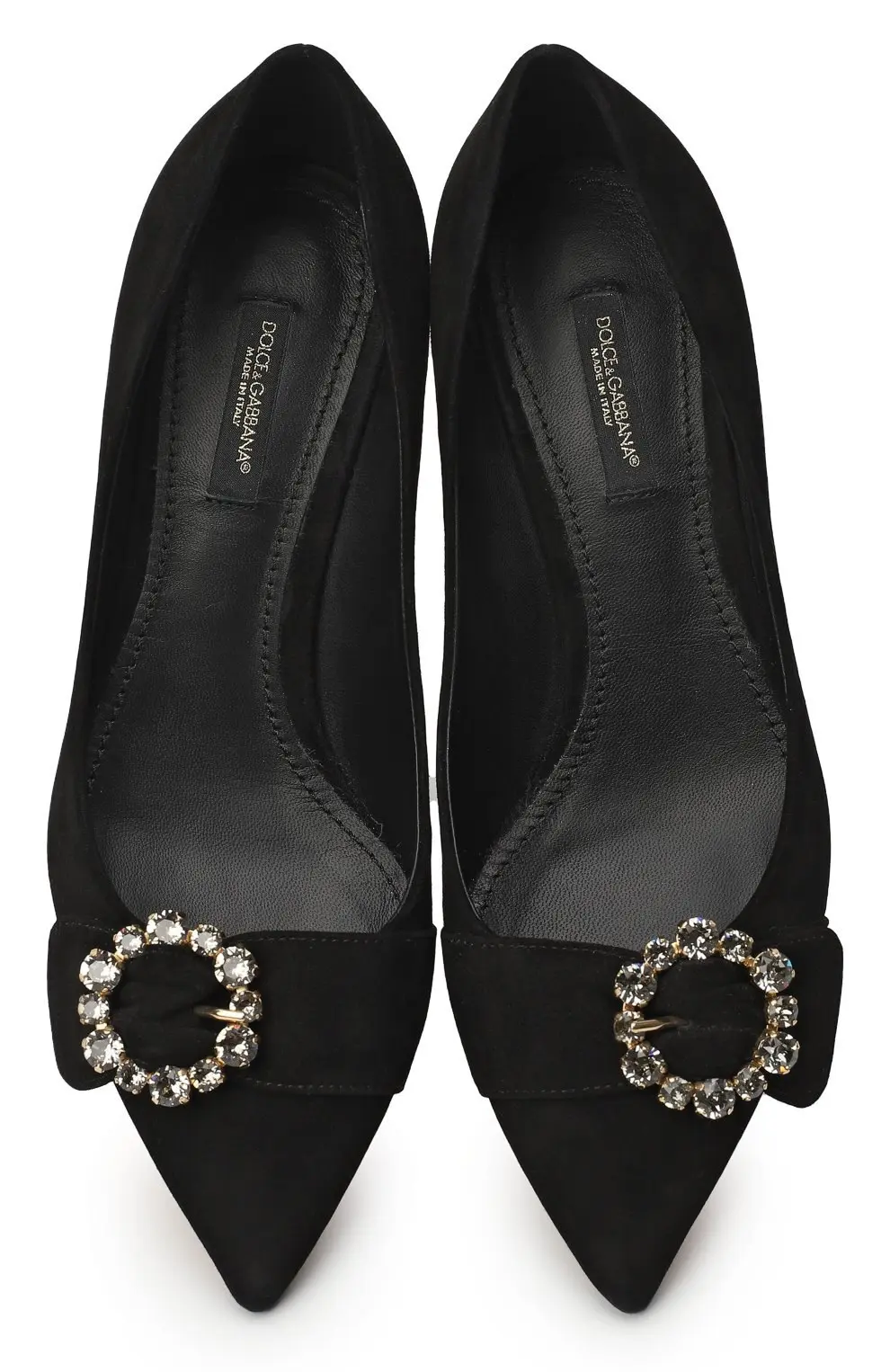 Эти туфли Dolce&Gabbana из замши отличаются изысканной элегантностью. Заострённый мысок украшен крупной пряжкой с инкрустированными камнями, придающей модели благородный блеск. Невысокий изогнутый каблук обеспечивает комфорт и женственность, а утончённый силуэт делает пару универсальной для вечерних выходов и особых случаев.
