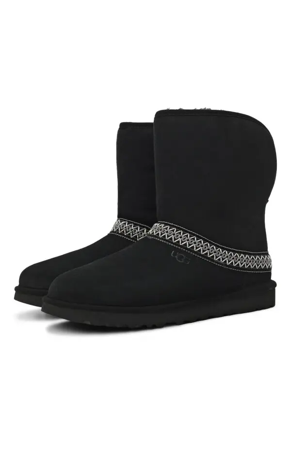 Сапоги UGG Classic Crescent в черном цвете. Модель выполнена из замши с отделкой по верху стопы контрастным орнаментом. Традиционная овчина внутри обеспечивает комфорт и тепло, а легкая подошва из EVA дарит амортизацию и удобство при носке.