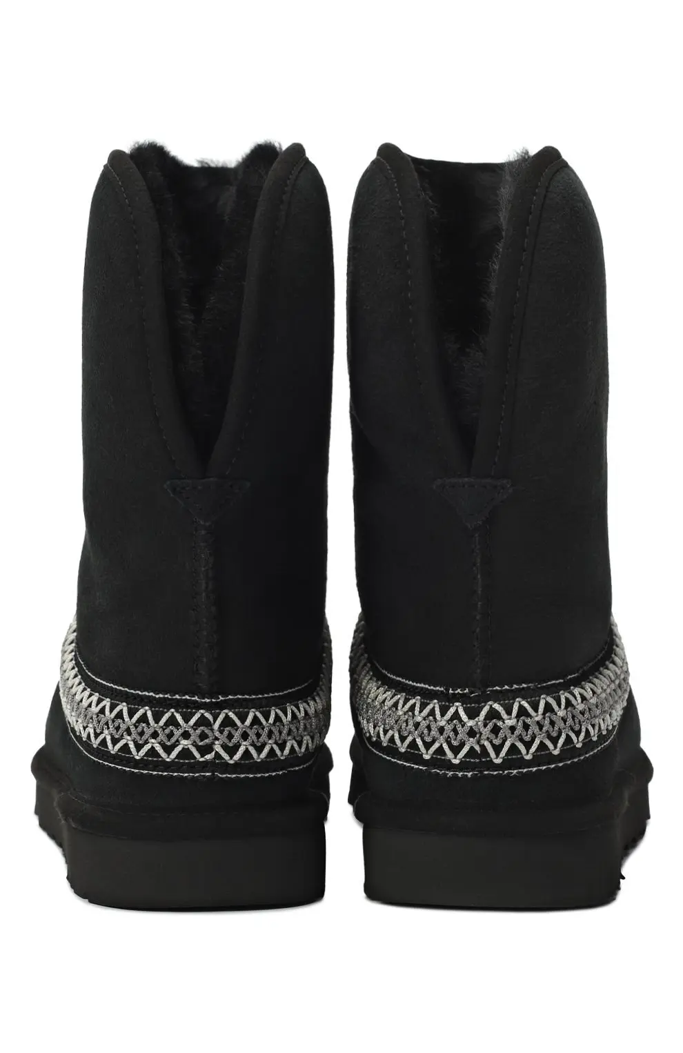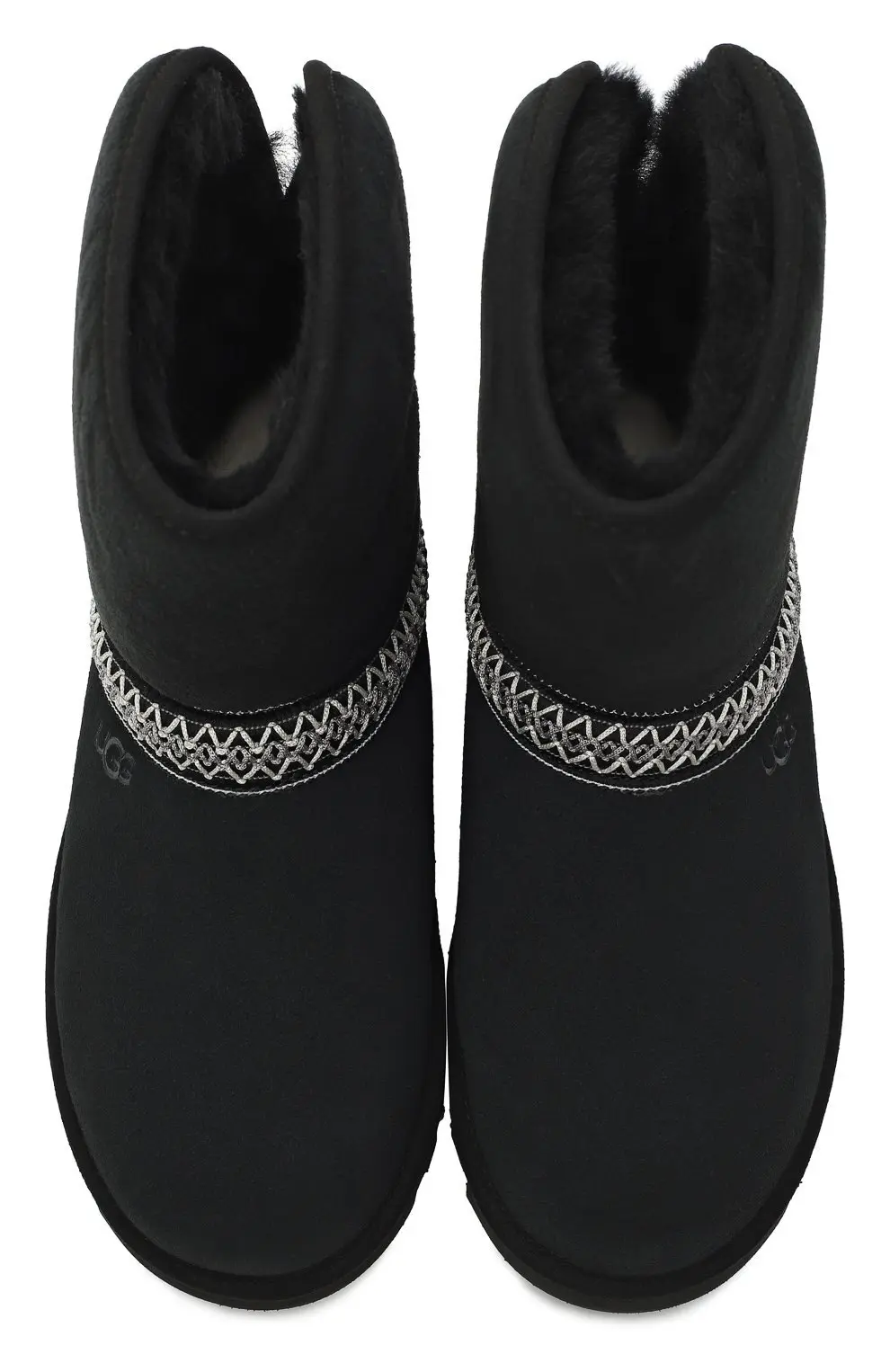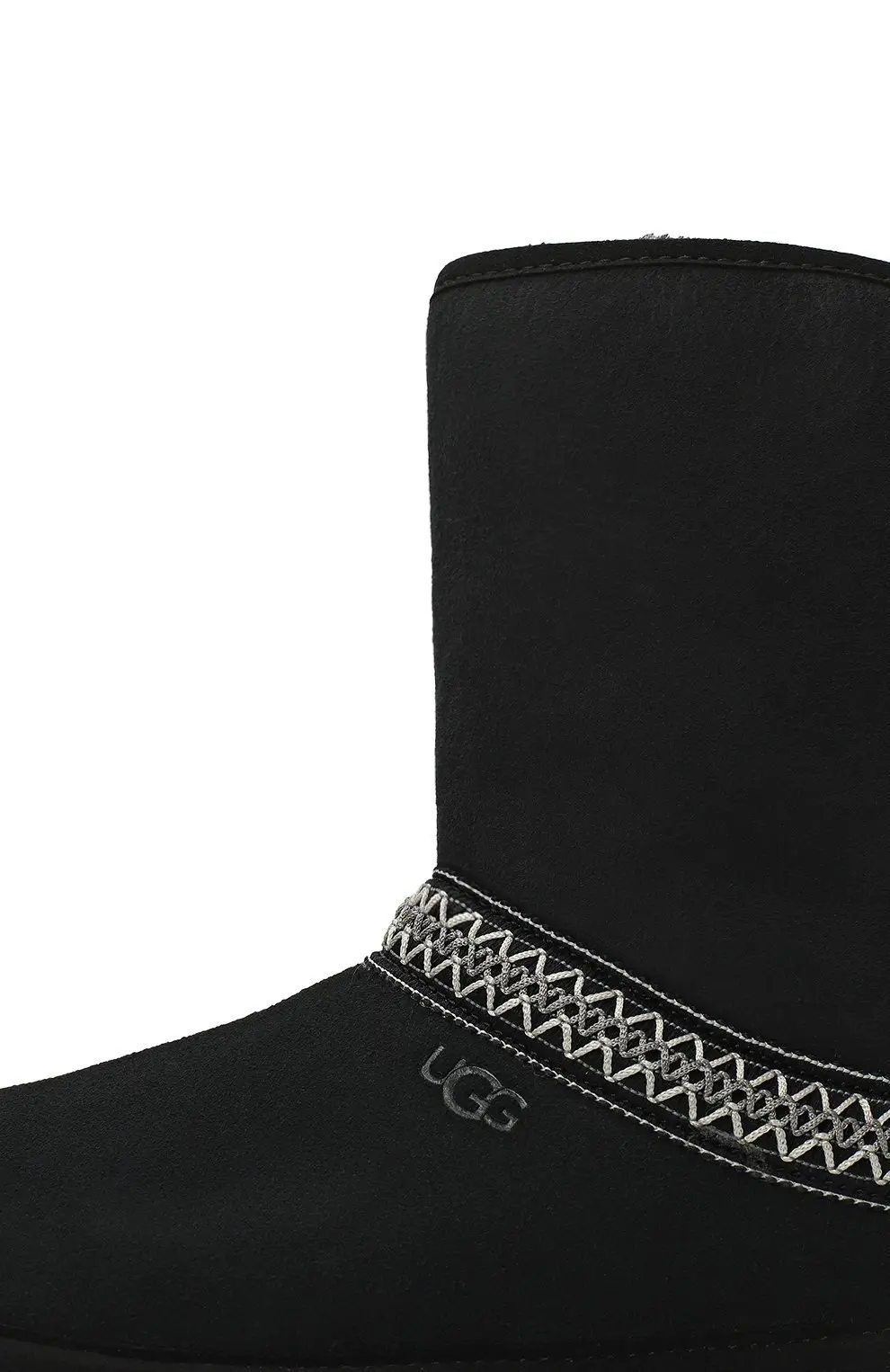 Сапоги UGG Classic Crescent в черном цвете. Модель выполнена из замши с отделкой по верху стопы контрастным орнаментом. Традиционная овчина внутри обеспечивает комфорт и тепло, а легкая подошва из EVA дарит амортизацию и удобство при носке.