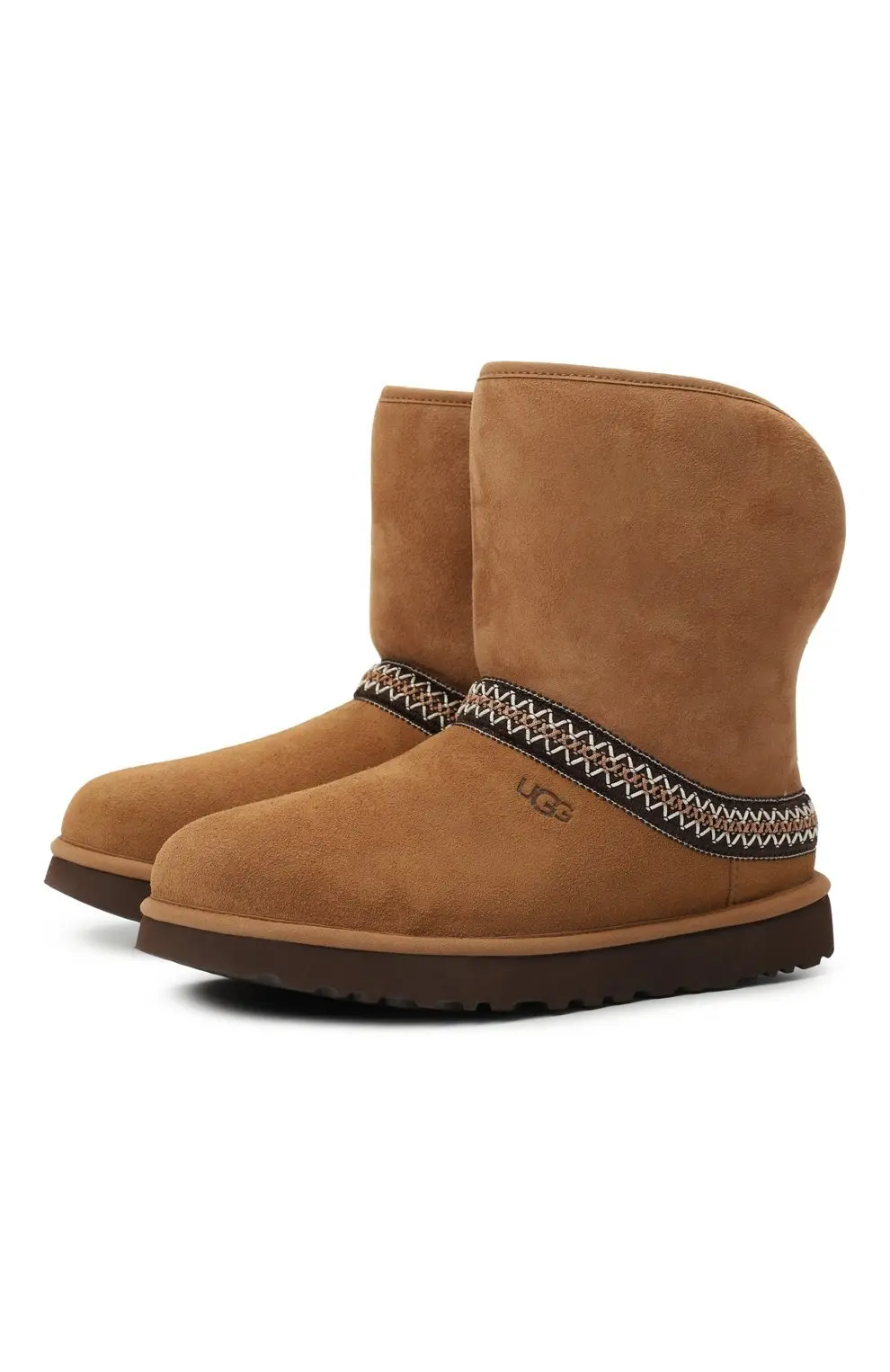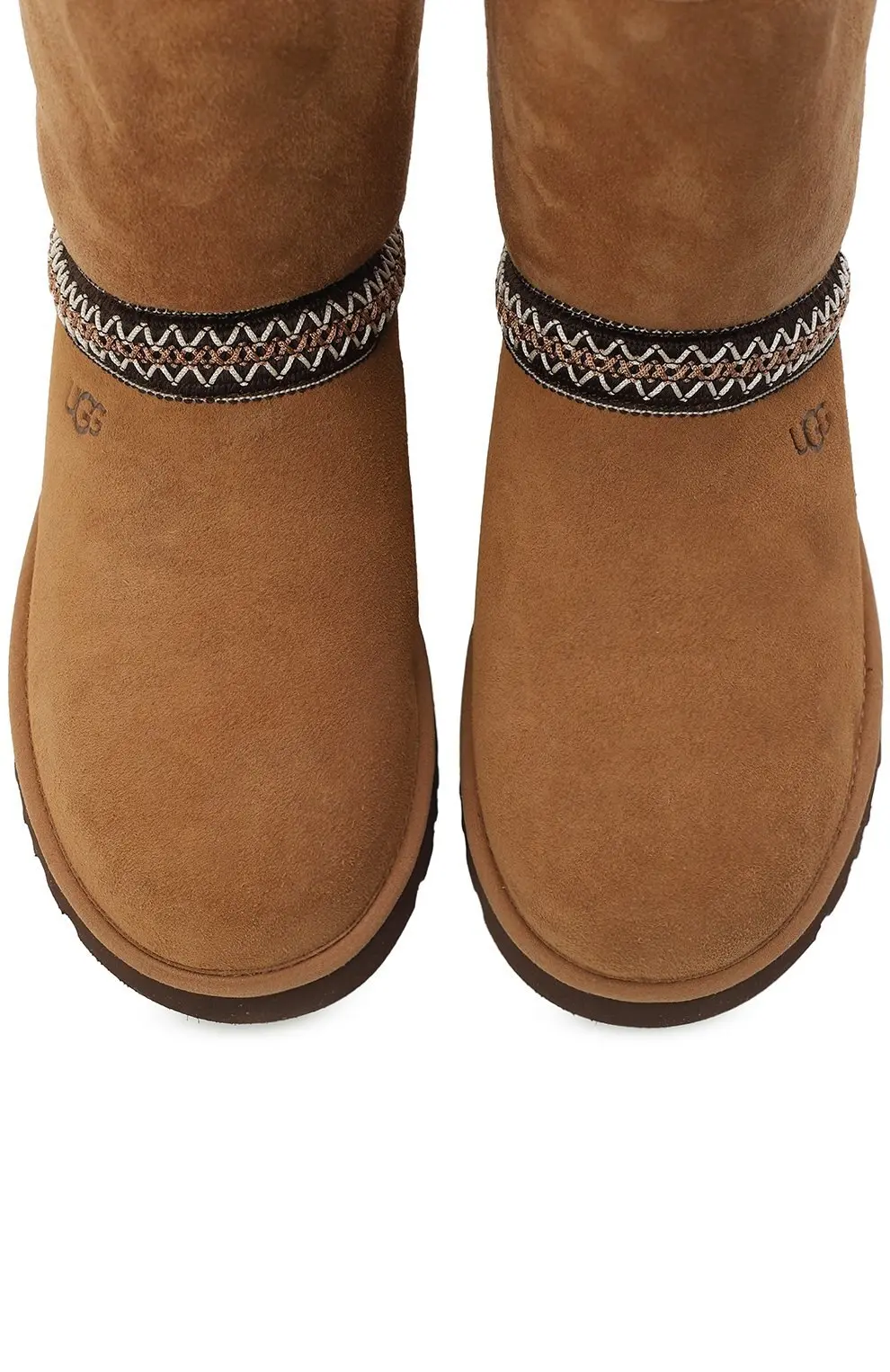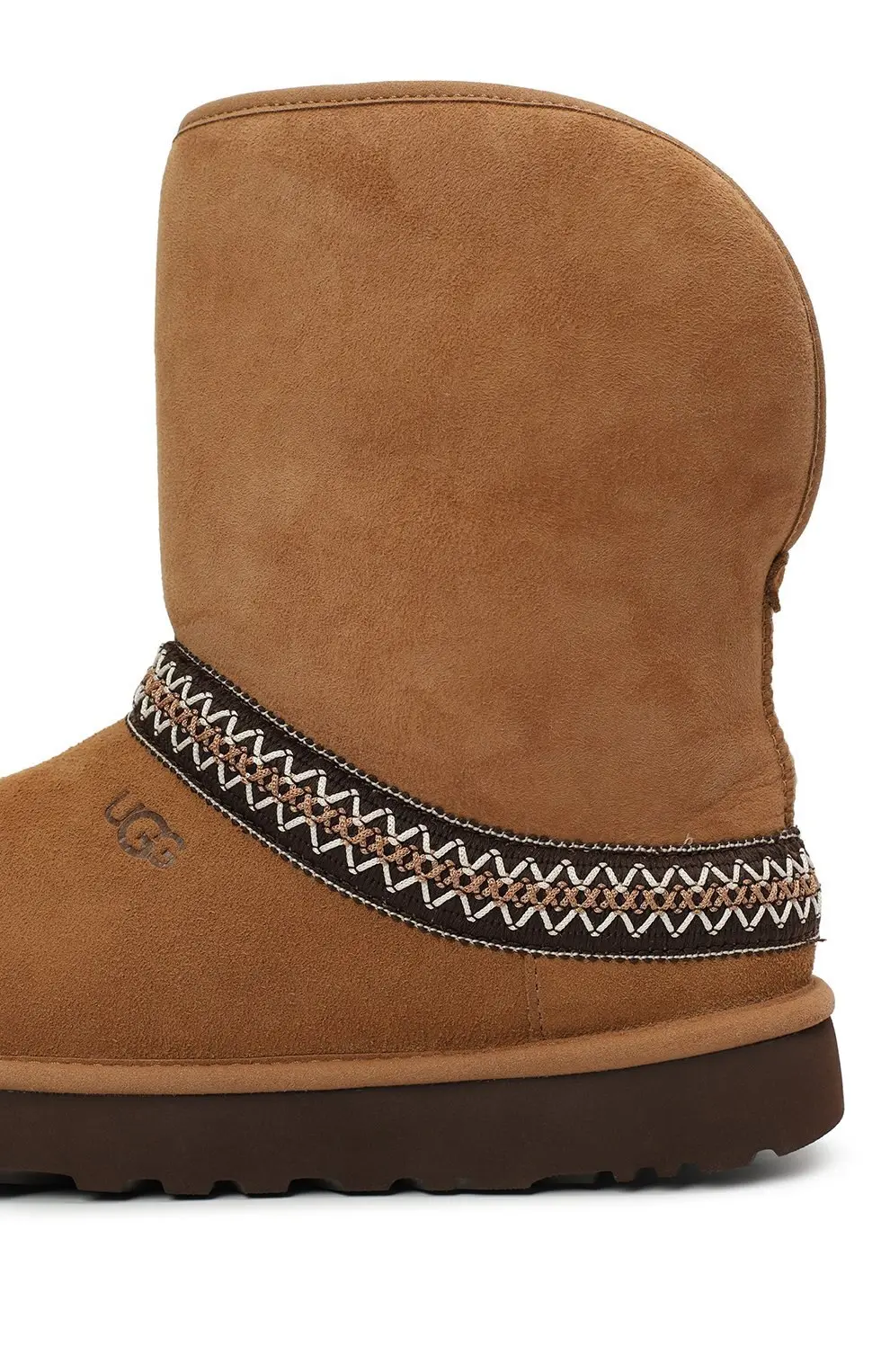 Сапоги UGG Classic Crescent в ореховом ццвете. Выполнены из мягкой замши с традиционной отделкой в виде этнического орнамента по верхней части стопы. Внутри — фирменная овчина UGG, обеспечивающая тепло и комфорт. Подошва из легкого и прочного EVA гарантирует удобство при повседневной носке.