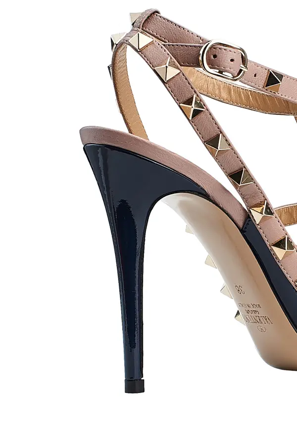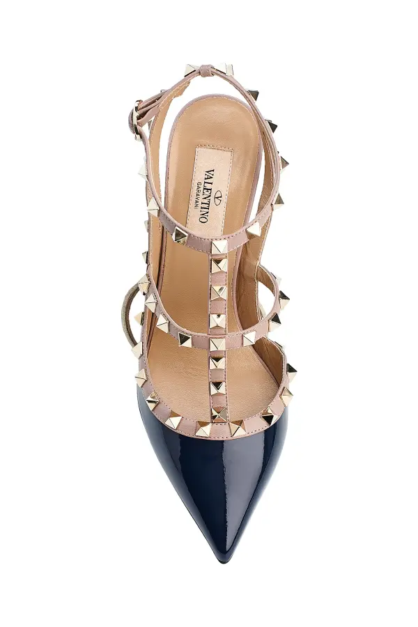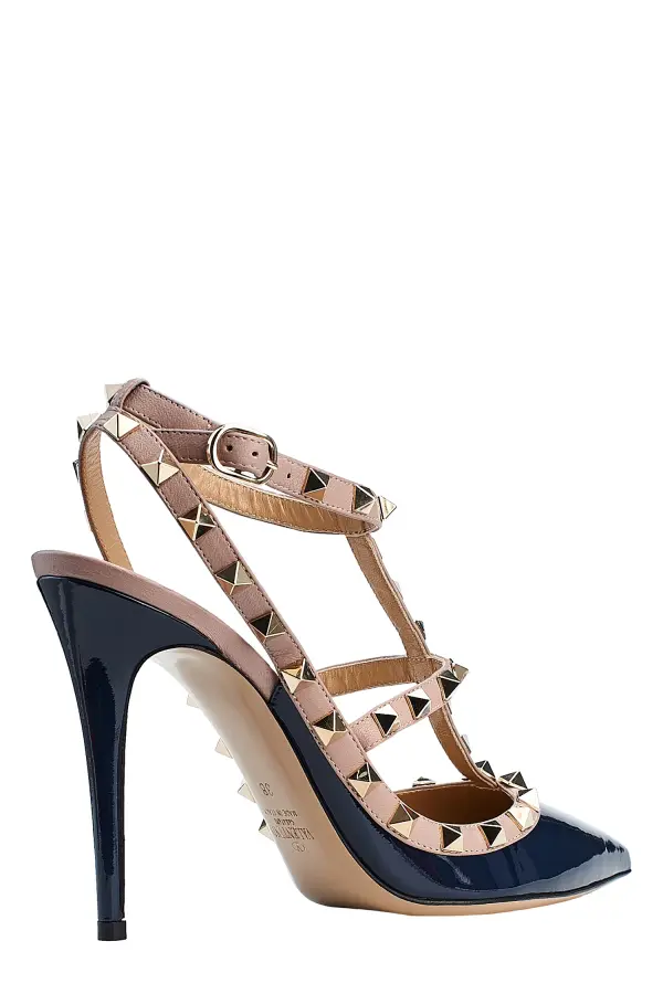 Лодочки выполнены из лакированной кожи глубокого синего оттенка и дополнены пудровыми ремешками с пирамидальными заклёпками. Остроносый мыс и тонкий высокий каблук визуально вытягивают силуэт и придают образу графичность. Регулируемый ремешок на щиколотке обеспечивает надёжную фиксацию и комфортное прилегание.