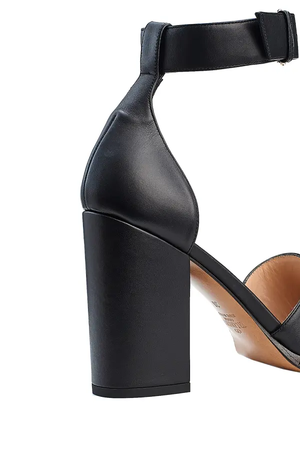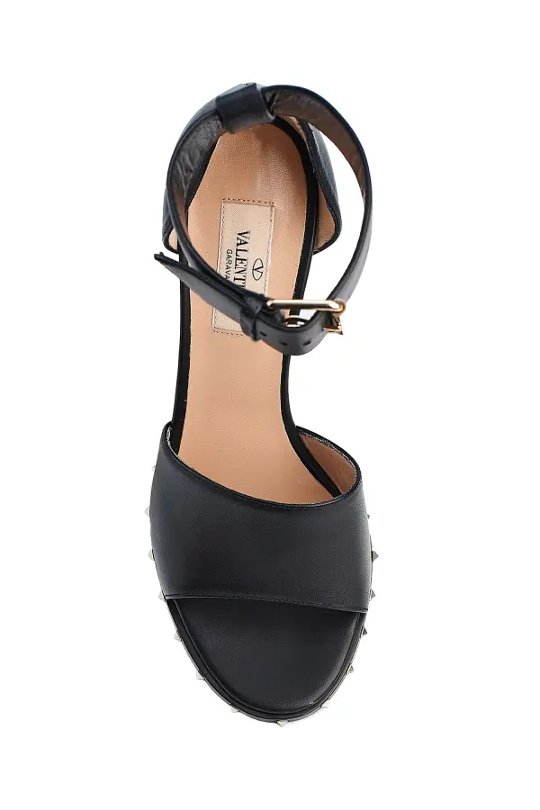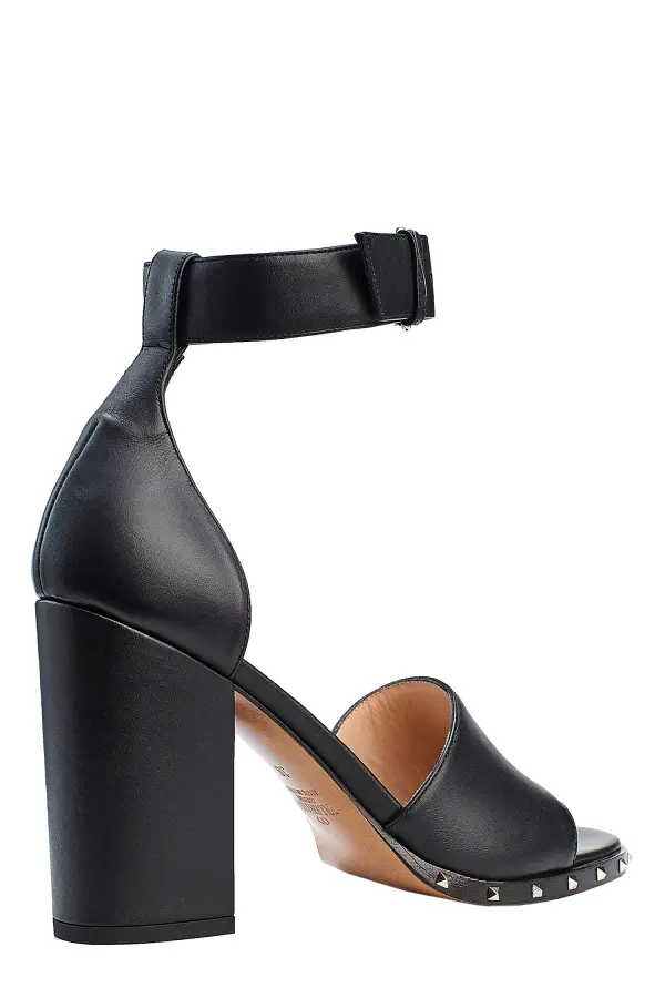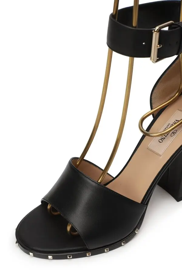 Босоножки Valentino Garavani Rockstud выполнены из гладкой черной кожи. Модель на устойчивом блочном каблуке украшена фирменными металлическими шипами по краю подошвы — знаковым элементом Дома Valentino. Регулируемый ремешок на щиколотке с золотистой пряжкой обеспечивает комфортную посадку. Элегантный и современный акцент для вечерних и повседневных образов.