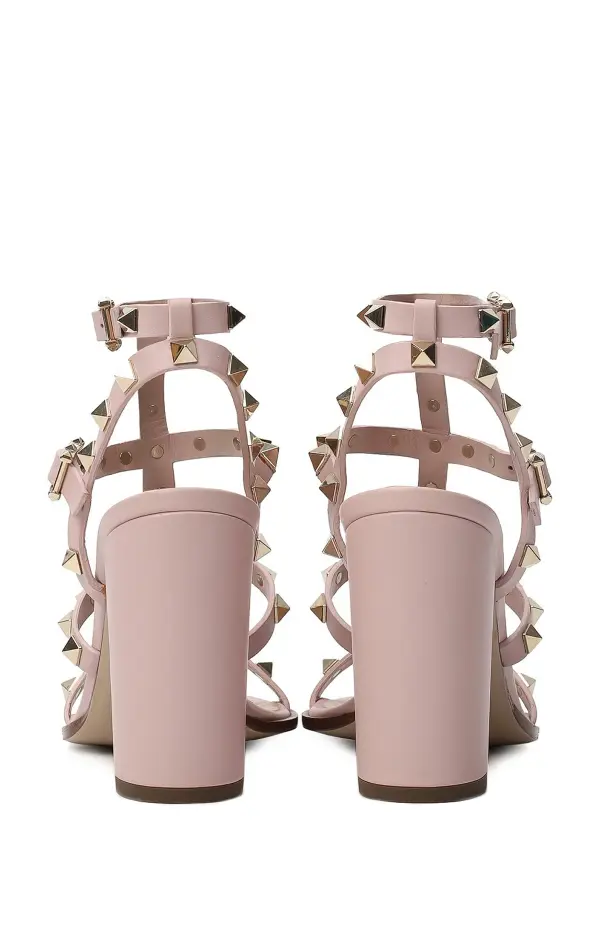 Босоножки Valentino Garavani Rockstud выполнены из мягкой лакированной кожи нежно-розового оттенка. Фирменные ремешки с золотистыми пирамидальными шипами подчеркивают утончённый силуэт и придают образу характерный акцент бренда. Устойчивый блочный каблук обеспечивает комфорт при носке, а регулируемые пряжки позволяют идеально подогнать посадку. Идеальны для вечерних выходов и элегантных дневных образов.