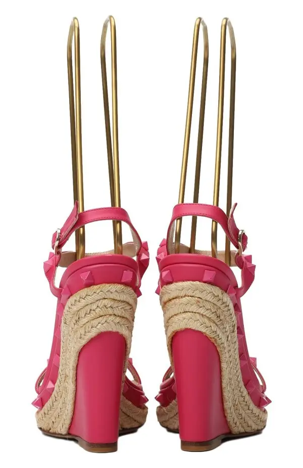 Босоножки Valentino выполнены из ярко-розовой кожи и украшены фирменными шипами Rockstud в тон. Модель на эффектной танкетке, декорированной джутовой оплёткой, сочетает в себе изящество и дерзость. Удобная застёжка на пряжку обеспечивает идеальную посадку, а устойчивая подошва делает обувь комфортной для повседневной носки летом.