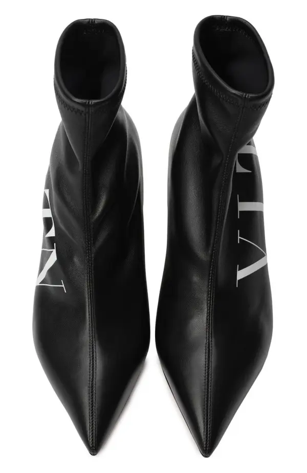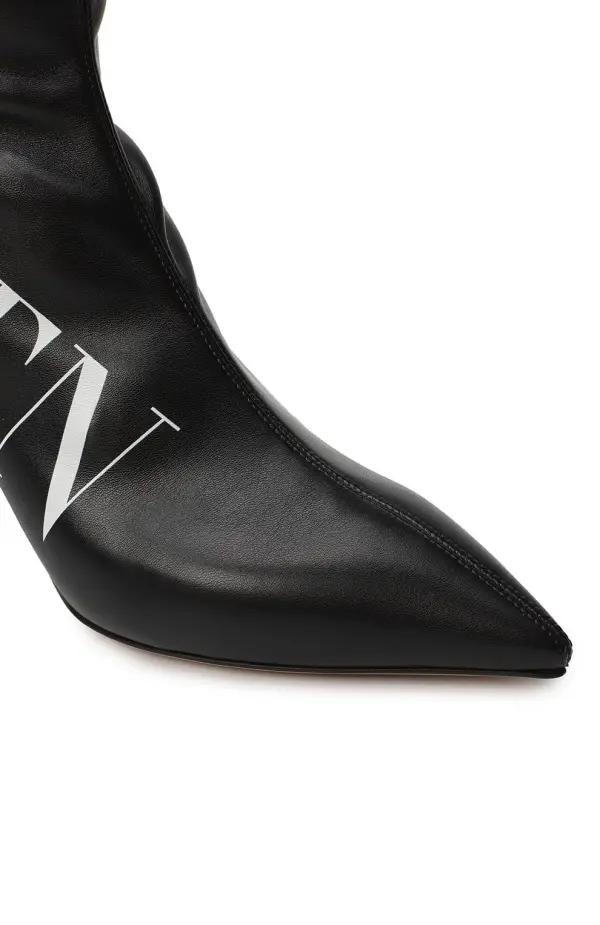 Ботильоны VLTN от Valentino выполнены из гладкой кожи и украшены крупным фирменным принтом, придающим модели дерзкий и современный характер. Заострённый мыс и изящный каблук kitten heel подчеркивают элегантность силуэта, а мягкий голенище-чулок обеспечивает комфортную посадку. Такая пара станет эффектным акцентом в повседневном или вечернем образе, органично сочетаясь как с юбками и платьями, так и с джинсами.