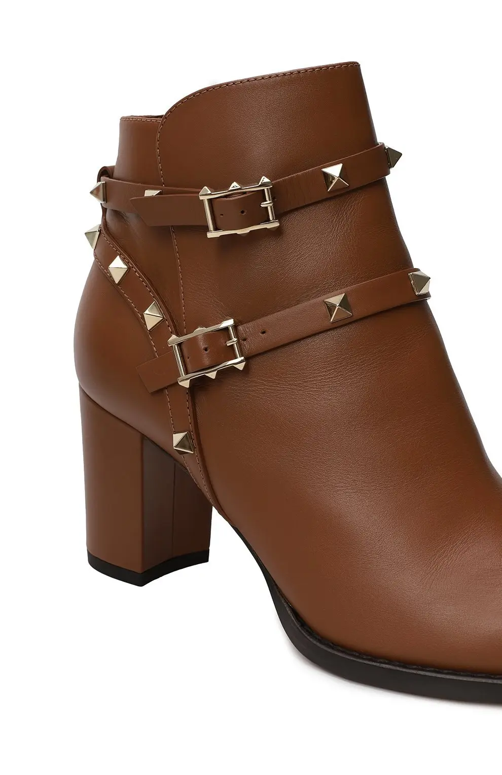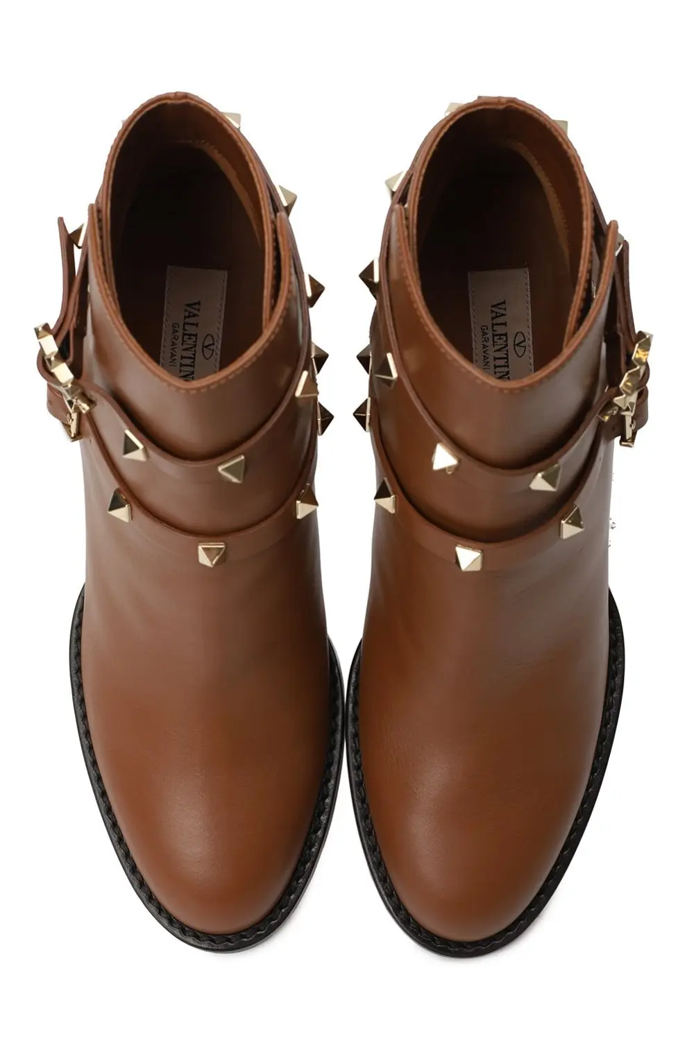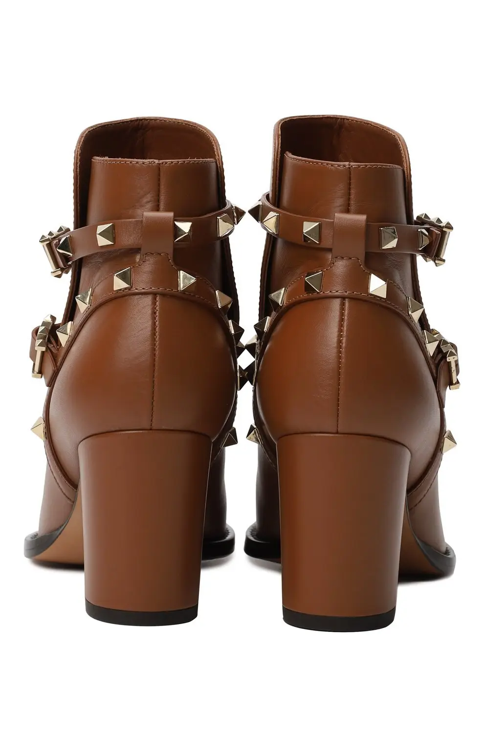 Ботильоны Rockstud Valentino выполнены из гладкой коричневой кожи и украшены фирменными ремешками с металлическими пирамидальными заклепками, которые придают модели характерный бунтарский акцент. Устойчивая средняя высота каблука обеспечивает комфорт при носке, сохраняя элегантный силуэт. Закругленный нос и минималистичный крой делают ботильоны универсальными для повседневных образов и стильных вечерних выходов. Эта пара соединяет классику и рок-шик, ставя акцент на безупречном итальянском исполнении.