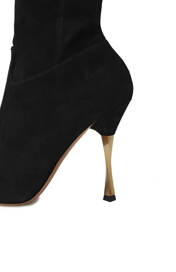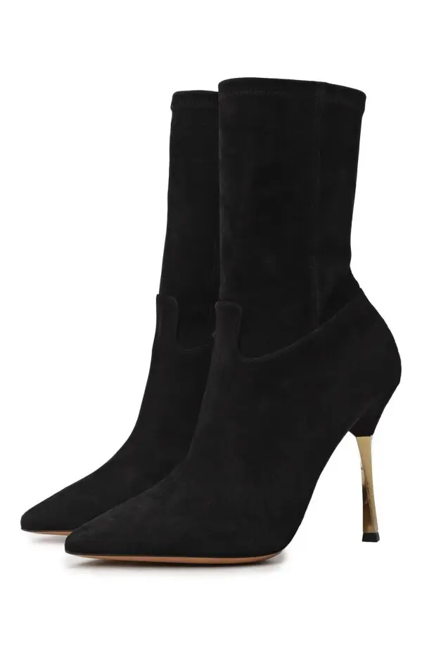 Ботильоны Valentino — изысканное сочетание элегантности и смелого дизайна. Модель выполнена из мягкой черной замши, подчеркивающей утонченность силуэта с заостренным мысом. Особое внимание привлекает изящный золотистый каблук-стилет, придающий обуви современный характер и роскошный акцент. Средняя высота голенища визуально вытягивает ногу, а универсальный черный цвет делает ботильоны идеальным выбором как для вечернего выхода, так и для повседневного образа с ноткой гламура.