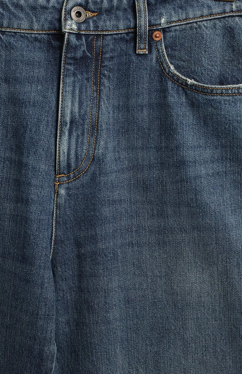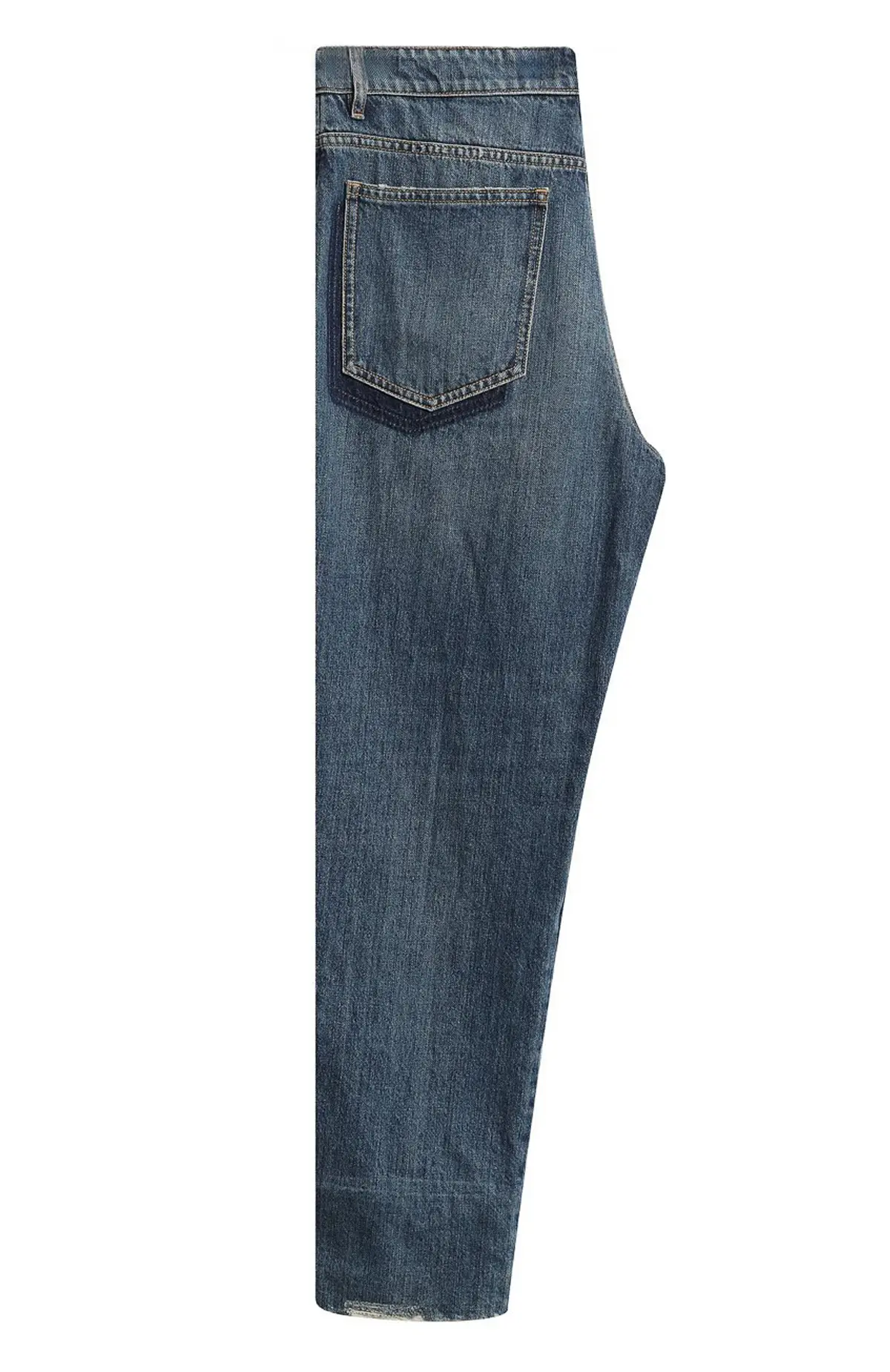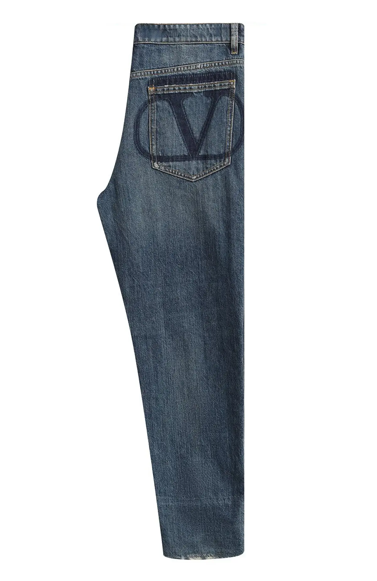 Джинсы Valentino из плотного хлопкового денима синего оттенка. Прямой крой с классической посадкой обеспечивает комфорт и современный силуэт. Легкий эффект потертостей придаёт модели непринуждённый характер. Универсальная база для повседневных и кэжуал-образов.