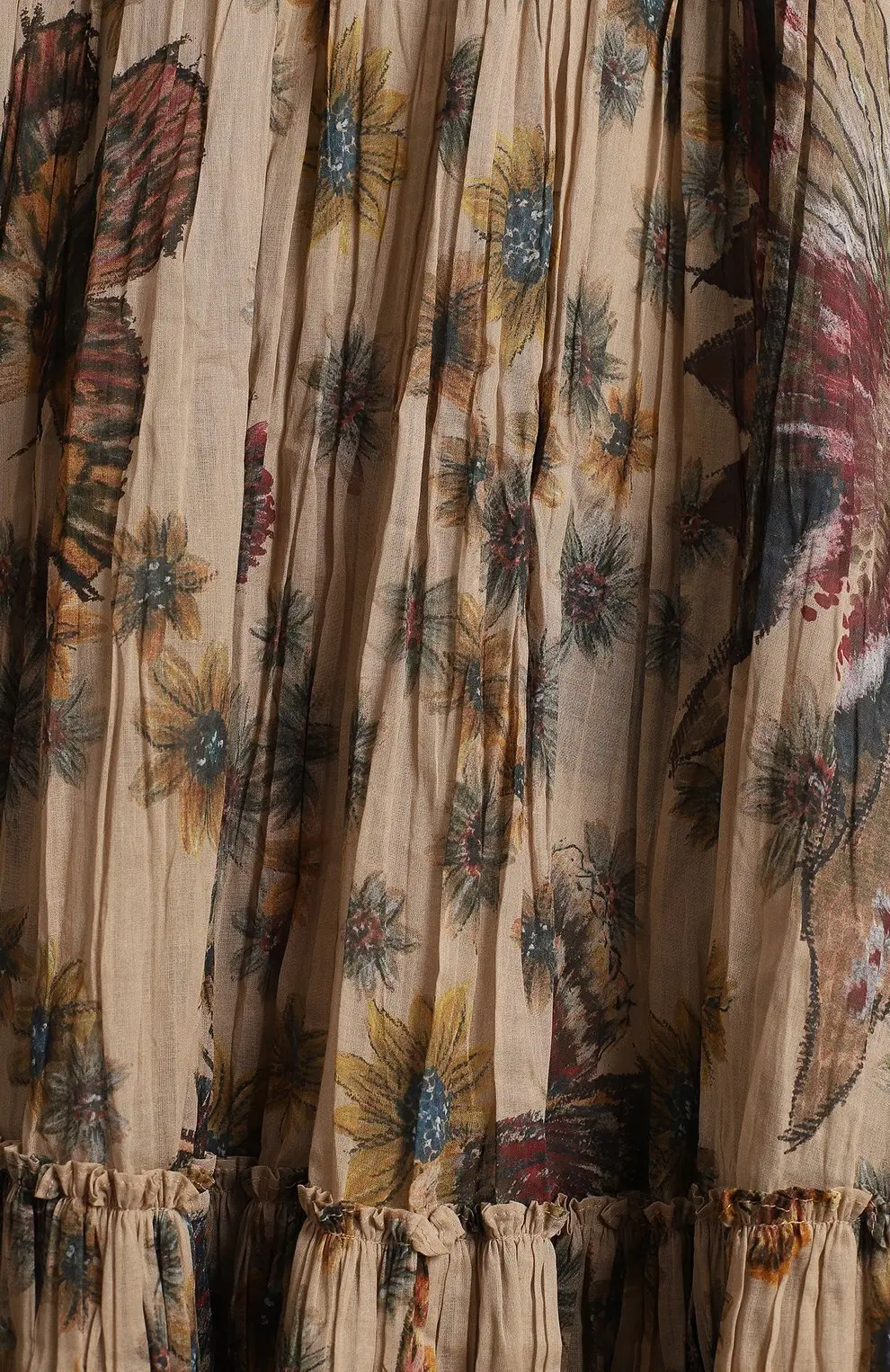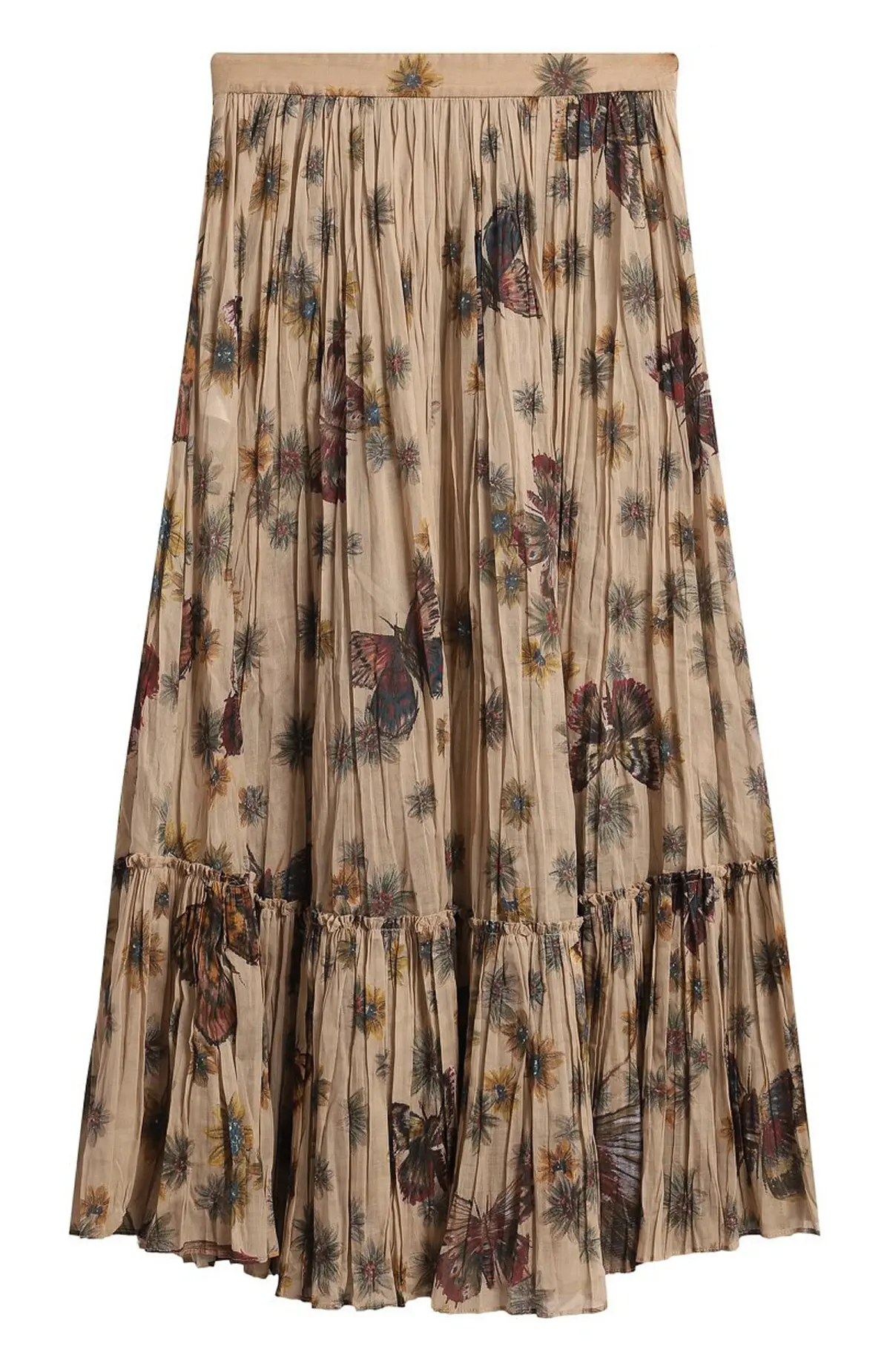 Хлопковая юбка Valentino выполнена из лёгкой ткани с изысканным принтом бабочек и полевых цветов. Плиссированная структура придаёт модели воздушность и мягкое движение при ходьбе. Эластичная линия талии обеспечивает комфортную посадку, а нейтральный бежевый фон подчёркивает насыщенные оттенки рисунка.