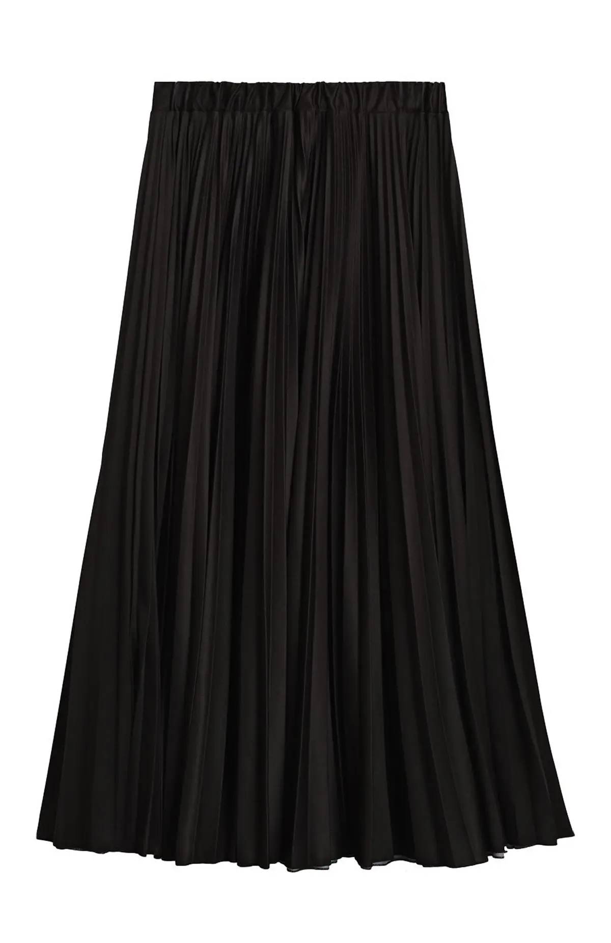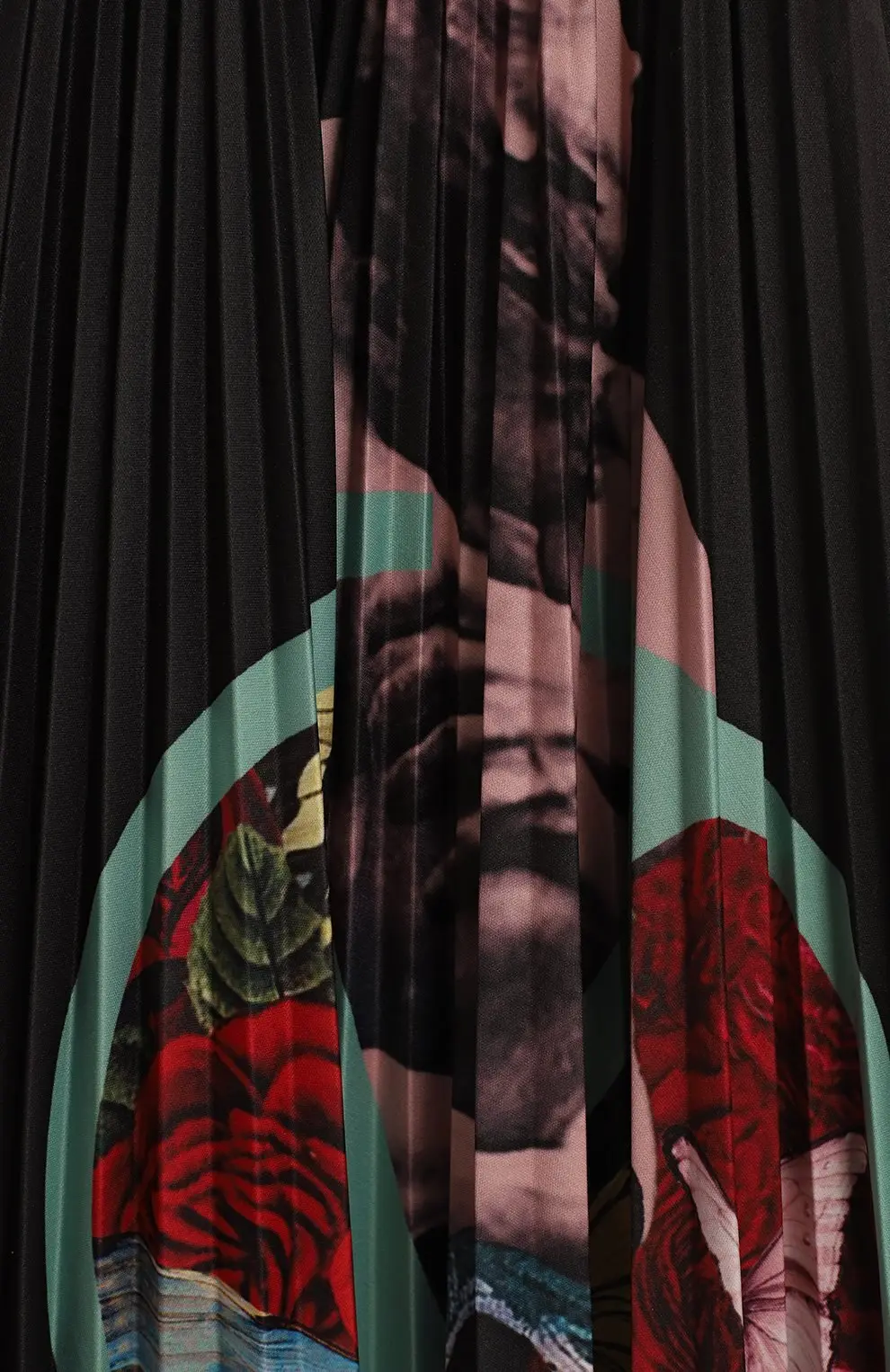 Плиссированная юбка миди из плотной легкой ткани выполнена в глубоким черном цвете. Акцентом модели становится крупный арт-принт с цветочными и фигуративными мотивами, создающий эффект движущегося изображения за счет складок. Лаконичный пояс подчеркивает талию и позволяет сочетать юбку как с базовыми футболками, так и с элегантными блузками.