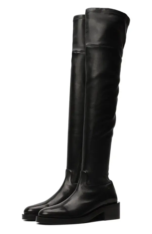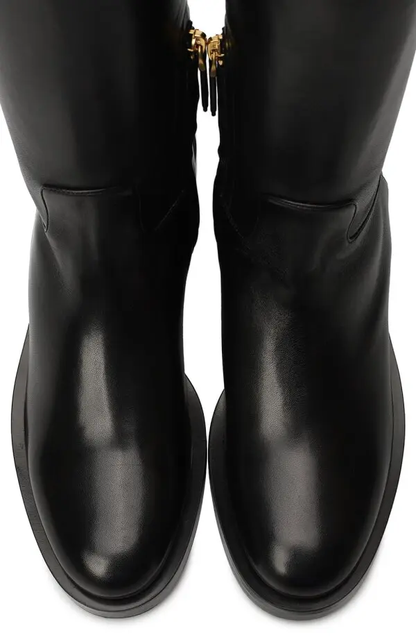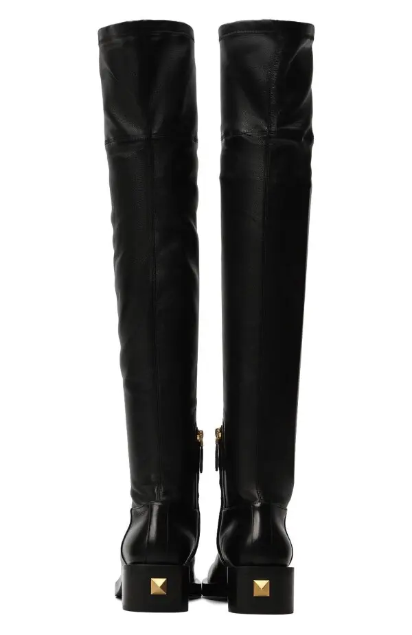 Ботфорты Roman Stud Valentino выполнены из мягкой чёрной кожи с лаконичным силуэтом, доходящим выше колена. Минималистичный дизайн подчёркивает элегантность модели, а гладкая фактура материала придаёт обуви изысканный вид. Невысокий устойчивый каблук и удобная колодка делают их практичными для повседневной носки, сохраняя при этом стильный акцент. Эти ботфорты легко впишутся как в повседневные, так и в более утончённые образы.