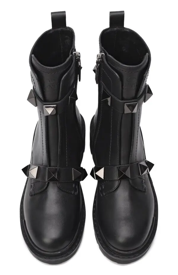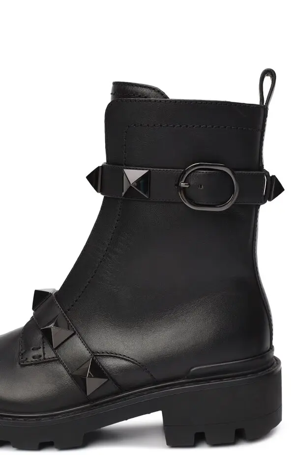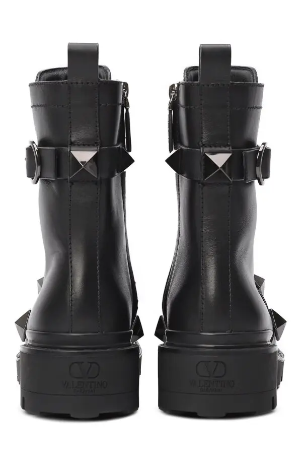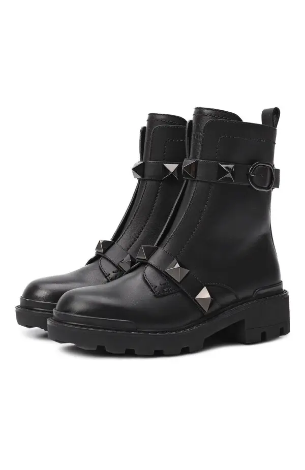 Ботинки Roman Stud Valentino выполнены из чёрной гладкой кожи и оформлены характерными ремешками с крупными пирамидальными заклёпками в тёмном металле. Декоративные ремни создают акцент на минималистичном силуэте, придавая модели дерзкий и современный характер. Толстая рифлёная подошва обеспечивает надёжное сцепление и комфорт при носке, а укороченный фасон делает ботинки универсальными для повседневных и стильных образов.