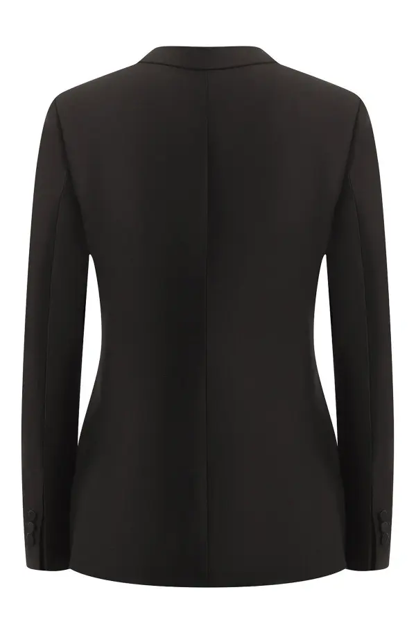 Жакет Valentino из шерсти и шёлка в классическом чёрном цвете. Однобортный крой с лацканами, застёжкой на пуговицу и прорезными карманами. Шерсть дарит тепло и комфорт, а шёлк — мягкость и лёгкий блеск. Идеален для делового или вечернего образа.