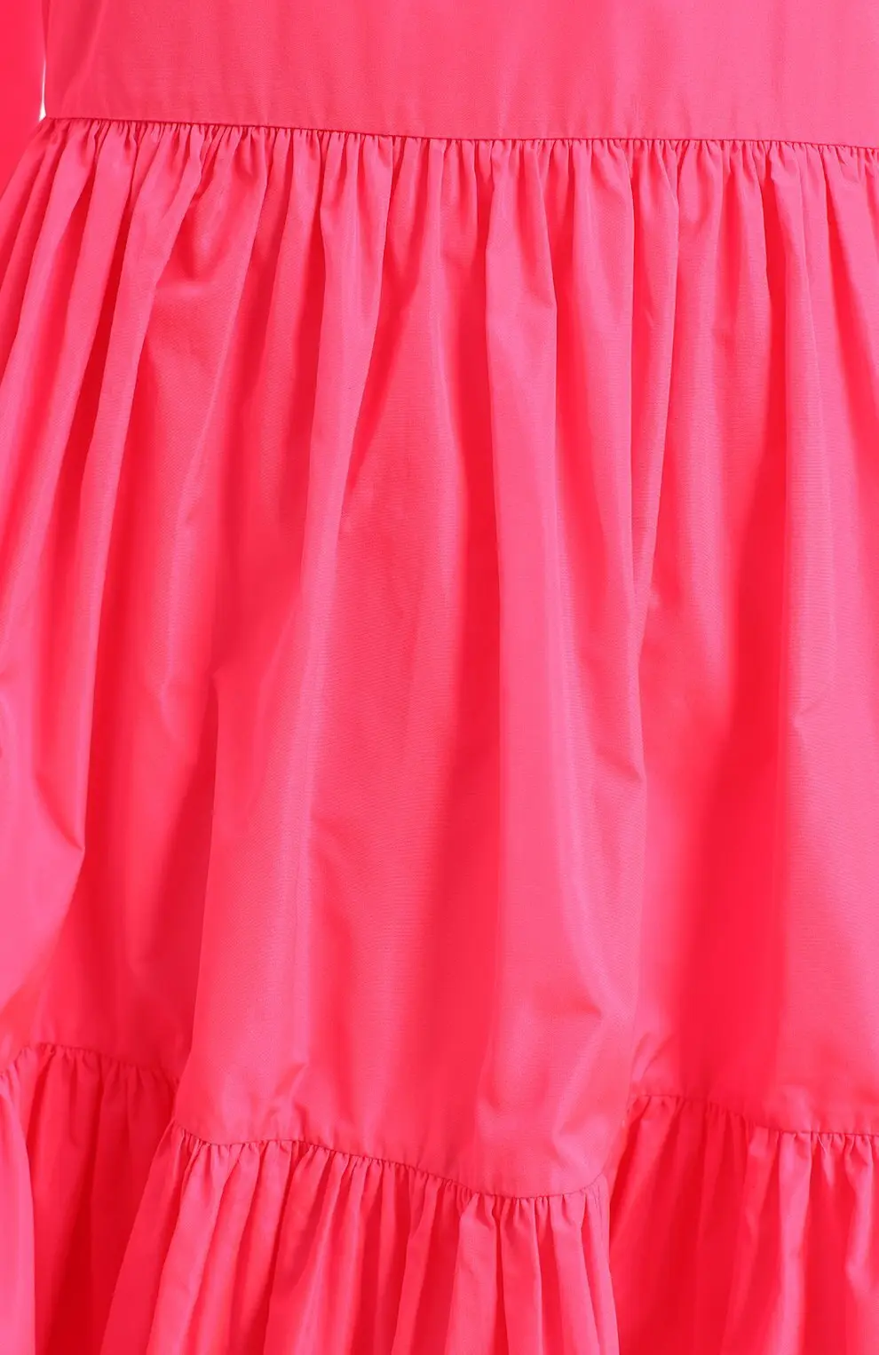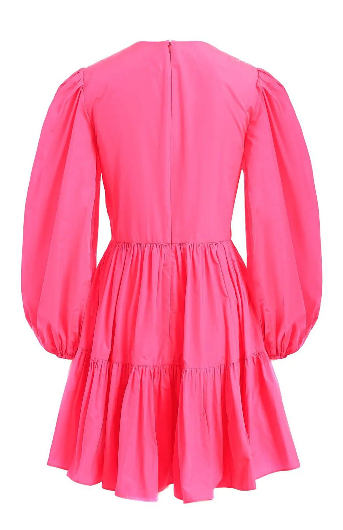 Яркое платье Valentino из лёгкой ткани насыщенного розового оттенка. Объёмные рукава и пышная юбка придают силуэту игривость и лёгкость, создавая выразительный акцент в образе.