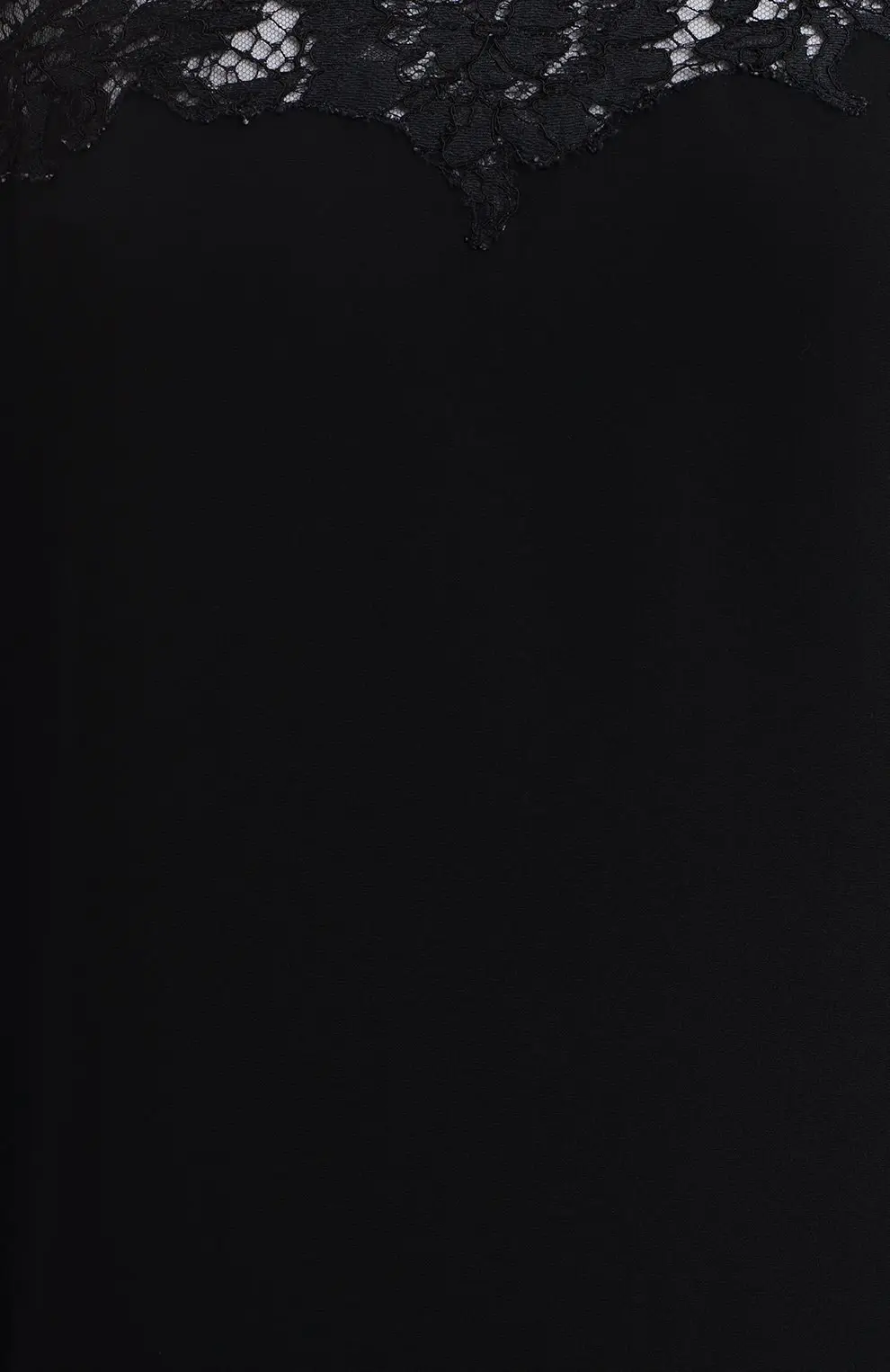 Платье Valentino выполнено из чёрного шелковистого крепа и украшено изысканными кружевными вставками по линии декольте и плеч. Лаконичный прямой силуэт подчеркивает утончённость и элегантность образа, а кружево добавляет нотку романтичности и чувственности.