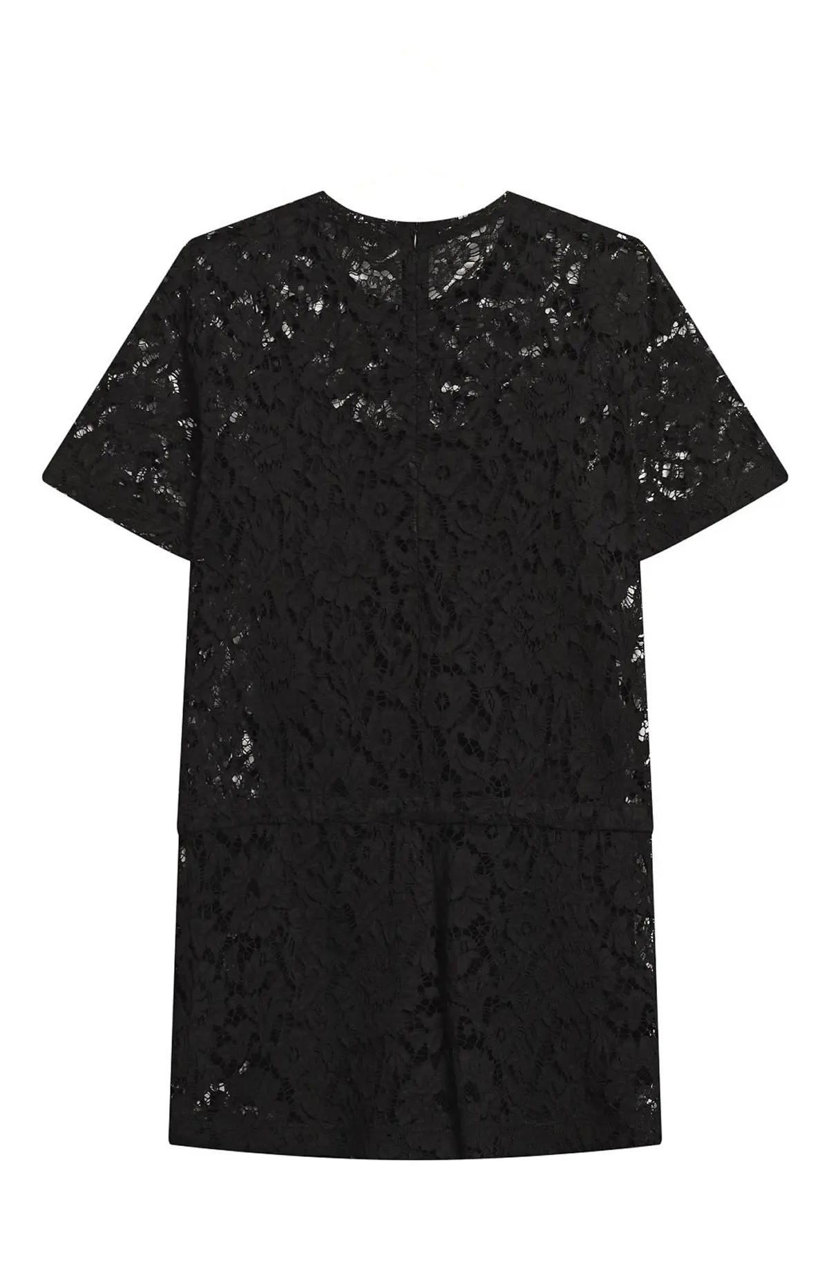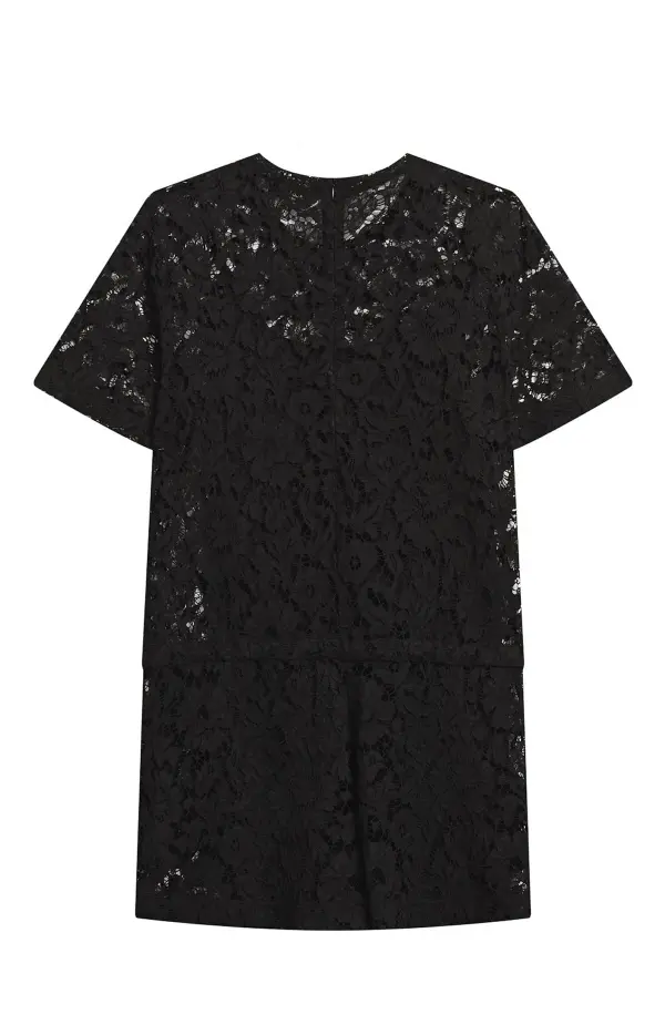 Комбинезон Valentino выполнили из черного кружева с цветочным узором. Модель с короткими рукавами и шнурком на талии украсили контрастным принтом VLTN на груди. Легкая фактура и свободный крой подчеркивают современный характер вещи, которая одинаково органично смотрится и в повседневных, и в вечерних образах.