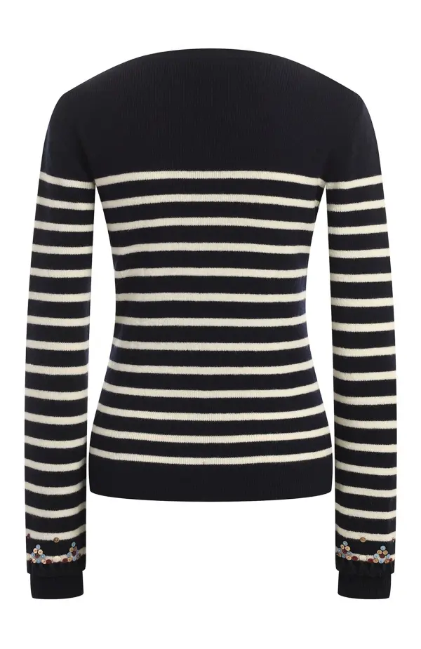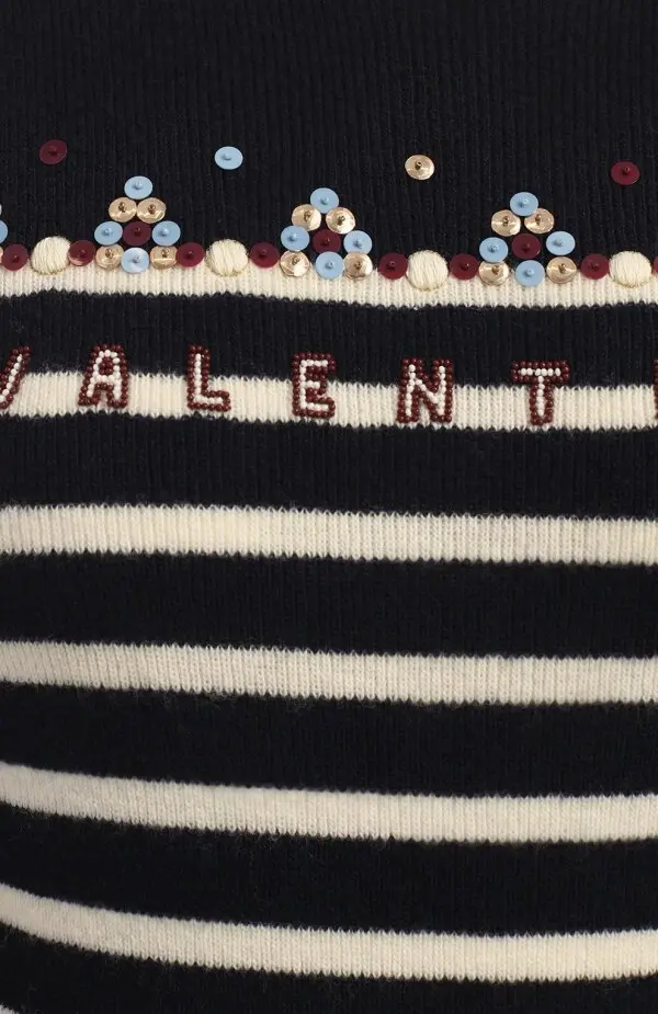 Пуловер Valentino выполнен из мягкой шерсти в классическом морском стиле с чёрно-белой горизонтальной полоской. Модель украшена вышивкой с пайетками и бисером по линии груди и манжет, что придаёт образу изысканный акцент. Лаконичный силуэт с круглым вырезом и длинными рукавами подчеркивает универсальность вещи, а логотип Valentino, встроенный в декоративный орнамент, делает пуловер ещё более выразительным. Отличный выбор для стильных повседневных и нарядных сочетаний.