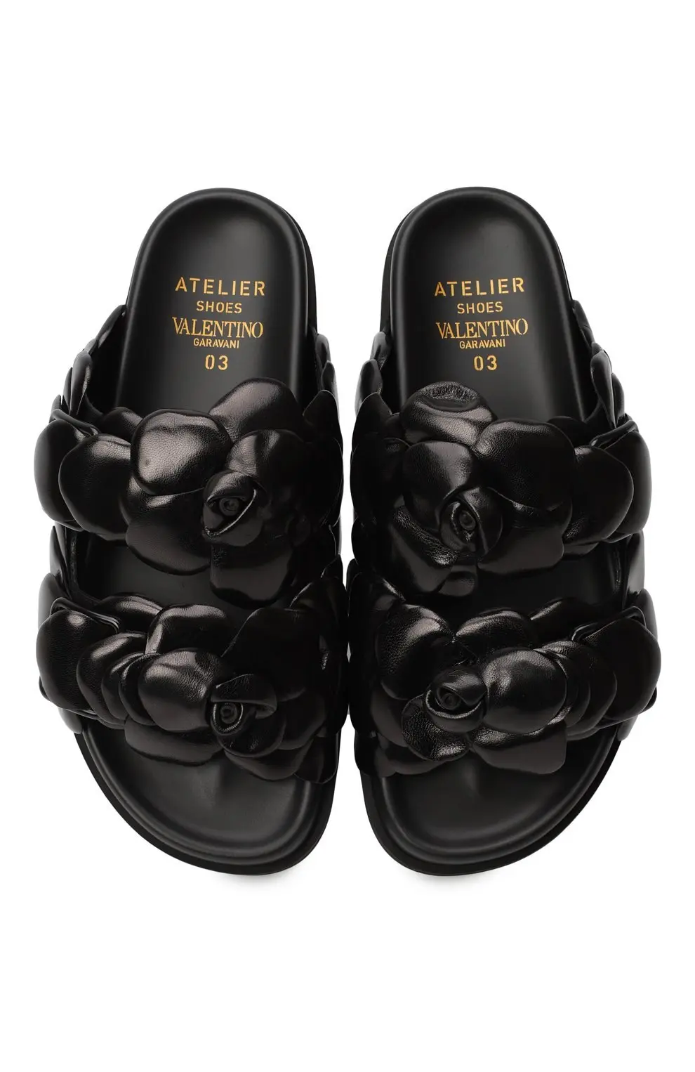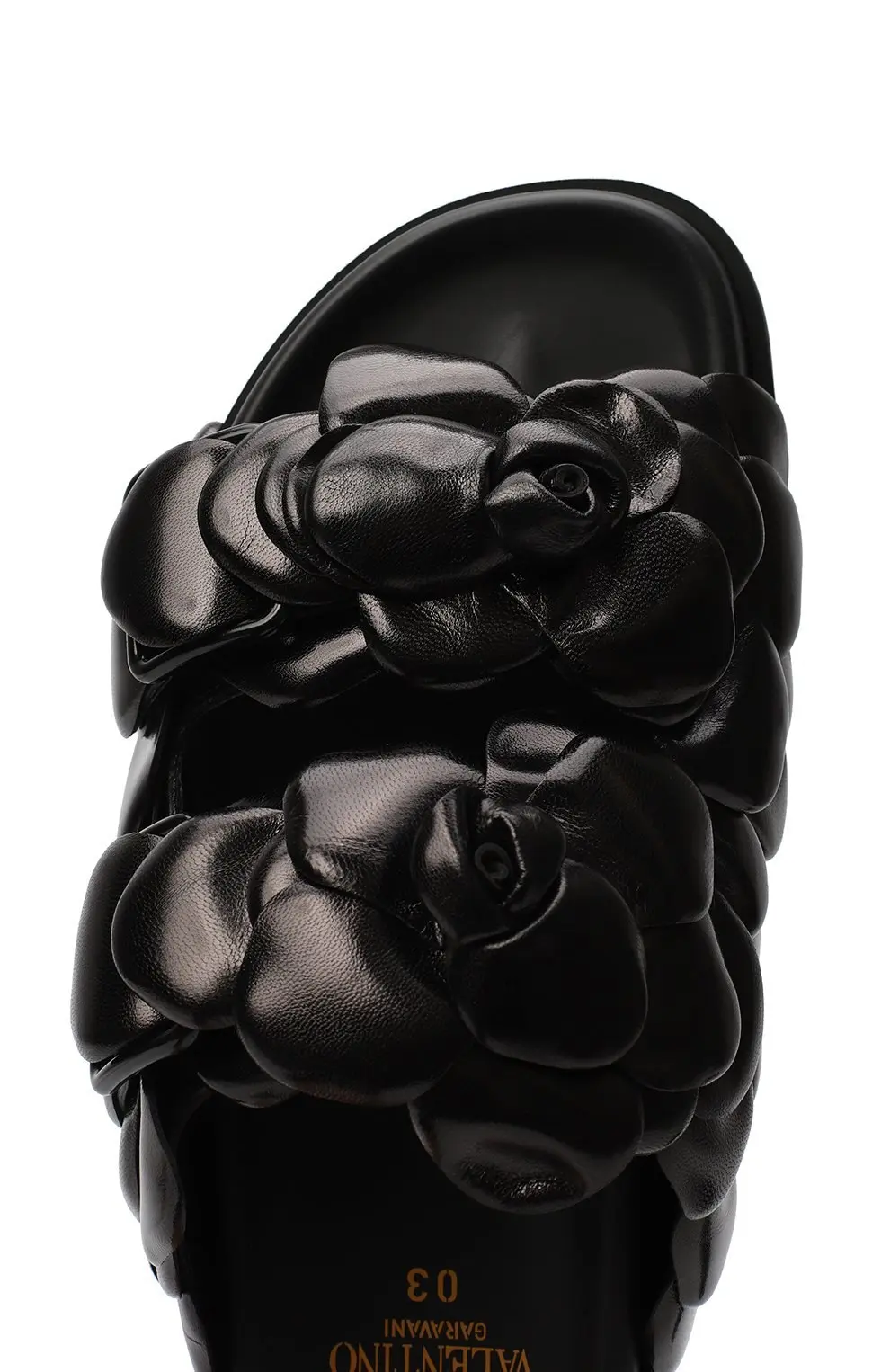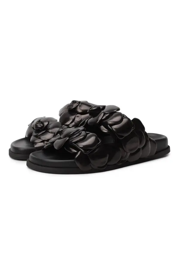 Шлёпанцы 03 Rose Edition от Valentino выполнены из мягкой кожи в чёрном цвете и украшены объёмными лепестками-розами, создающими выразительный скульптурный эффект; широкая перемычка обеспечивает надёжную фиксацию стопы, а анатомически комфортная подошва делает модель удобной для повседневного ношения, сочетая авангардный дизайн и практичность в духе утончённой эстетики Valentino.