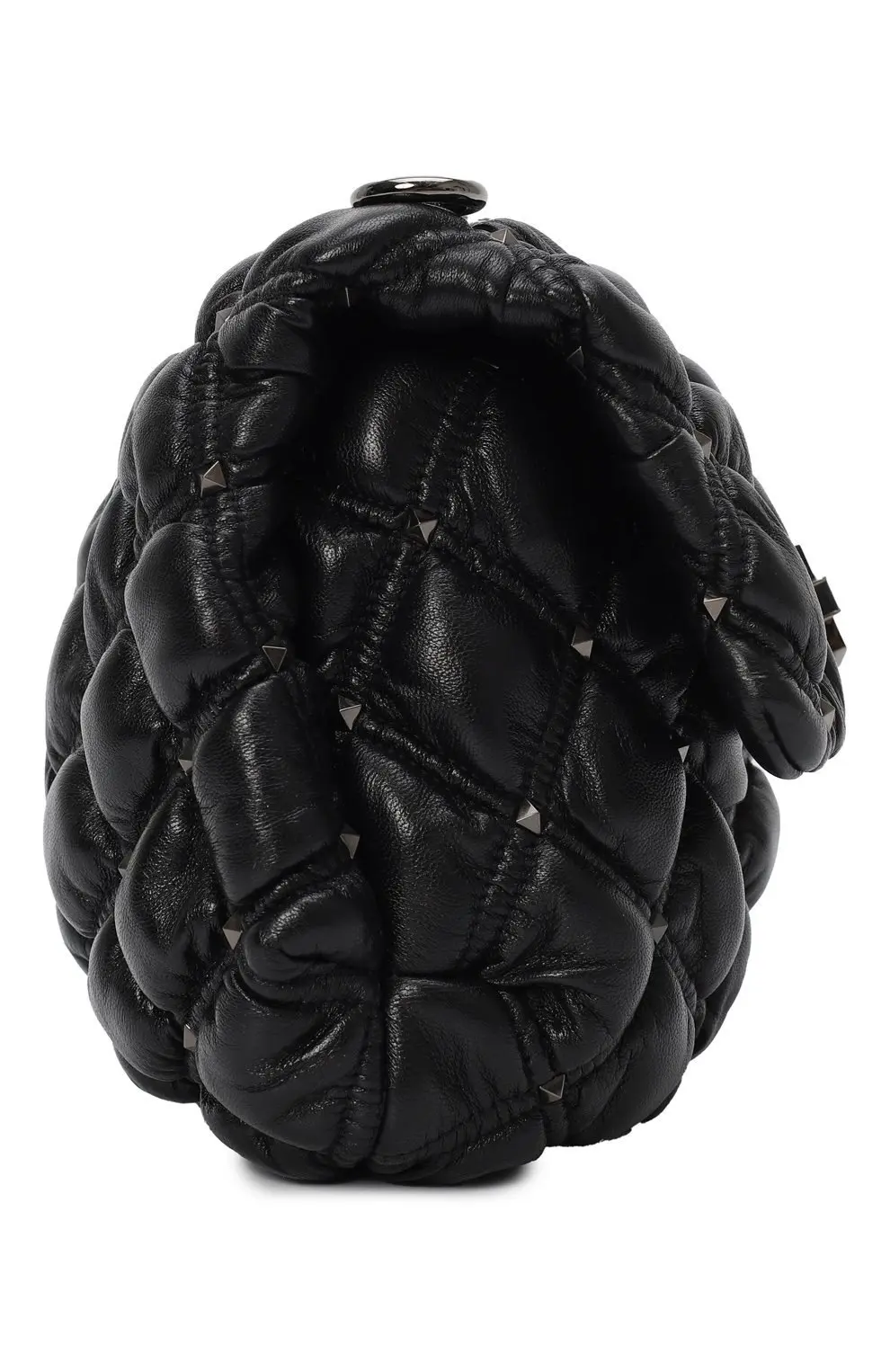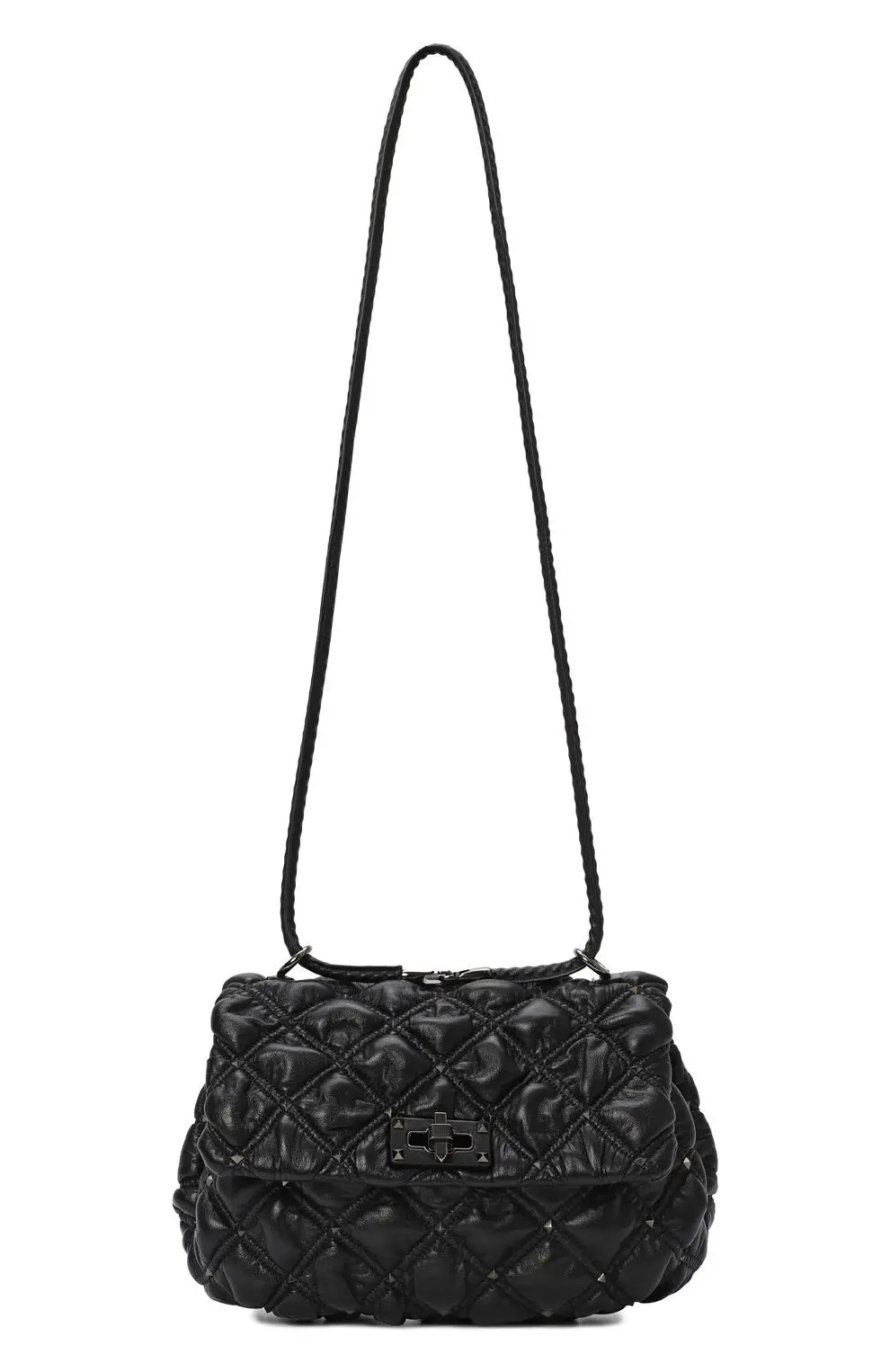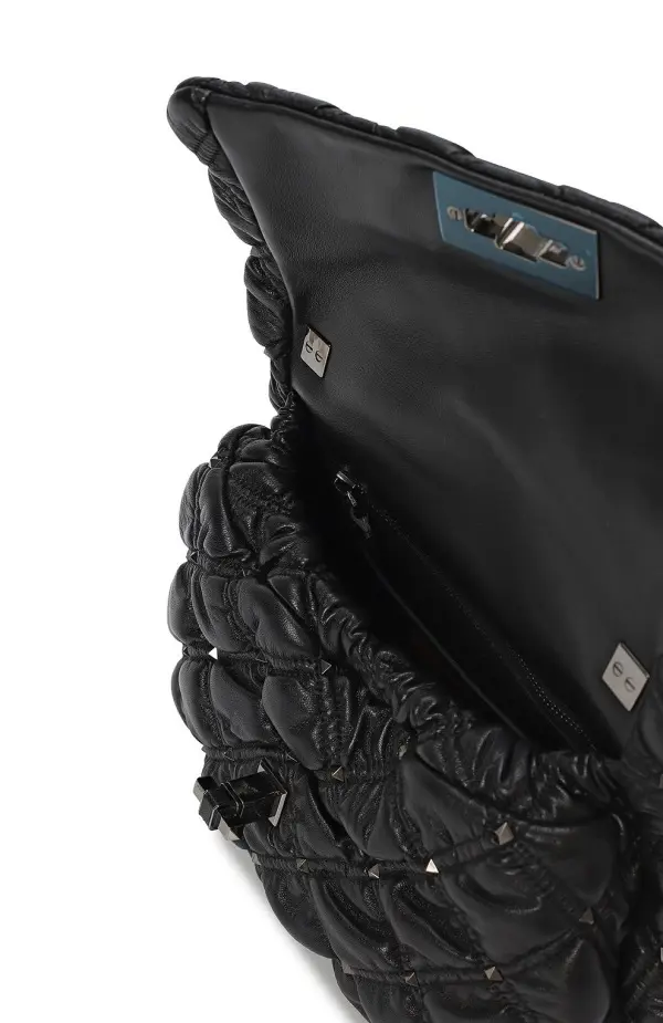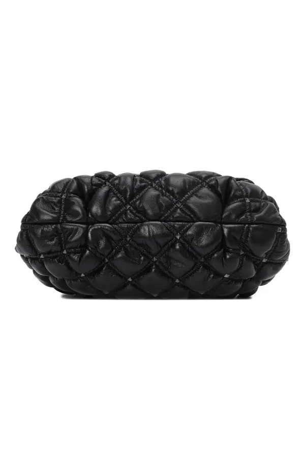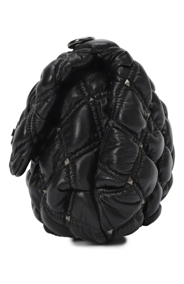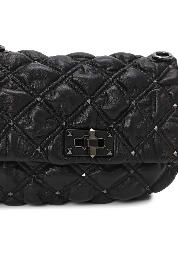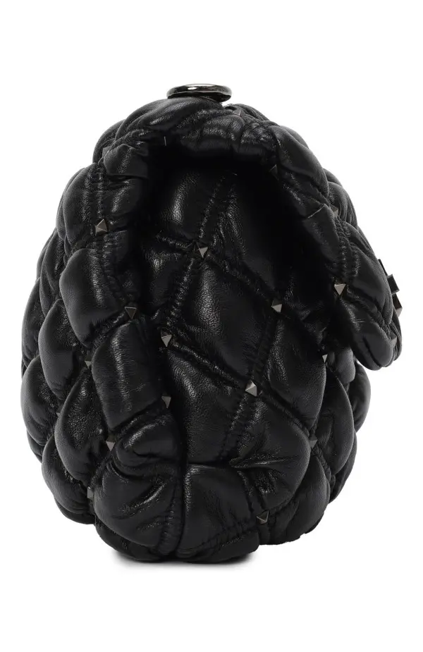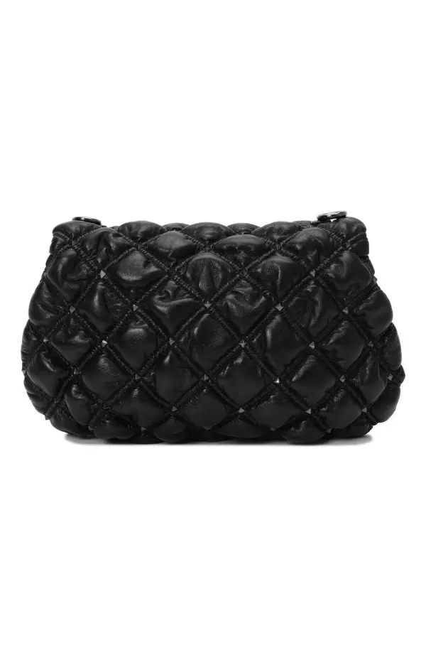 Сумка SpikeMe от Valentino выполнена из мягкой черной кожи с объемной ромбовидной стёжкой. Эффектный акцент создают изящные металлические шипы и поворотный замок с утончённым блеском. Модель дополнена элегантным цепочным ремнём, который позволяет носить аксессуар как на плече, так и через плечо. Сумка гармонично сочетает дерзость и женственность, становясь яркой деталью любого образа.