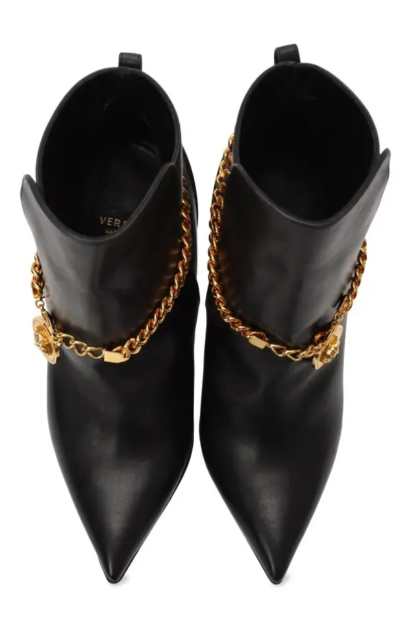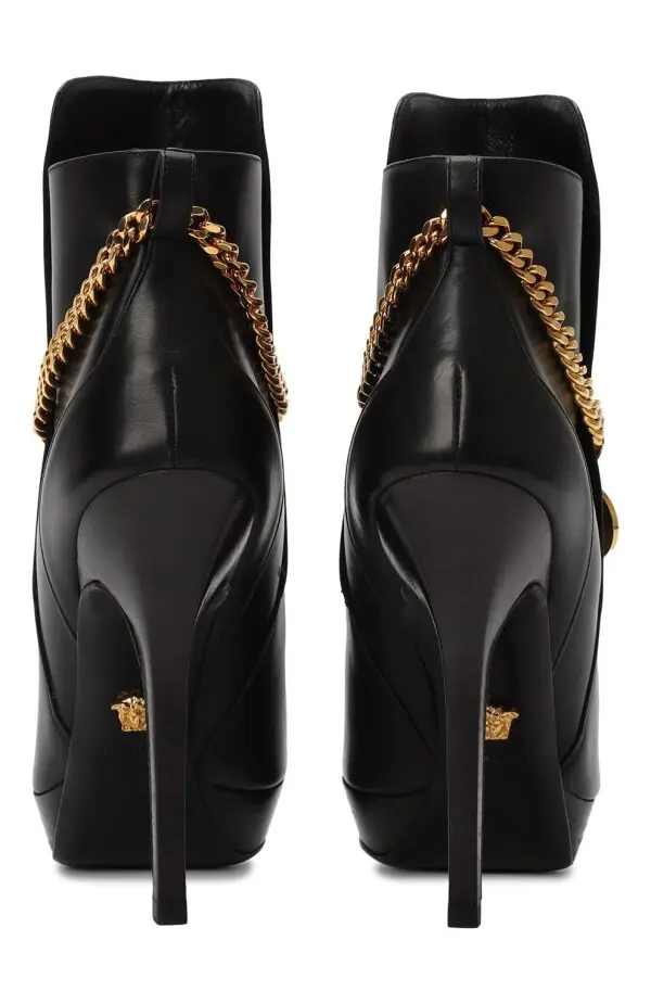 Эти ботильоны от Versace выполнены из гладкой чёрной кожи и дополнены высоким каблуком-шпилькой с платформой, подчеркивающей элегантность силуэта. Изюминкой модели выступает золотая цепочка с подвеской в виде фирменной Медузы, придающая образу роскошный акцент. Благодаря сочетанию минималистичного кроя и эффектного декора, обувь идеально подойдёт для создания яркого вечернего или дерзкого повседневного образа.