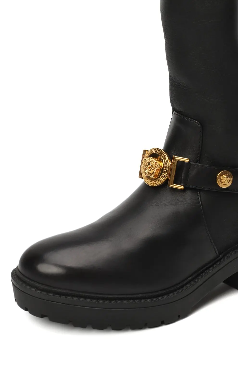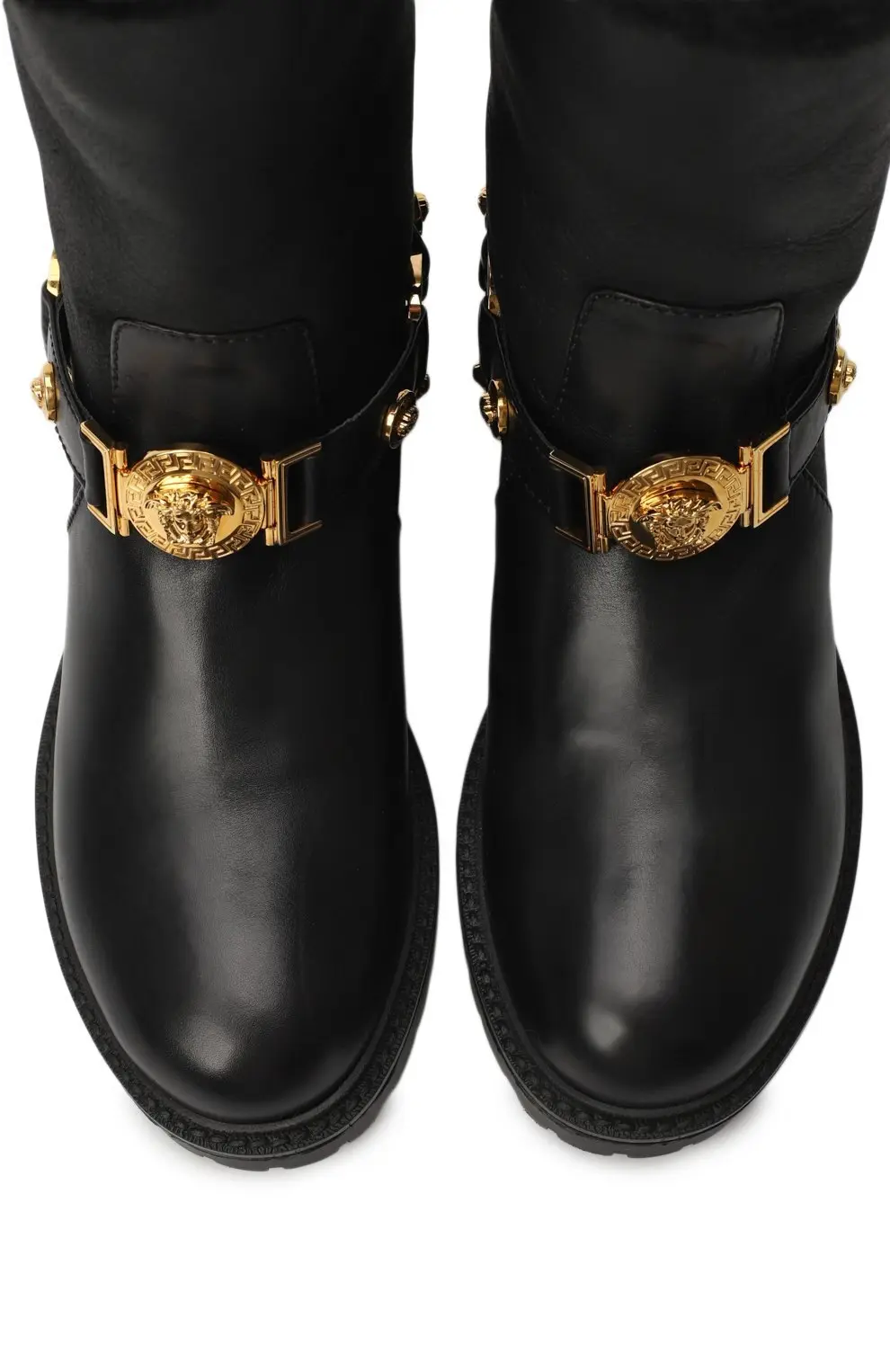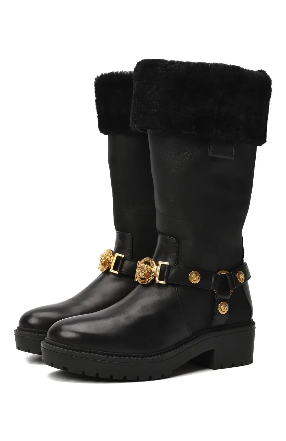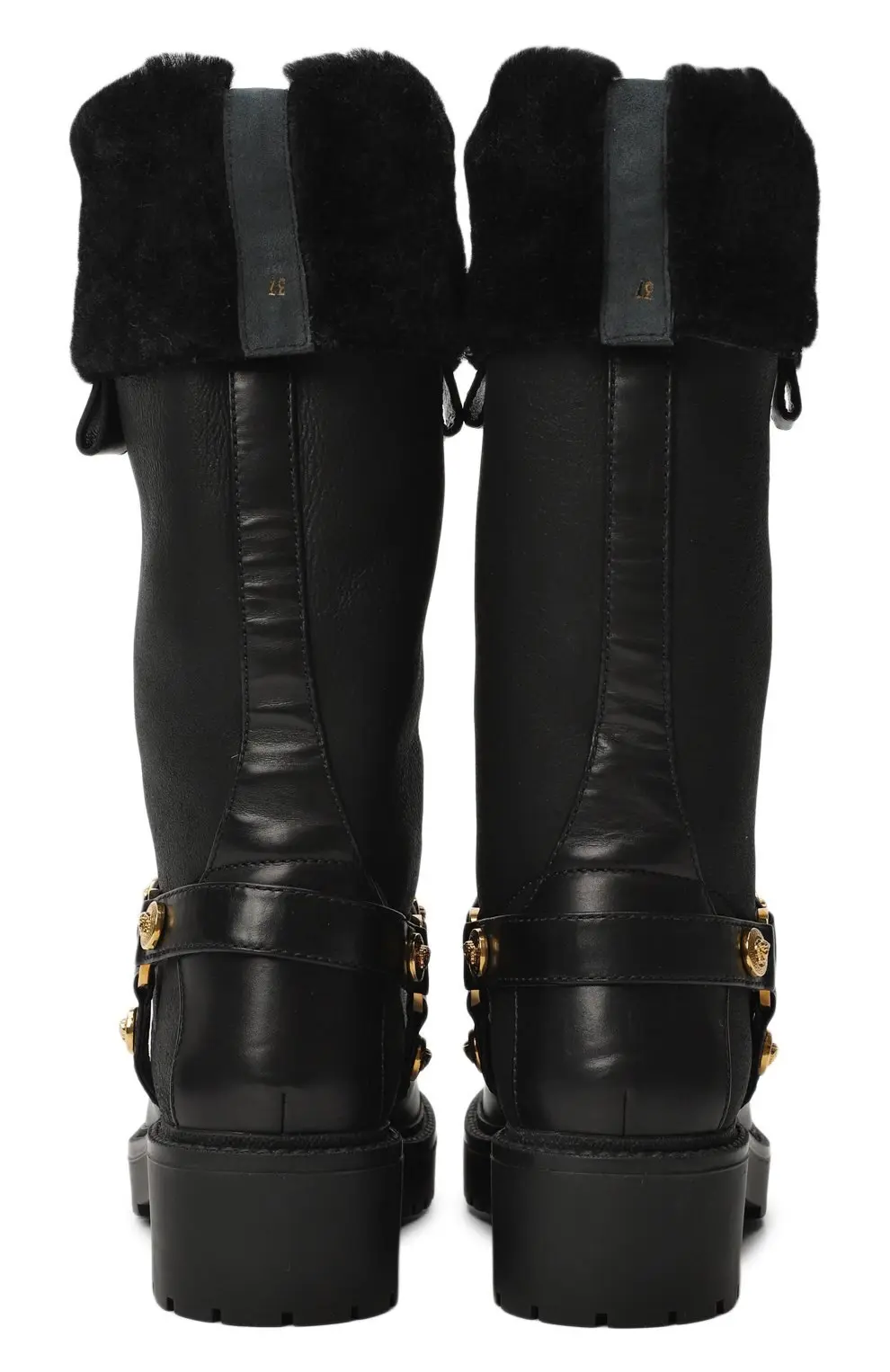 Сапоги Medusa Versace выполнены из мягкой черной кожи с отворотом из меха. Декорированы культовыми золотистыми элементами с головой Медузы и греческим орнаментом. Устойчивая подошва с протектором и удобный каблук придают модели практичность, сохраняя эффектный роскошный стиль бренда.