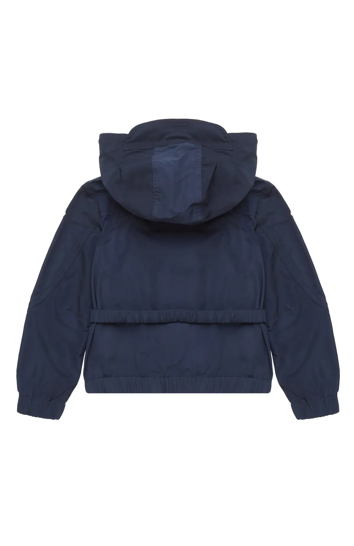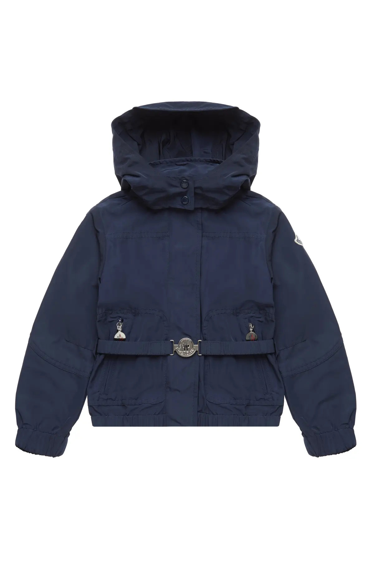 Ветровка выполнена из гладкого плотного материала тёмно-синего оттенка с лёгким матовым блеском. Модель дополнена объёмным капюшоном, карманами на молнии и поясом с декоративной пряжкой, который подчёркивает силуэт. Эластичные манжеты и удобная посадка обеспечивают комфорт и защиту от ветра.