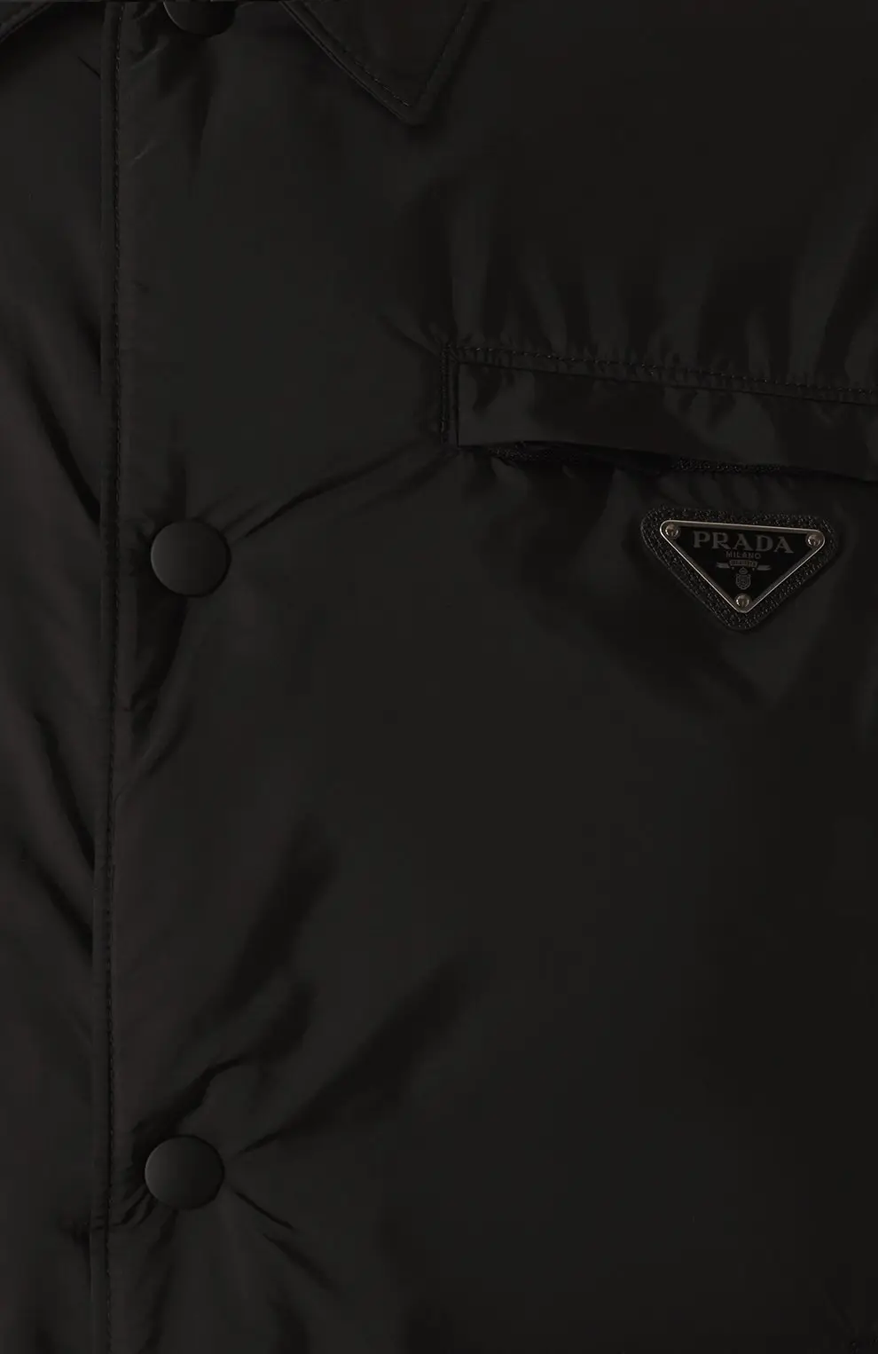 Куртка Prada выполнена из плотного полиамида чёрного цвета, отличающегося лёгкостью и устойчивостью к износу. Модель с лаконичным кроем дополнена классическим воротником, застёжкой на кнопки и нагрудным карманом с эмалированным треугольным логотипом бренда. Минималистичный дизайн в фирменной эстетике Prada делает изделие универсальным элементом современного гардероба.