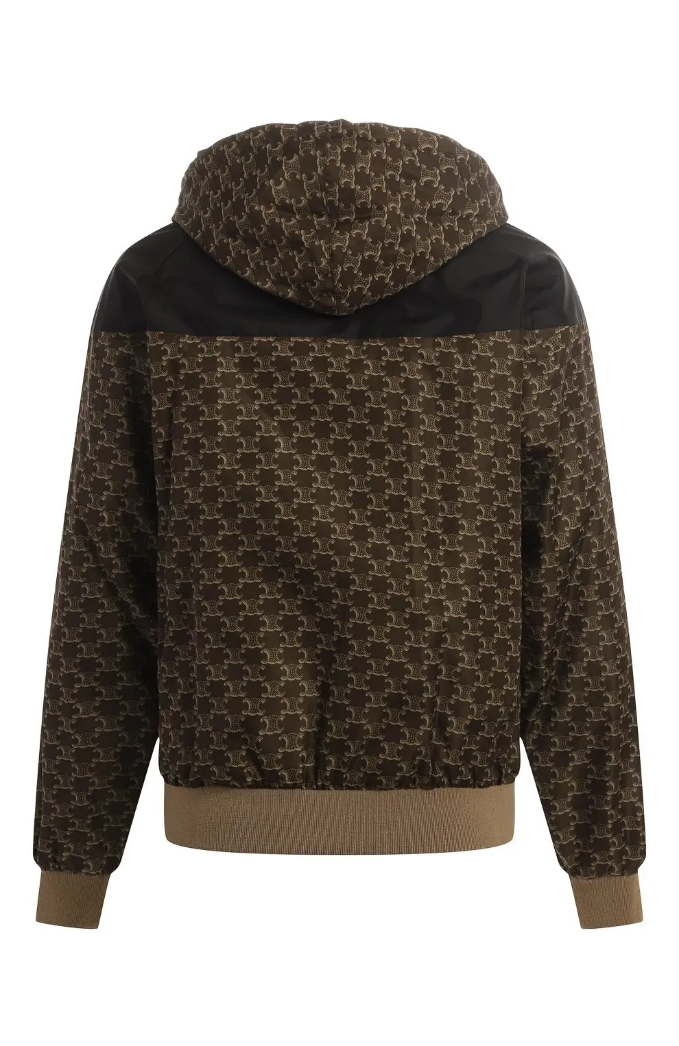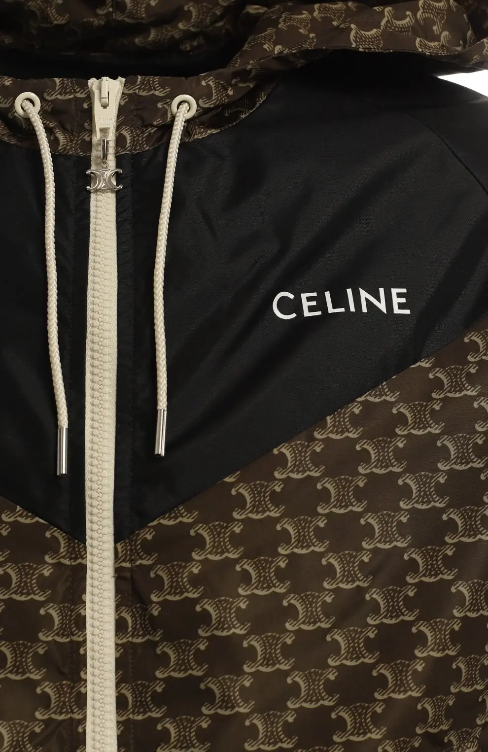 Эта ветровка Celine выполнена в спортивно-элегантном стиле и украшена фирменным узором с монограммой Triomphe. Контрастные вставки на груди подчёркивают динамичный силуэт, а брендовый логотип добавляет современный акцент. Модель оснащена капюшоном со шнурками, застёжкой-молнией по всей длине и эластичными манжетами и поясом для комфортной посадки. Лёгкий материал обеспечивает удобство и практичность, делая ветровку универсальным элементом повседневного гардероба.