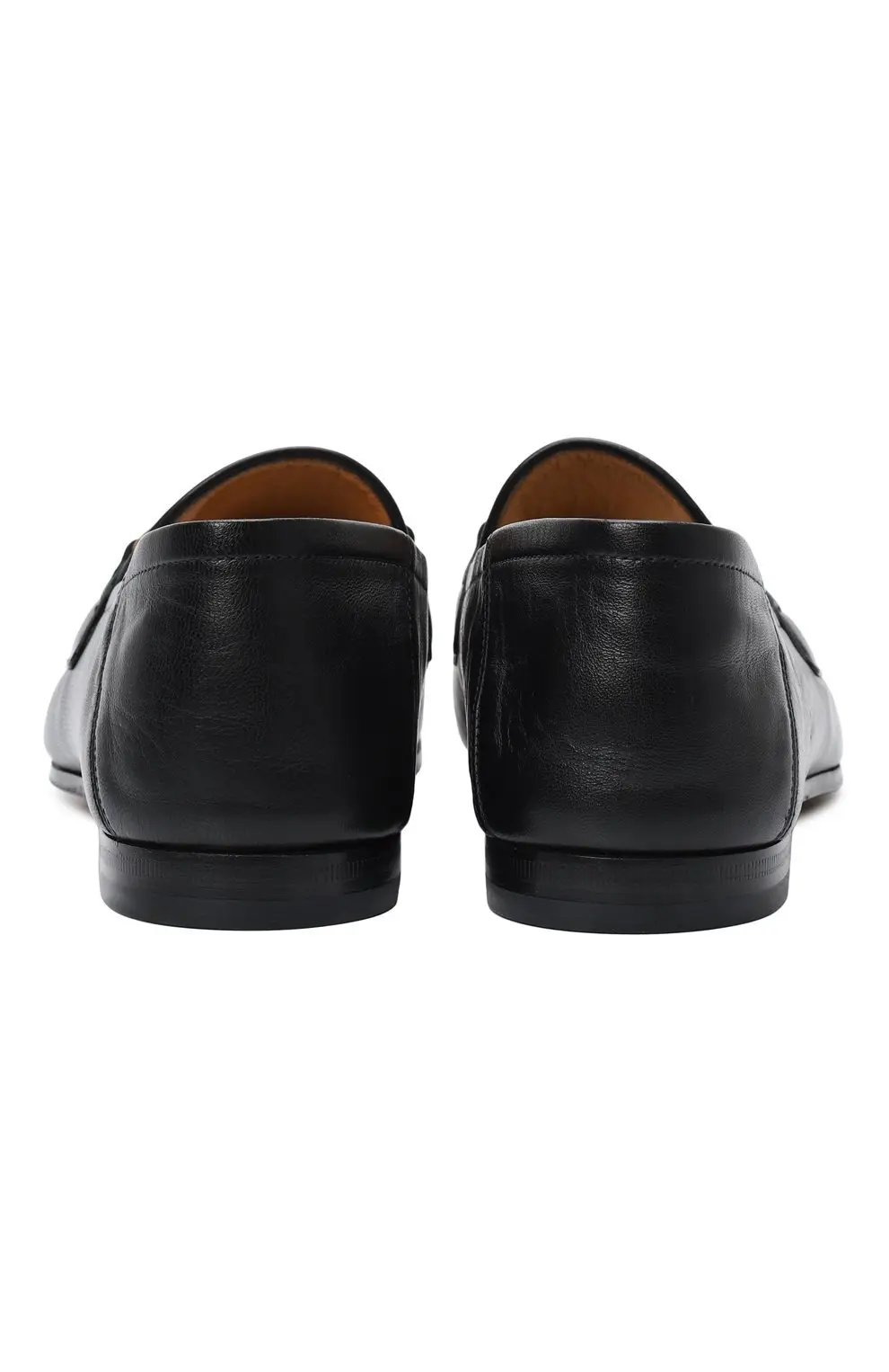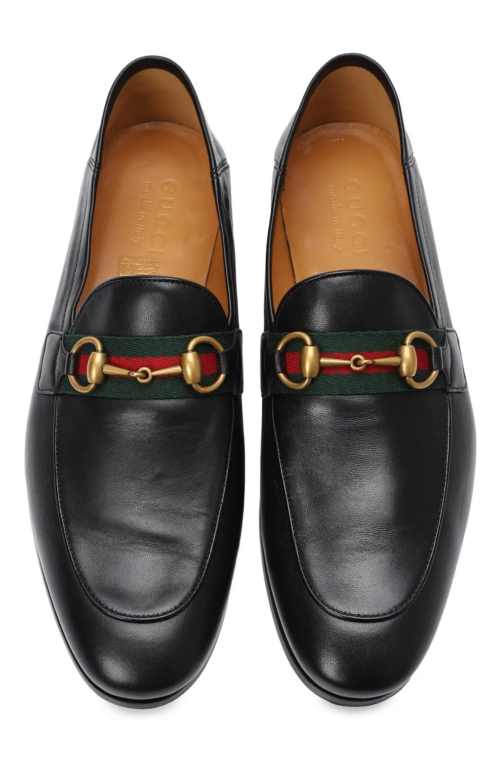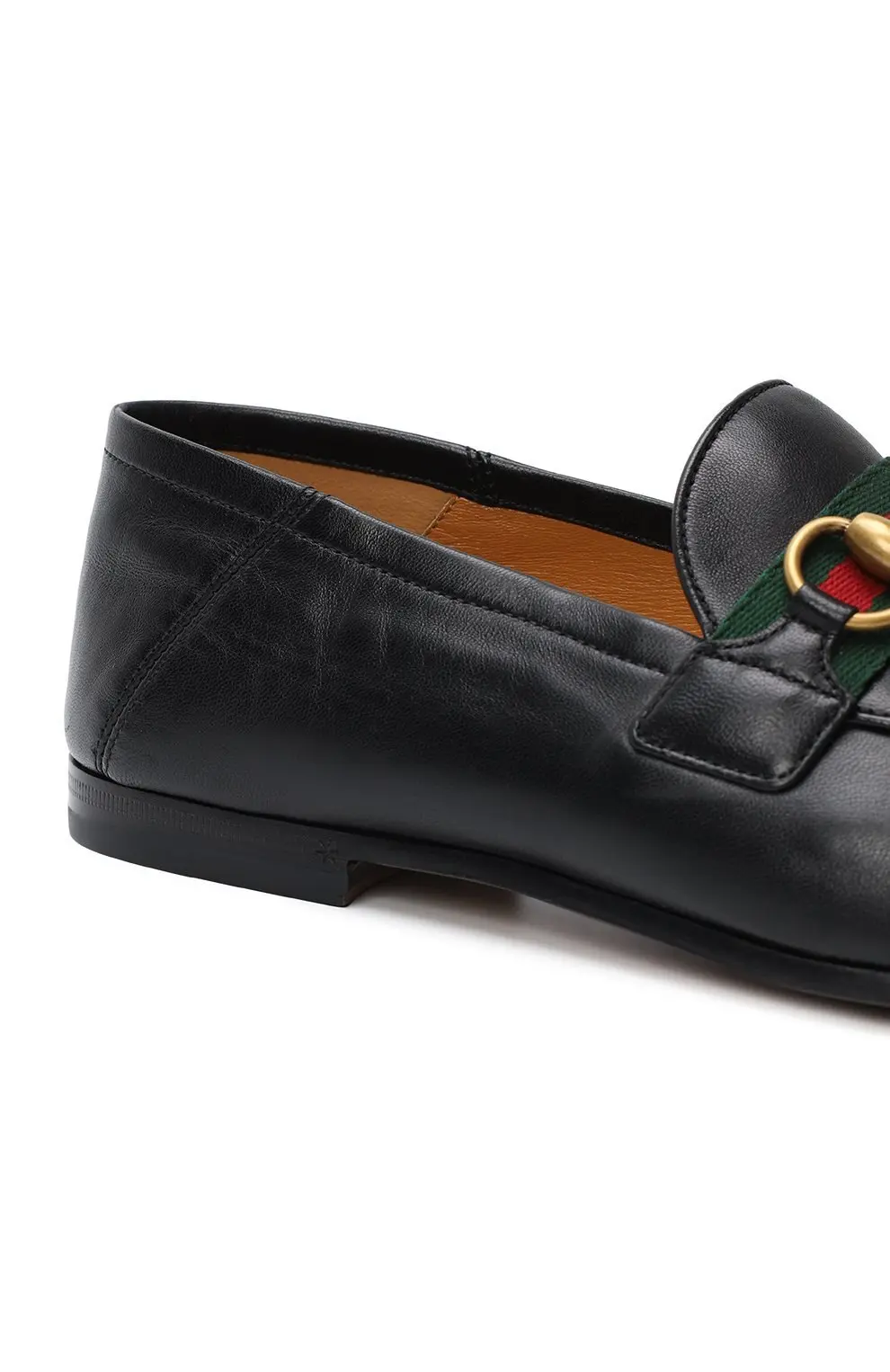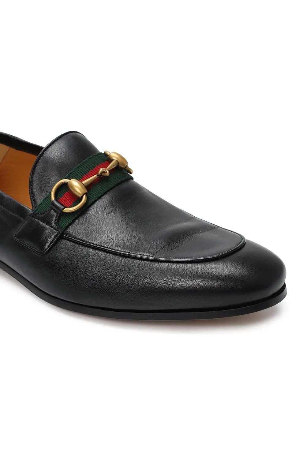 Лоферы Gucci Horsebit — культовая модель бренда, выполненная из мягкой чёрной кожи. Отличительная деталь — металлическая пряжка в виде упряжи (horsebit) с фирменной лентой Web в зелёно-красных тонах. Классическая форма с миндалевидным носком и кожаной подошвой делает пару универсальной для делового и повседневного образа.