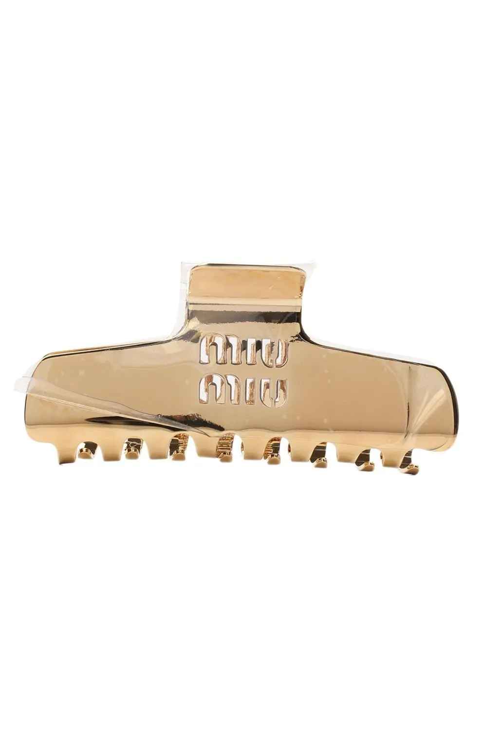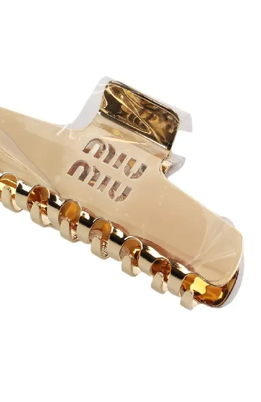 Заколка выполнена из металла с зеркальным золотистым блеском. Лаконичная форма дополнена тиснённым логотипом, подчёркивая минималистичный и элегантный характер аксессуара.