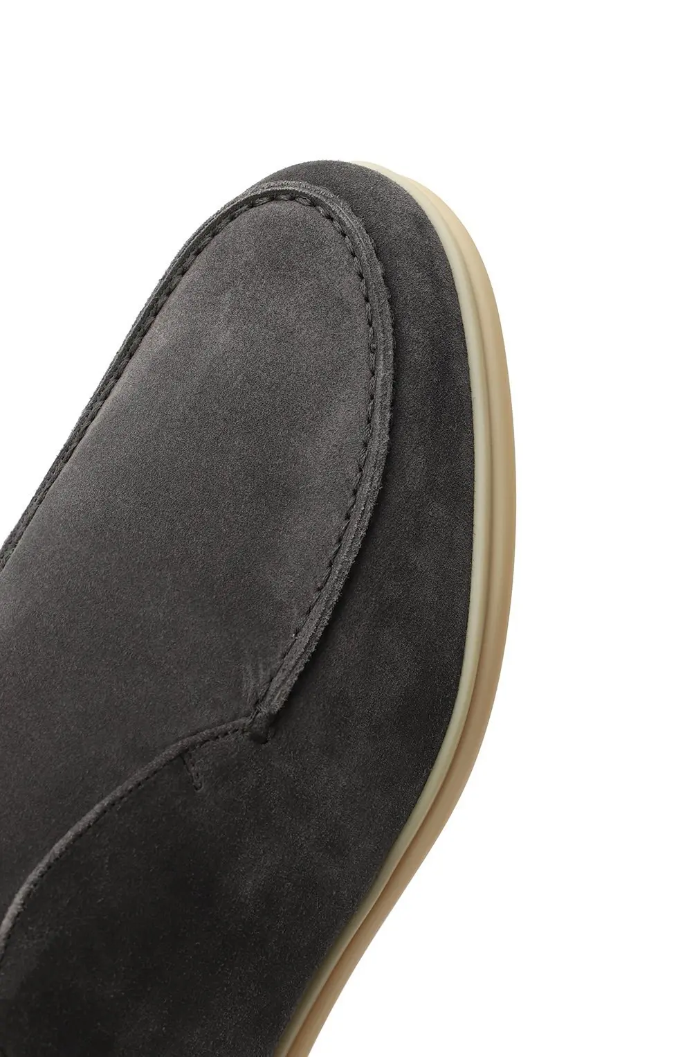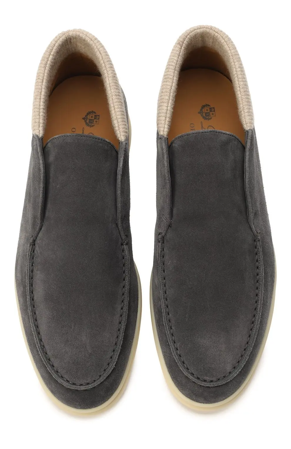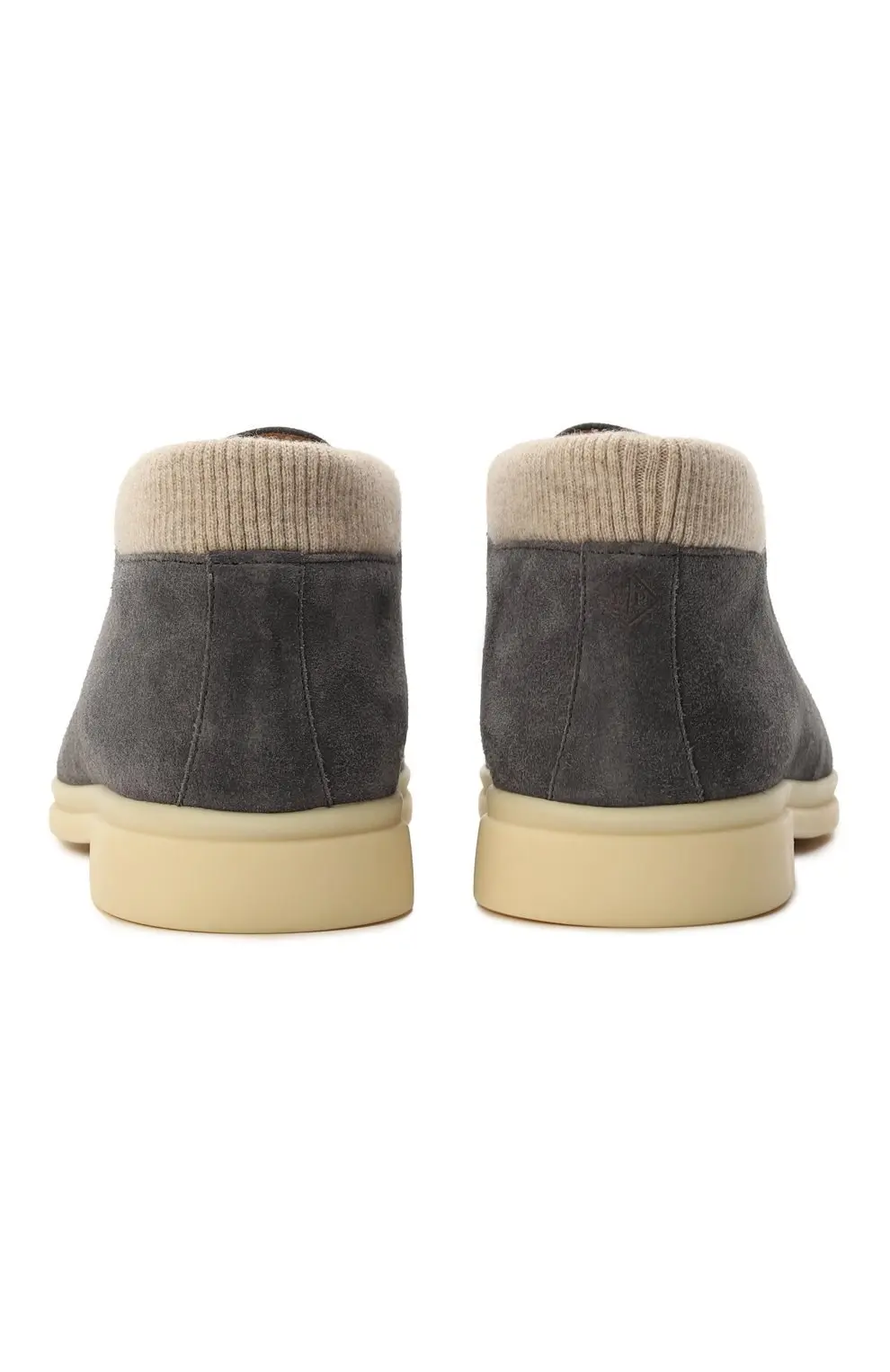 Ботинки Open Wintery Walk от Loro Piana изготовлены из мягкой замши глубокого серого оттенка и дополнены теплой вязаной вставкой по верхнему краю, что делает их удобными для холодного сезона. Легкая подошва обеспечивает комфорт при ходьбе, а минималистичный дизайн подчеркивает элегантный стиль бренда.
