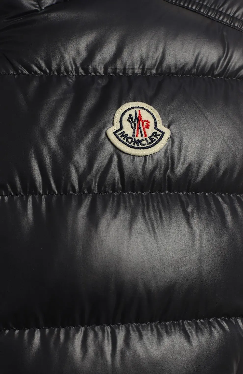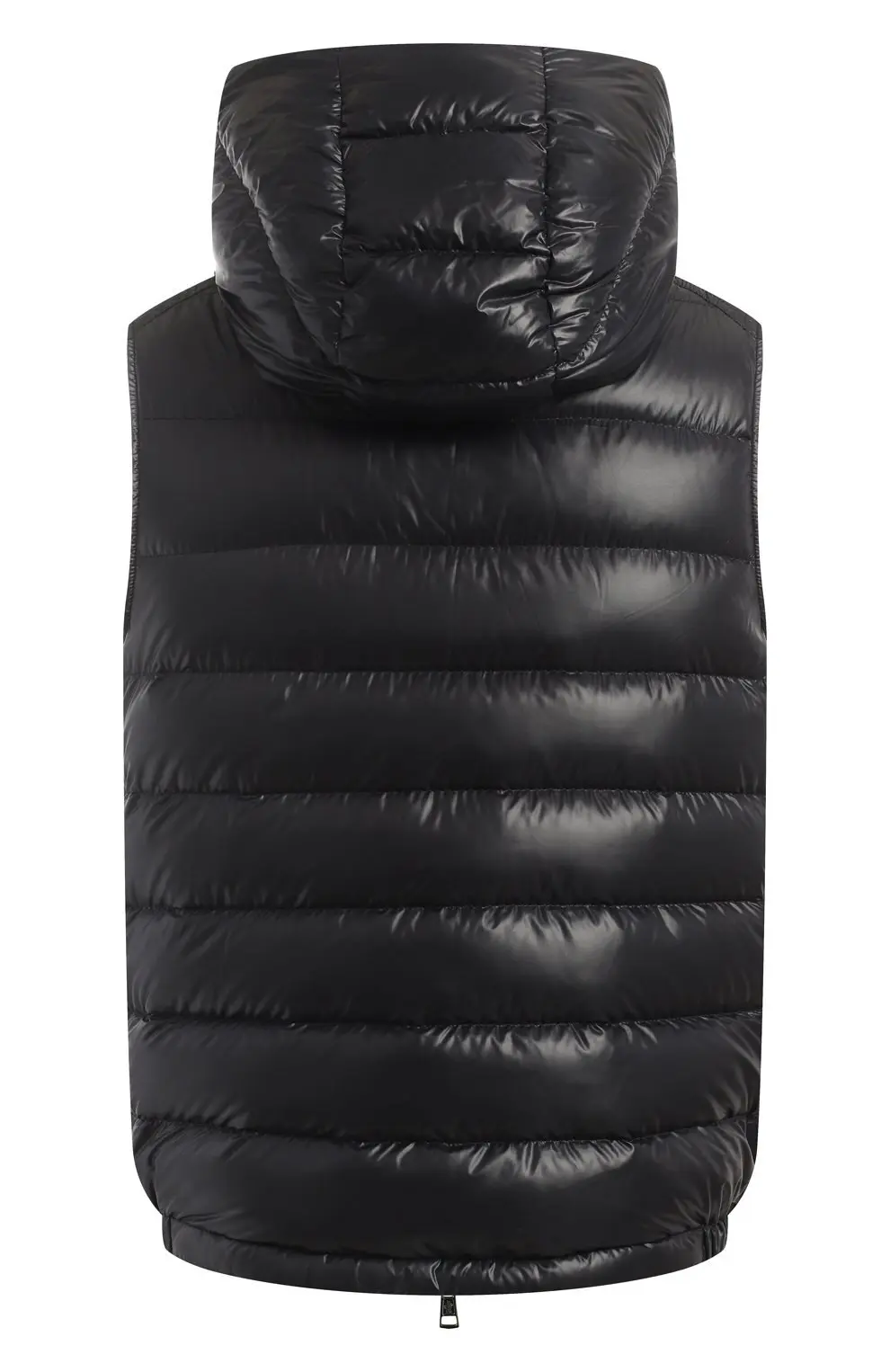 Жилет Moncler выполнен из лёгкого, но прочного материала с пуховым наполнением. Чёрный цвет, горизонтальная стёжка и лаконичный дизайн подчёркнуты фирменным логотипом на груди. Модель оснащена капюшоном и удобной молнией по центру, что делает её универсальной для повседневного и спортивного образа.