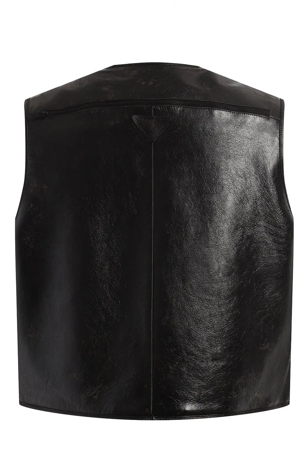Кожаный жилет Prada выполнен из фактурной черной кожи с легким винтажным эффектом, что придает изделию характерный брутальный шарм. Функциональный дизайн подчеркивают многочисленные накладные карманы с клапанами и молниями, а также декоративные металлические детали. Модель на молнии сочетает в себе практичность и выразительный стиль, отражая современное прочтение утилитарной эстетики бренда.