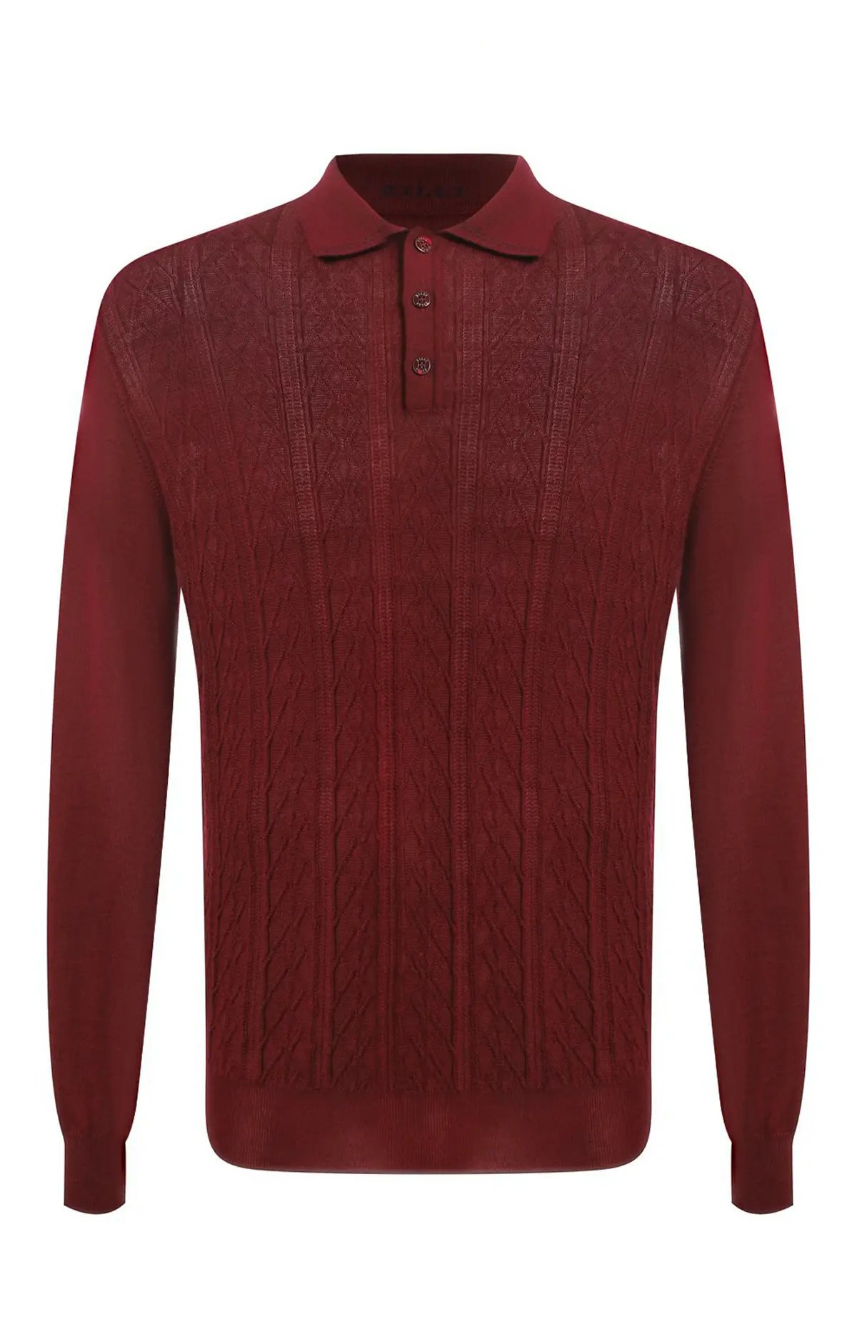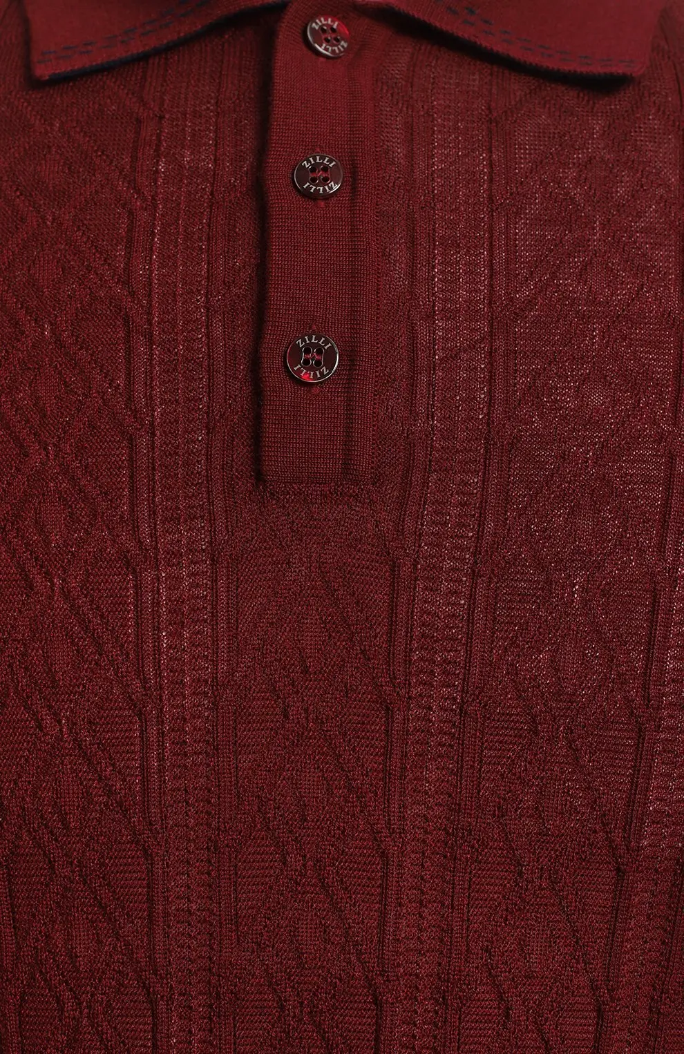 Поло Zilli из мягкого кашемира и шёлка глубокого бордового оттенка. Изделие выполнено в тонком трикотаже с изысканным ажурным узором и классическим воротником на пуговицах. Элегантный вариант для делового гардероба и повседневных образов, сочетающий комфорт и безупречный стиль.